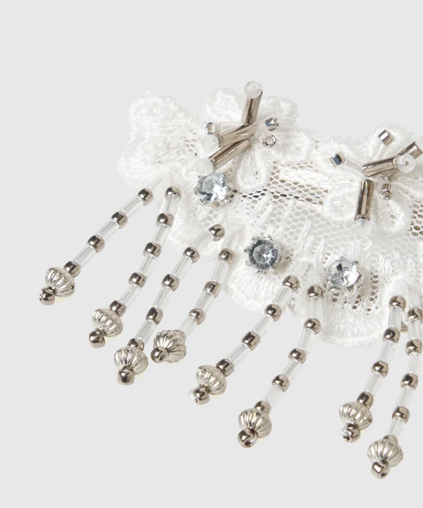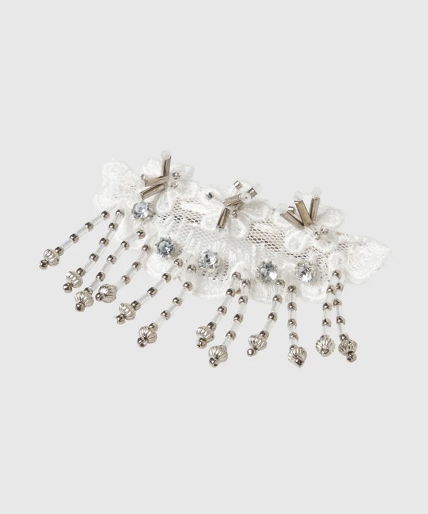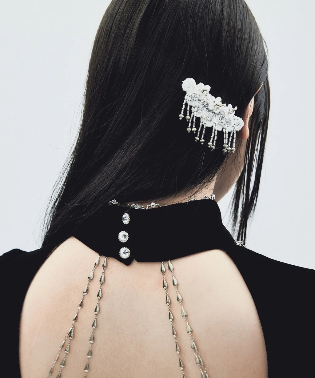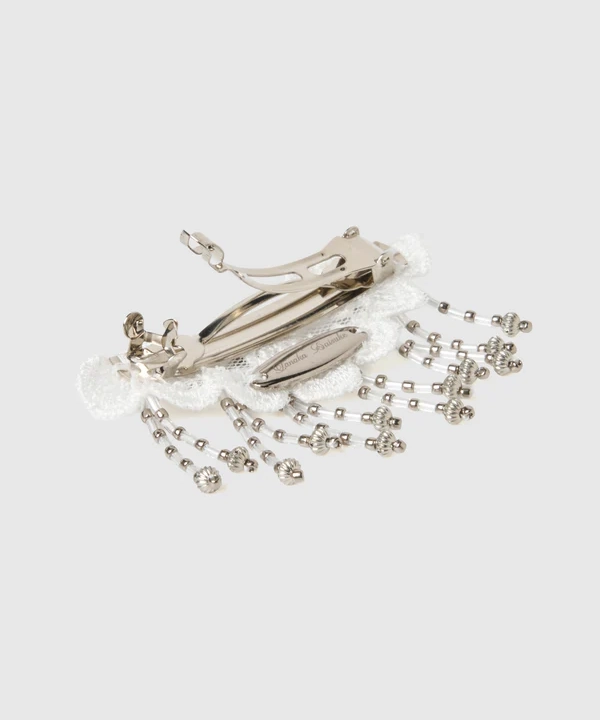 雪のように繊細なビーズ刺繍とレースが華やかにあしらわれたミニサイズのバレッタ。通常サイズより軽く、耳元にそっと華を添えたいときにぴったりです。左右どちらにも対応できるユニークなデザインも嬉しいポイント。特別な日のおしゃれにぜひ使いたくなる上品な一品です。