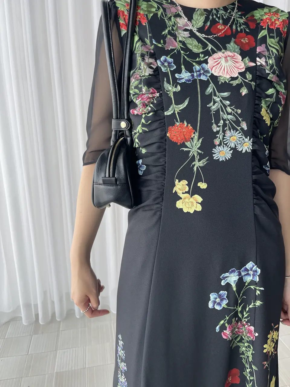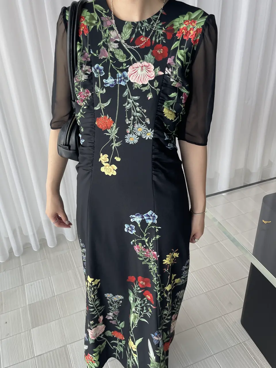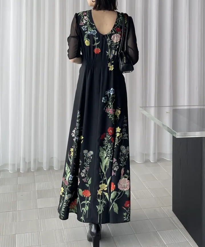 胸元から裾まで咲き誇るような花柄が目を奪う、存在感のあるドレスです。さらりとした高級感のある生地とギャザー使いが上品で、袖の透け感や後ろウエストのゴム仕様が軽やかさもプラス。着る人の動きに合わせて美しく広がるフレアラインは、特別な日にも日常にも華やぎを添えてくれます。