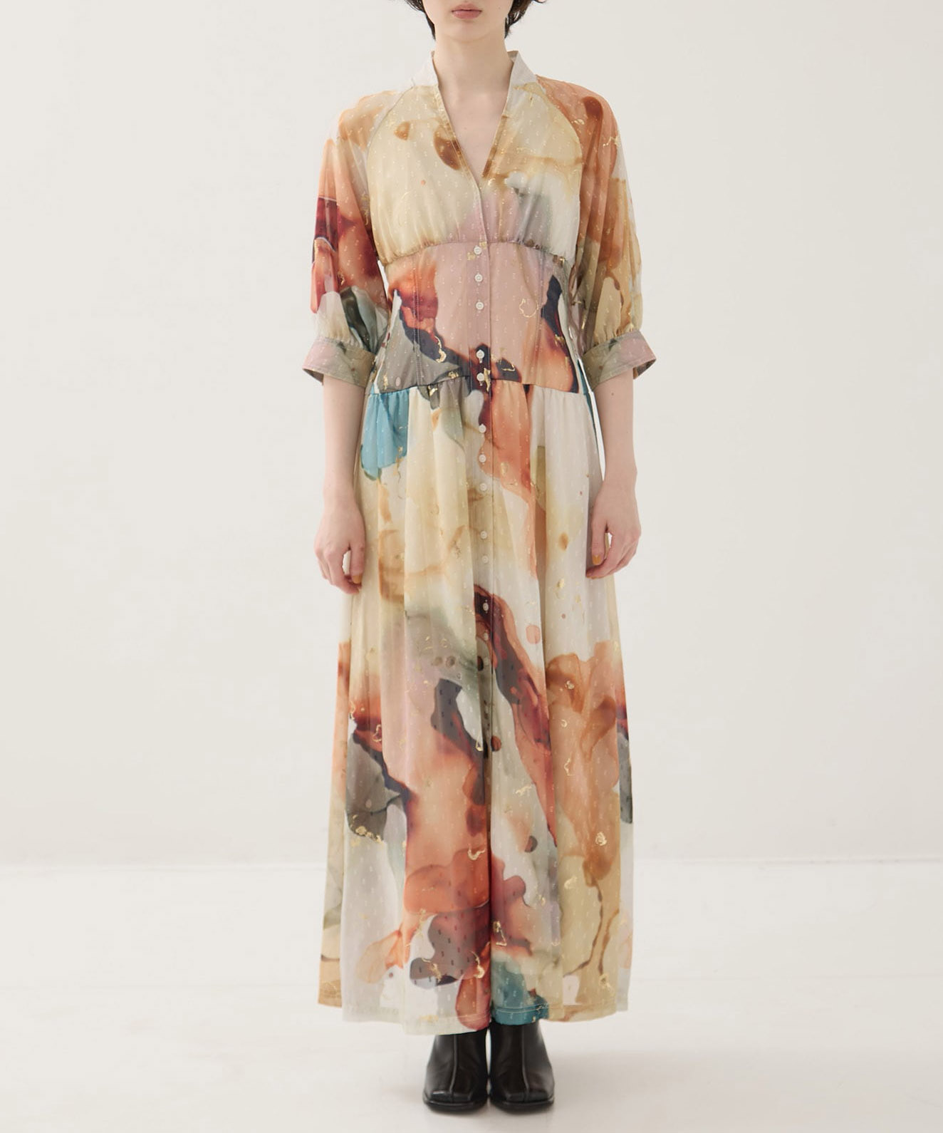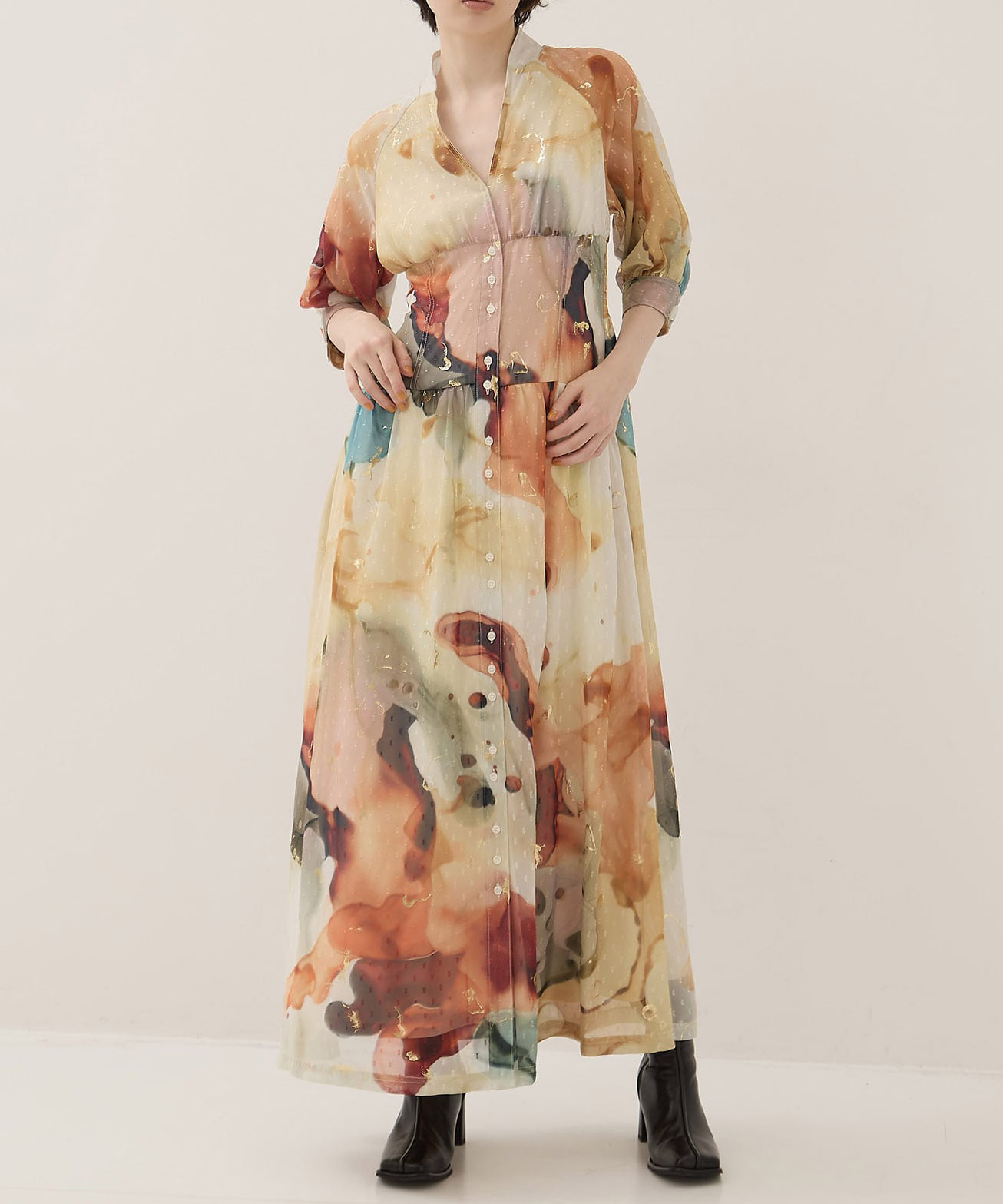 AMERI × STUDIOUSの別注「EX. Art Organdy Dress」。ブランドで人気の柄をリバイバルし、ウエストのコルセットデザインで縦ラインを強調。甘すぎないシャープさを宿したシルエットで、1枚で完成度の高いスタイルに。袖のみ透け感があり、身頃は裏地付き。伸縮性はなし。ケアはドライクリーニング推奨です。