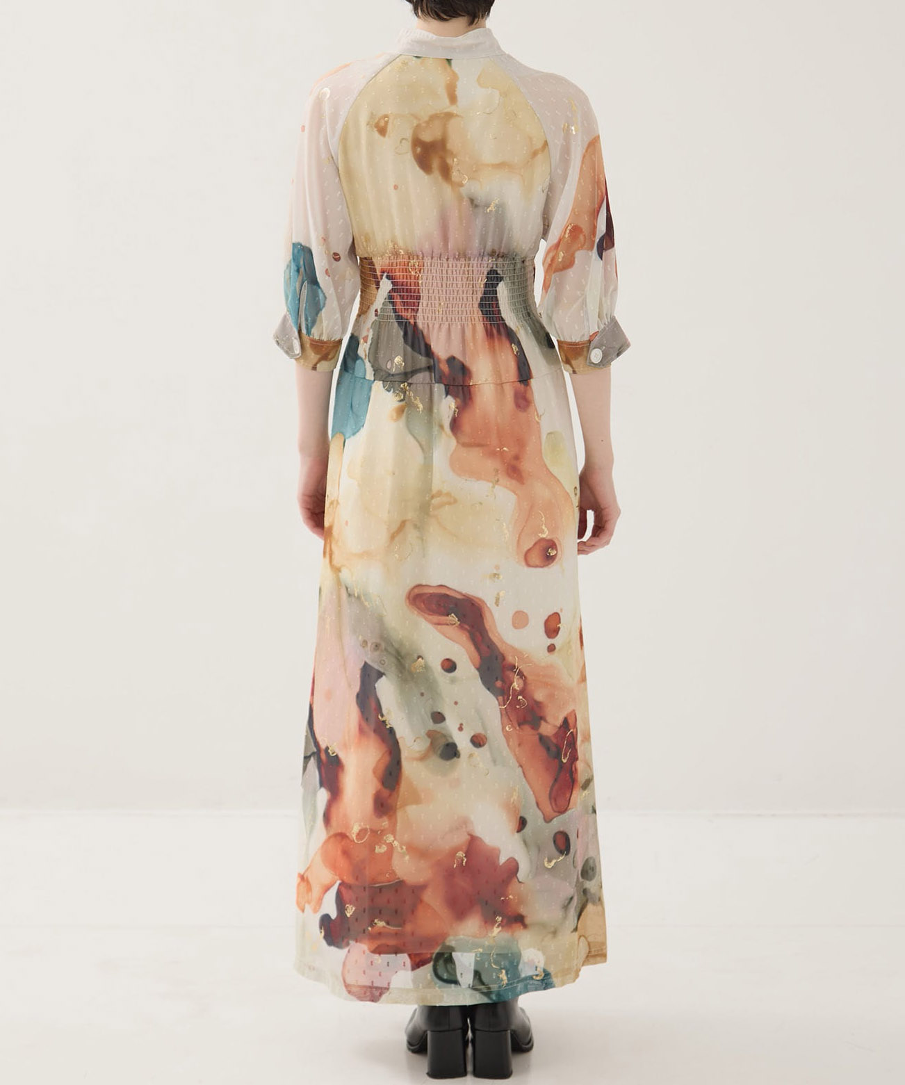 甘さを抑えたアート柄×コルセットディテールで、1枚でスタイルアップが叶うワンピース。袖はほんのりシアー、身頃は裏地付きで安心感も◎。アクセはミニマル、足元はパンプスからブーツまで幅広く。結婚式やホテルディナーなどの特別なシーンはもちろん、ジャケットを重ねて都会的なデイリードレスにも。