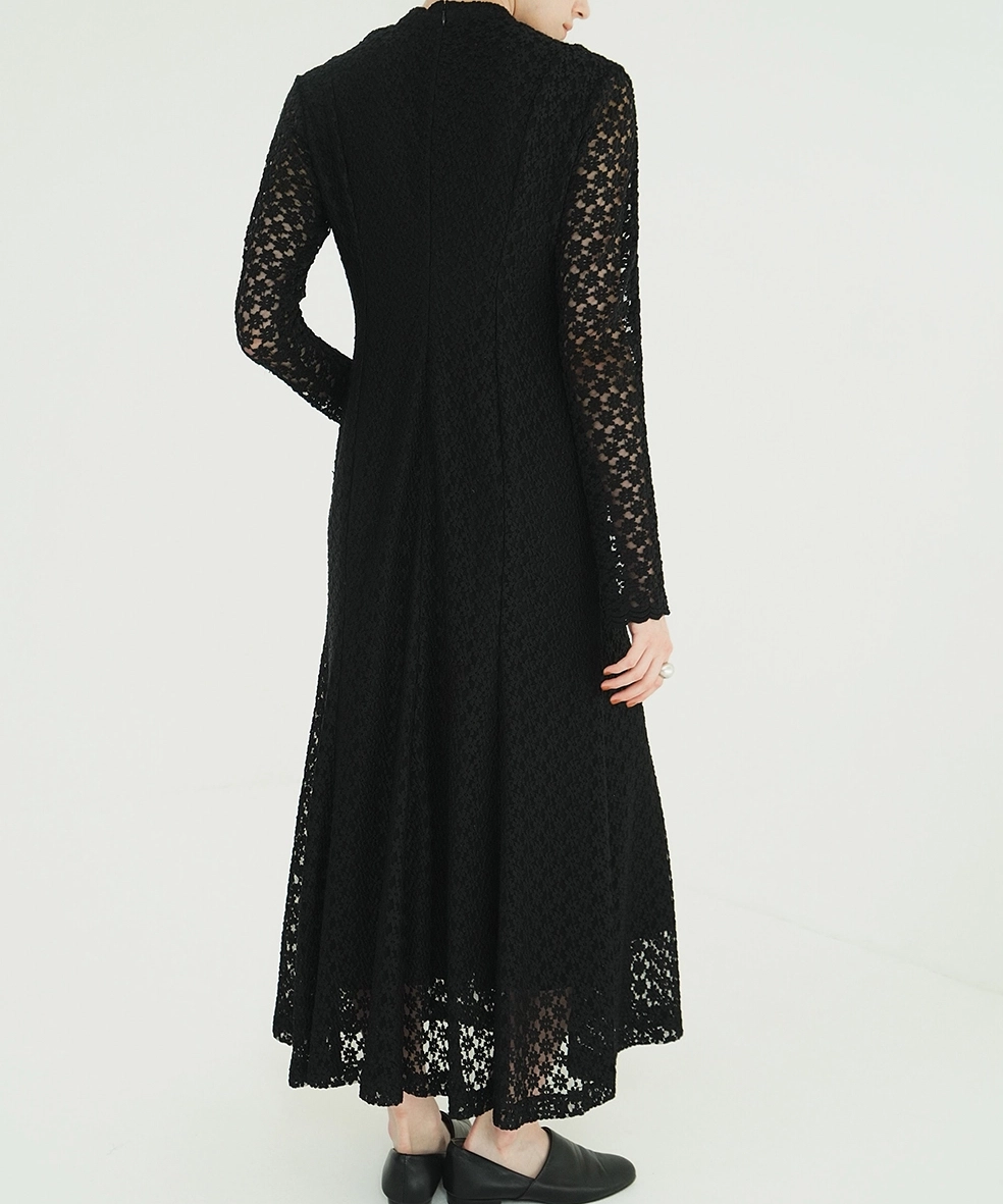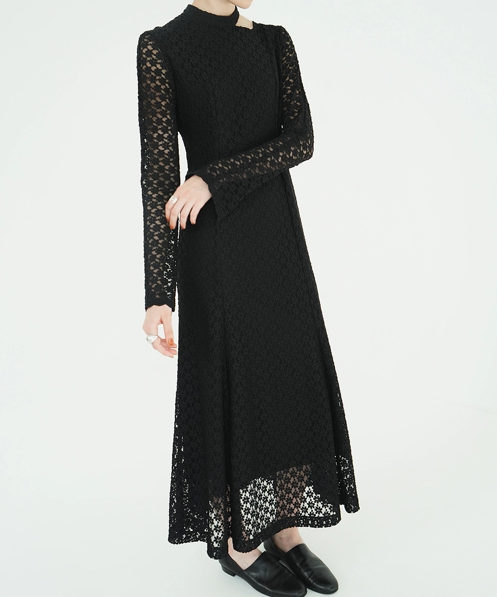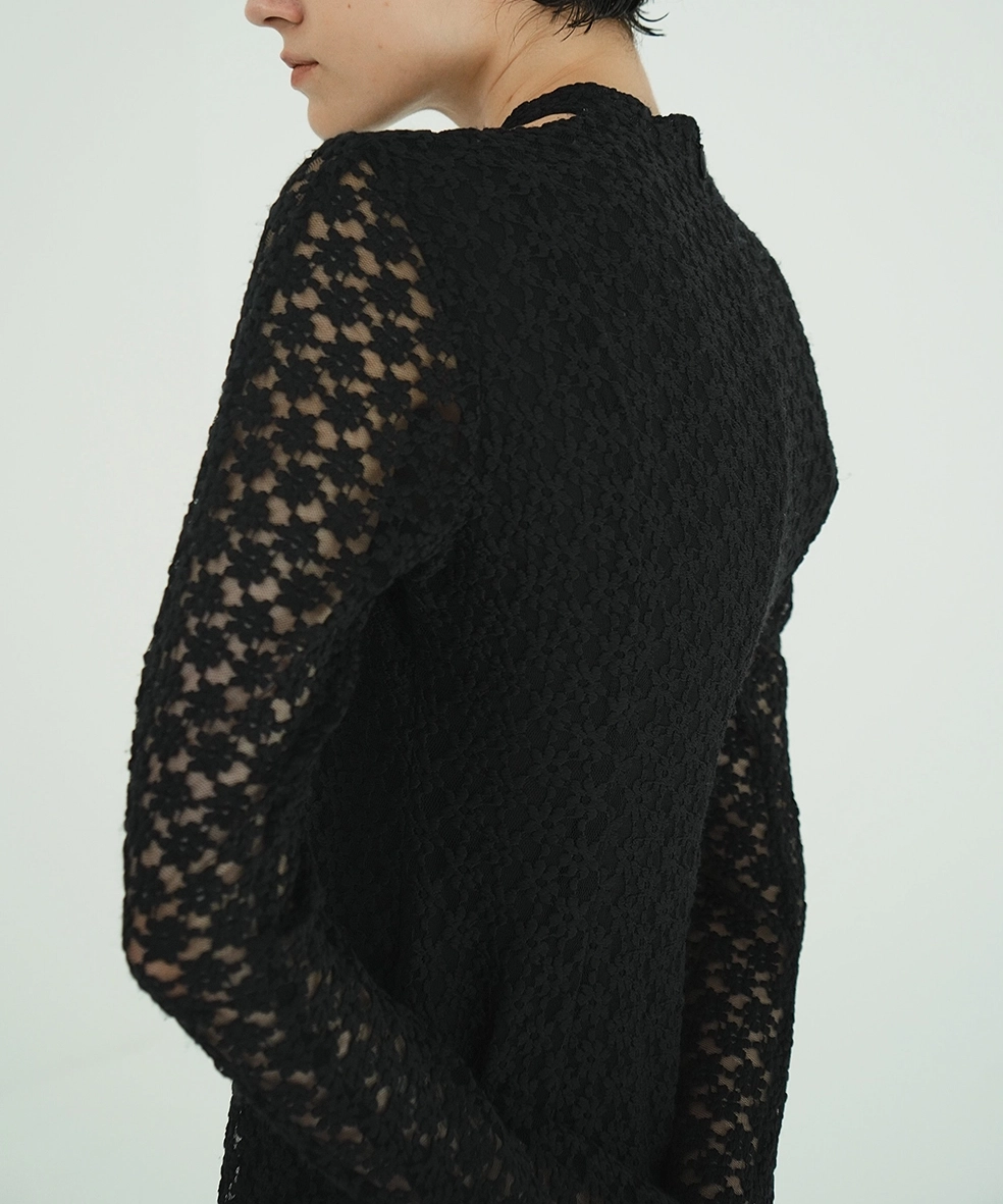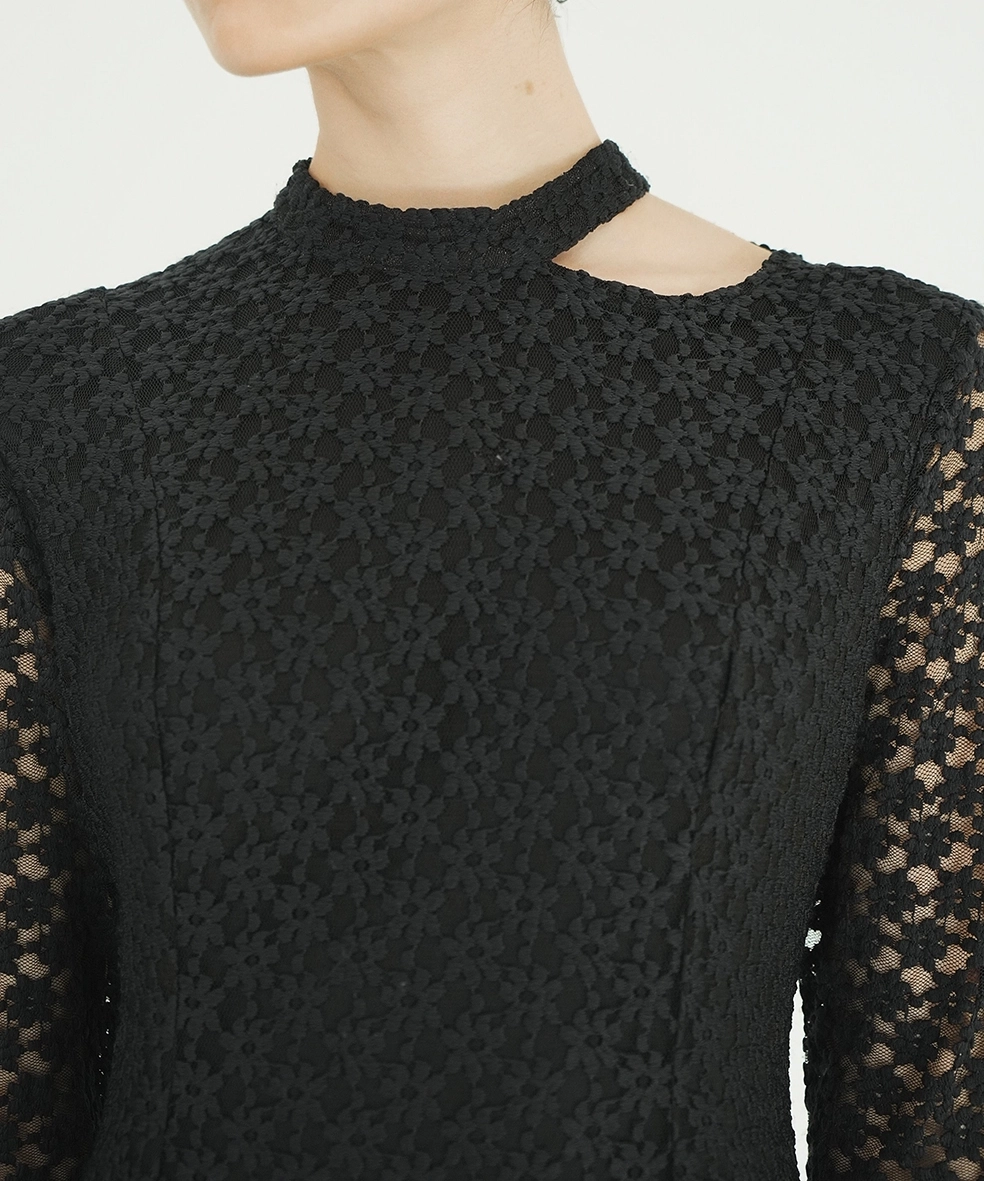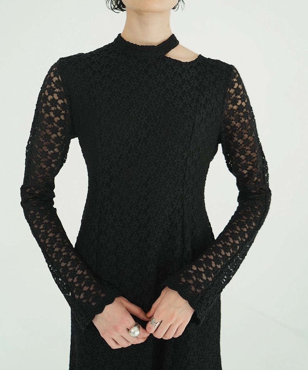 繊細な3Dフラワーレースが主役。肌がうっすら透けるレースの軽さに対して、シルエットは体の線を拾いすぎず上品。手元を美しく見せる長めのスカラップ袖とスリット、デコルテをきれいに見せるスラッシュネックで、写真映えと実用性のバランスが良いです。BLACKはシック、MIXは柄の立体感が際立ちます。
