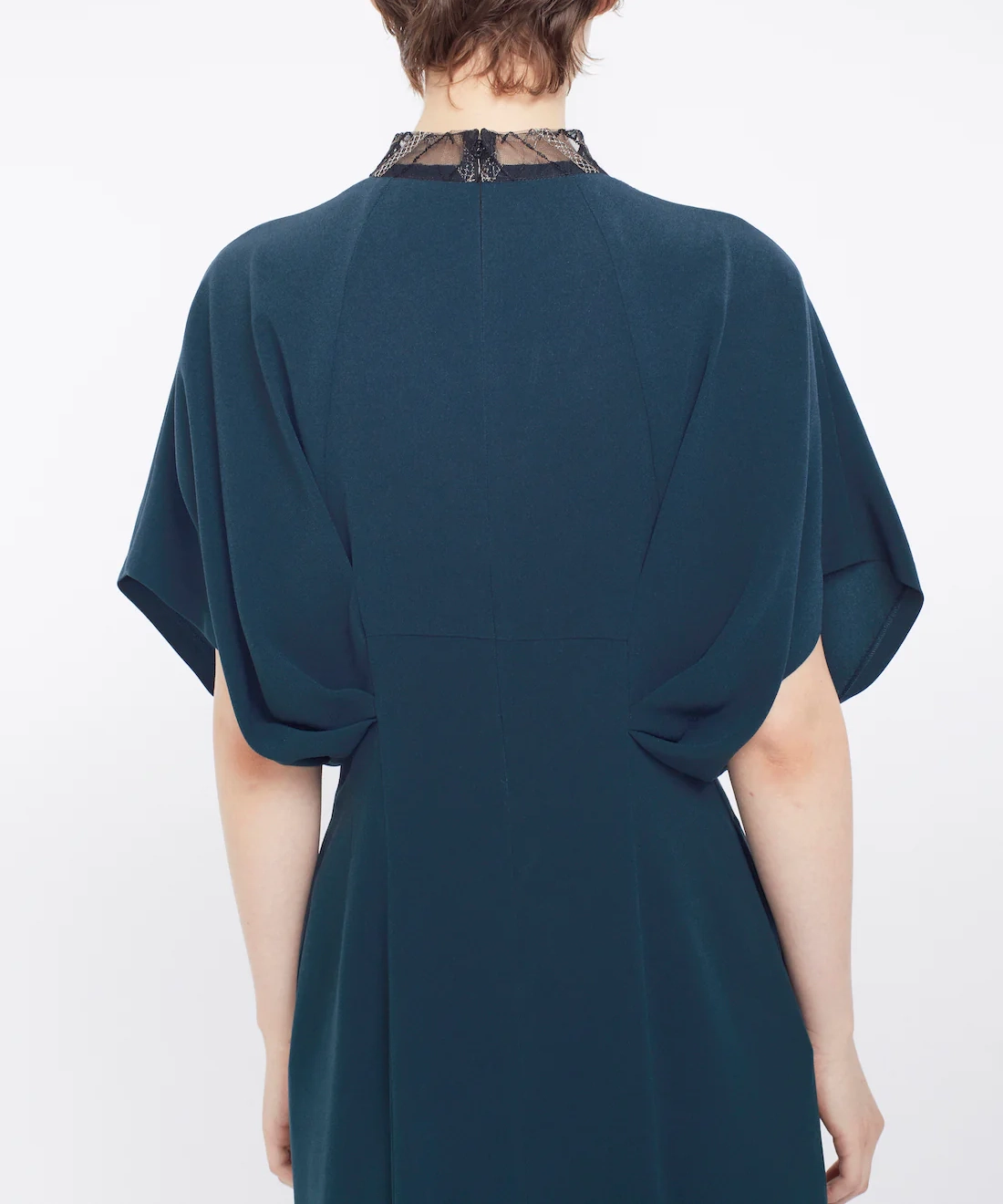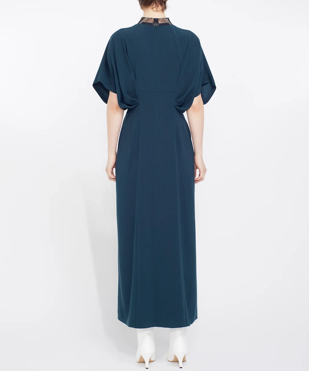 Classic lace dress(Green)。デザイナーによる手描きデザインをもとにしたオリジナル刺繍レース。ケープショルダー風の肩まわり、程よくシェイプしたウエストから裾へ流れるエレガントなAライン。総裏地仕様で安心して着用できます。コレクションテーマは“GLEAM(淡いきらめき)”。