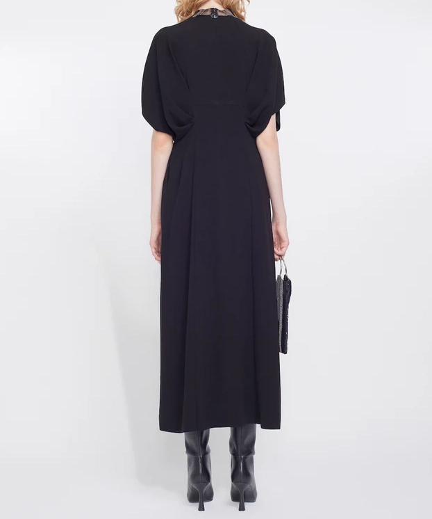 フリージアのモチーフを総刺繍で描いた一枚。縦ラインの切り替えと緩やかなAラインでスタイルアップが叶います。脇ポケット付きで実用性も◎。華奢なジュエリーや細ベルトで表情を変えて、ドラマチックなオケージョンに。