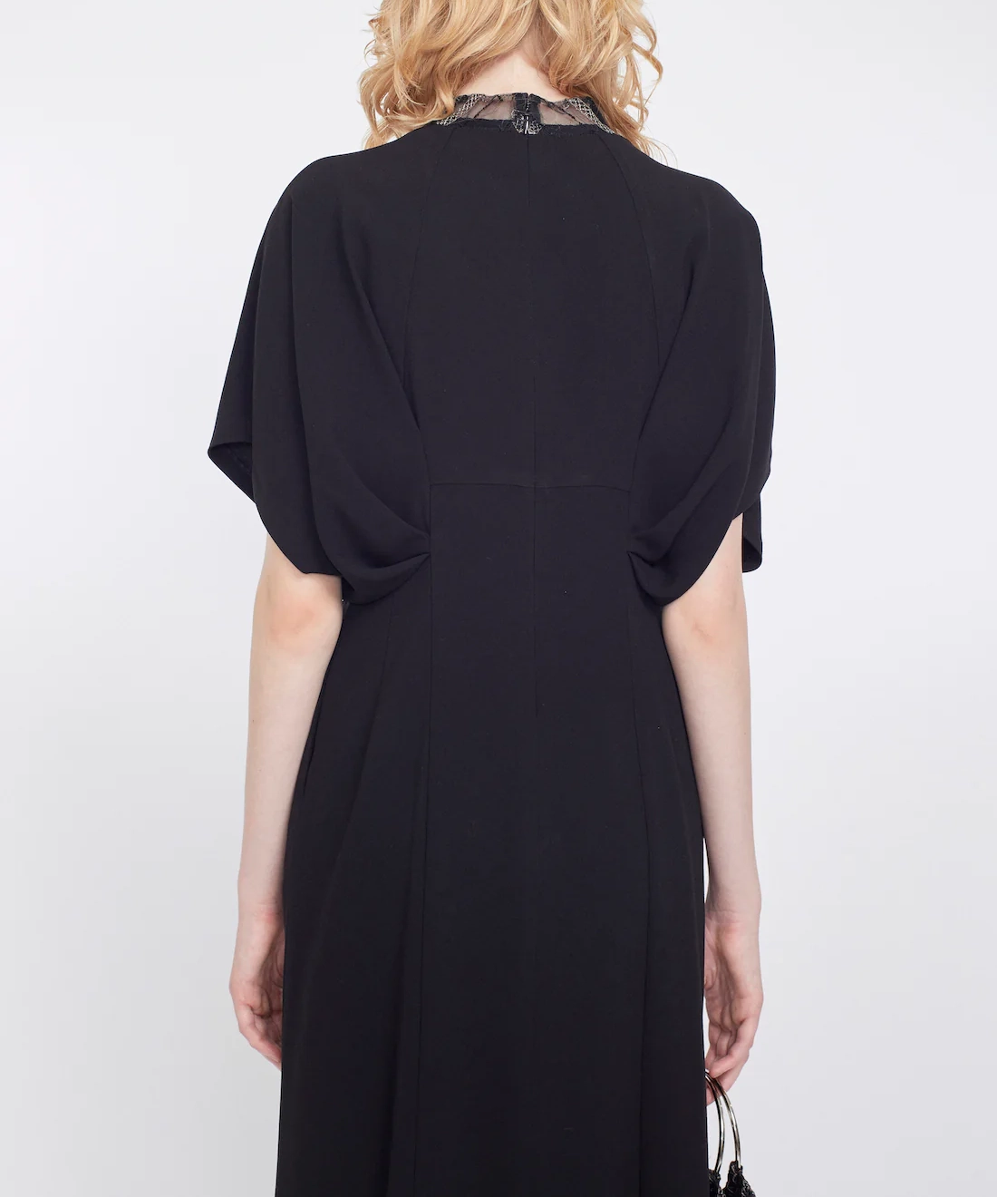 Classic lace dress(Green)。デザイナーによる手描きデザインをもとにしたオリジナル刺繍レース。ケープショルダー風の肩まわり、程よくシェイプしたウエストから裾へ流れるエレガントなAライン。総裏地仕様で安心して着用できます。コレクションテーマは“GLEAM(淡いきらめき)”。