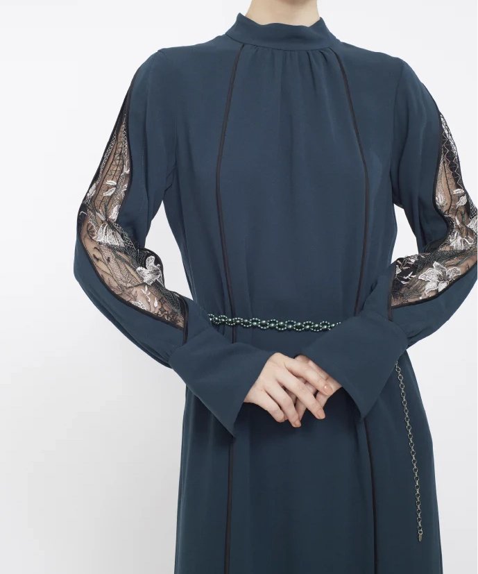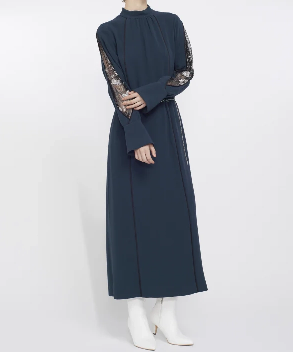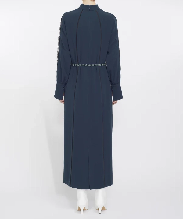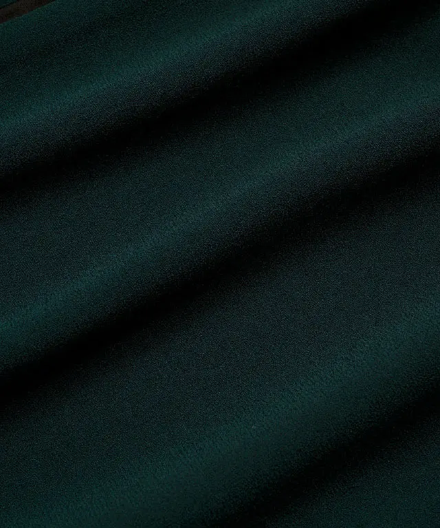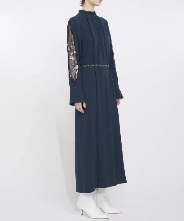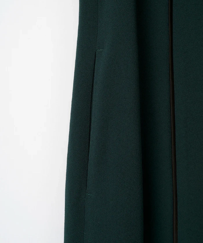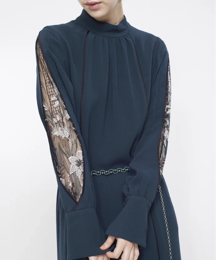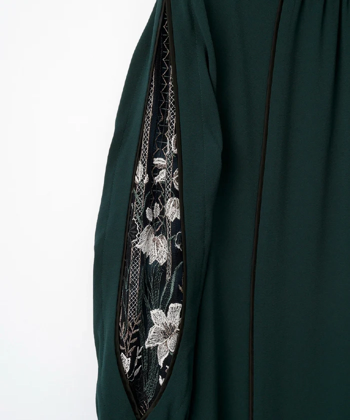 蕾を包むように立体感を出したペタルスリーブが主役。落ち着いたストレートシルエットに、フリージアのオリジナル刺繍レースが映えます。土台生地は発色の良いアセテートで、式典やパーティーなど“きちんと感”が求められる場に最適です。