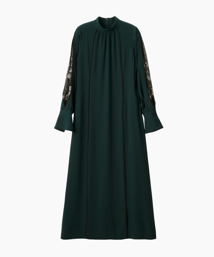 Petal sleeve lace dress(Green)。デザイナーの手描きから生まれたフリージア柄の刺繍レースを全面に配し、袖は花弁を重ねたようなカッティングで包み込むデザイン。穏やかなストレートシルエットが凛とした佇まいをつくります。2026SSのテーマ“GLEAM(淡いきらめき)”を表現した一着です。