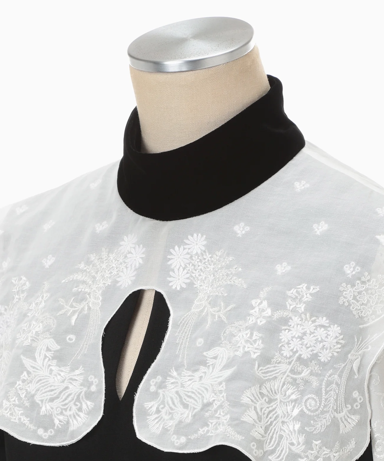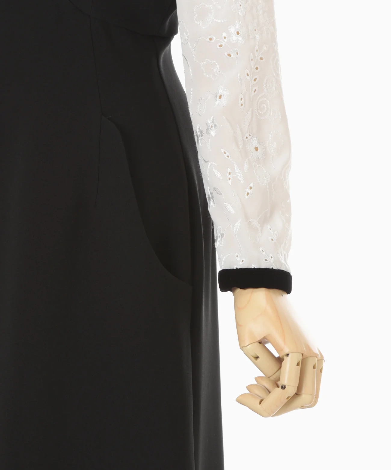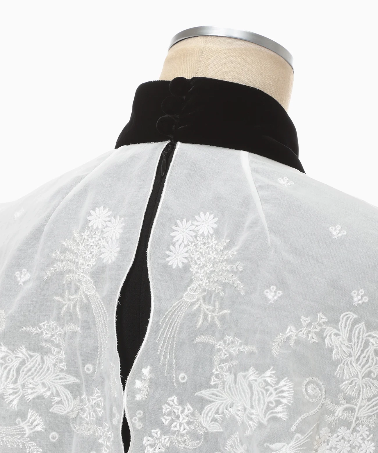 トリアセテート/ポリエステルのジョーゼットを採用し、発色の良さとストレッチ性、シワになりにくいイージーケア性を両立。袖は薄手シフォンに刺繍、襟はコットン×オーガンジーに繊細な刺繍を施し、首から肩にかけて華奢な印象を演出。シェイプしたウエストからまっすぐに落ちる生地感が縦のラインを強調し、スタイルアップを実現します。日本製。