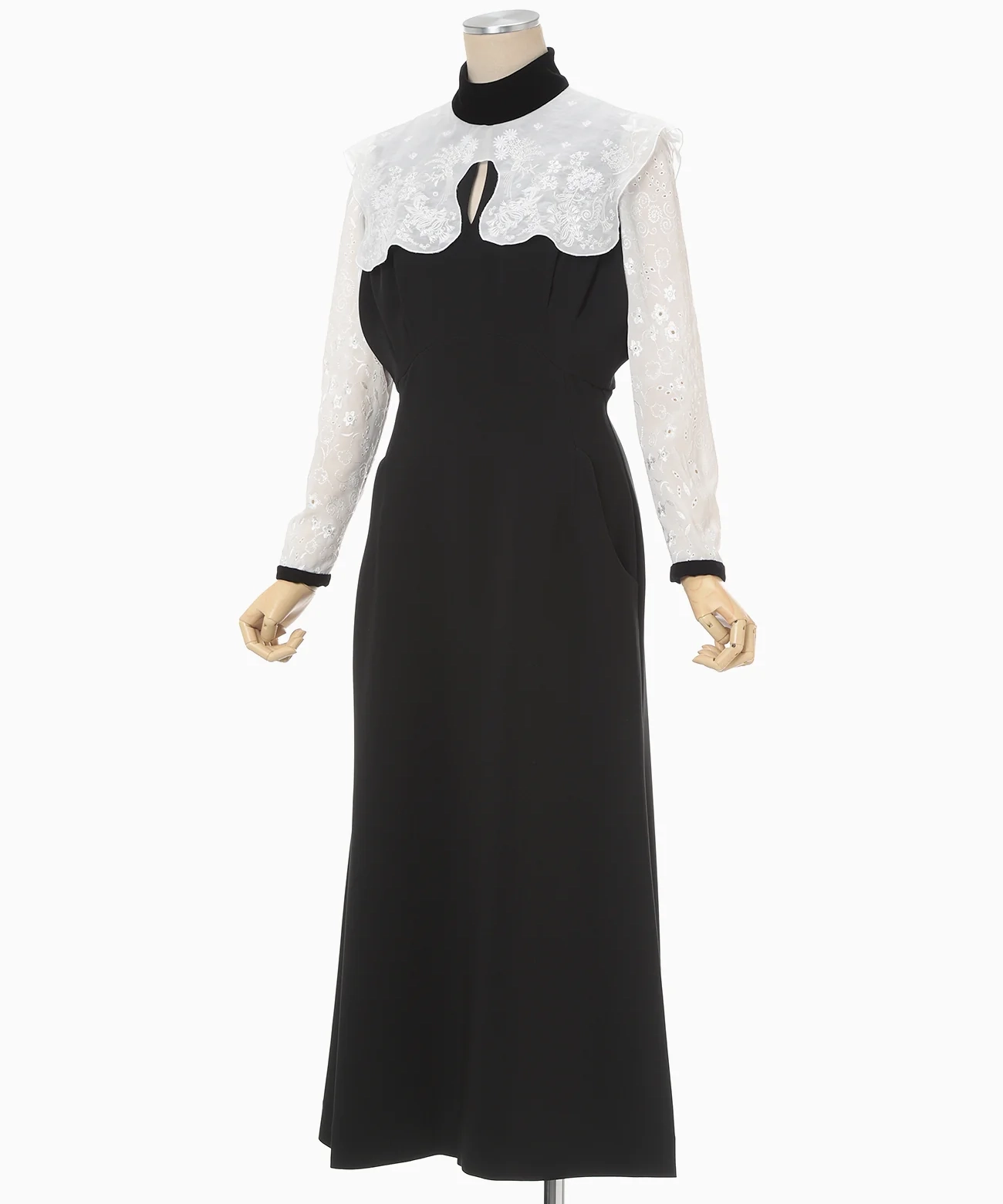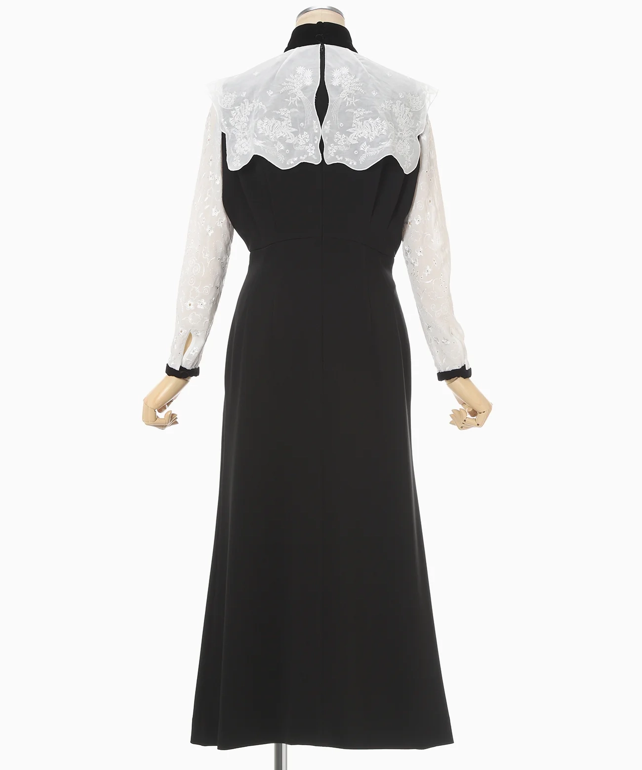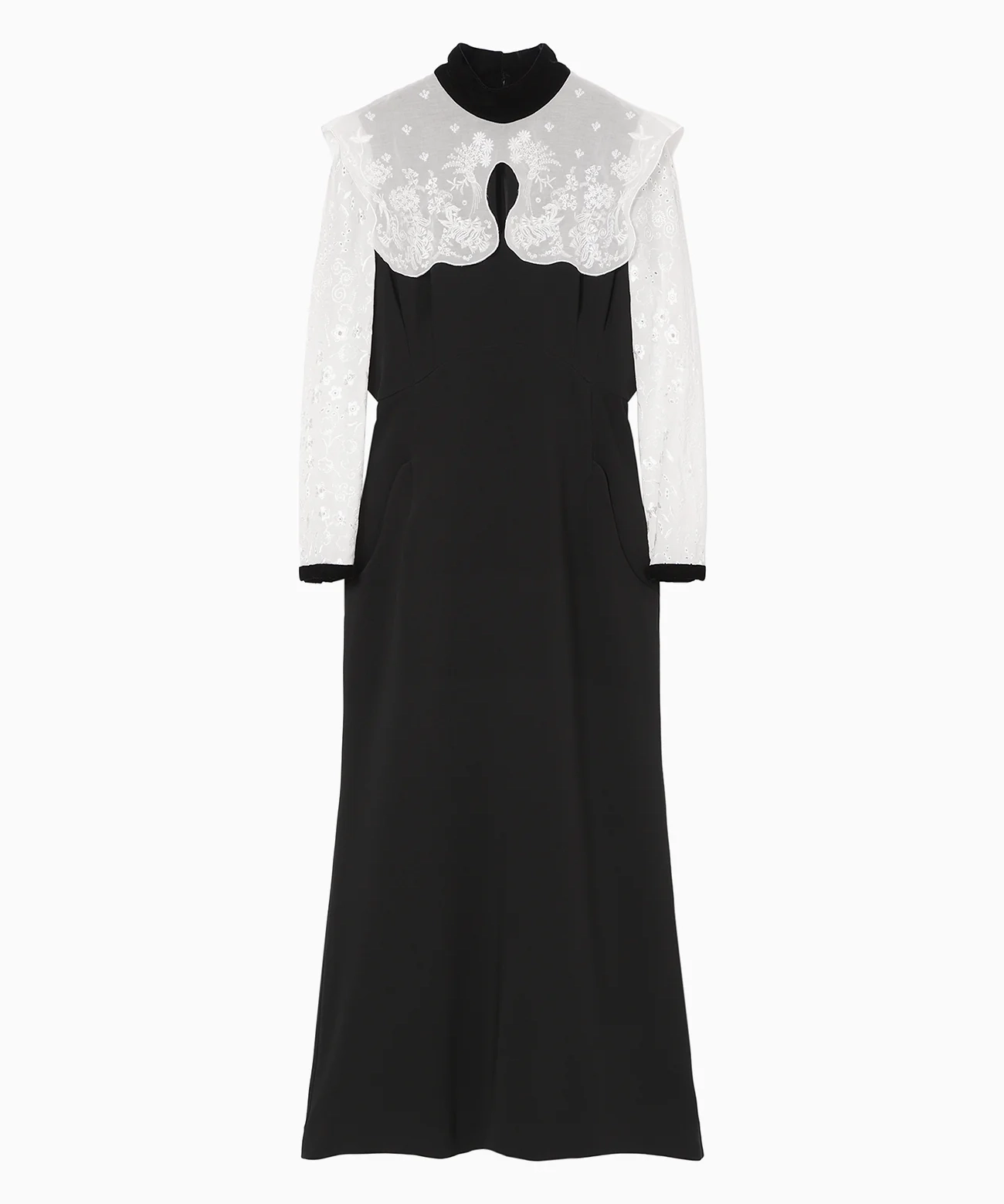トリアセテート/ポリエステルのジョーゼットを採用し、発色の良さとストレッチ性、シワになりにくいイージーケア性を両立。袖は薄手シフォンに刺繍、襟はコットン×オーガンジーに繊細な刺繍を施し、首から肩にかけて華奢な印象を演出。シェイプしたウエストからまっすぐに落ちる生地感が縦のラインを強調し、スタイルアップを実現します。日本製。