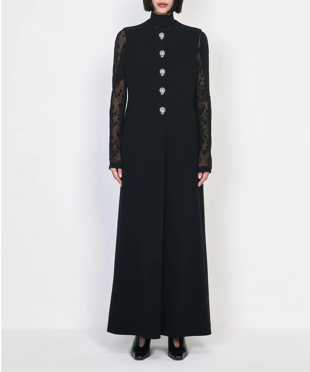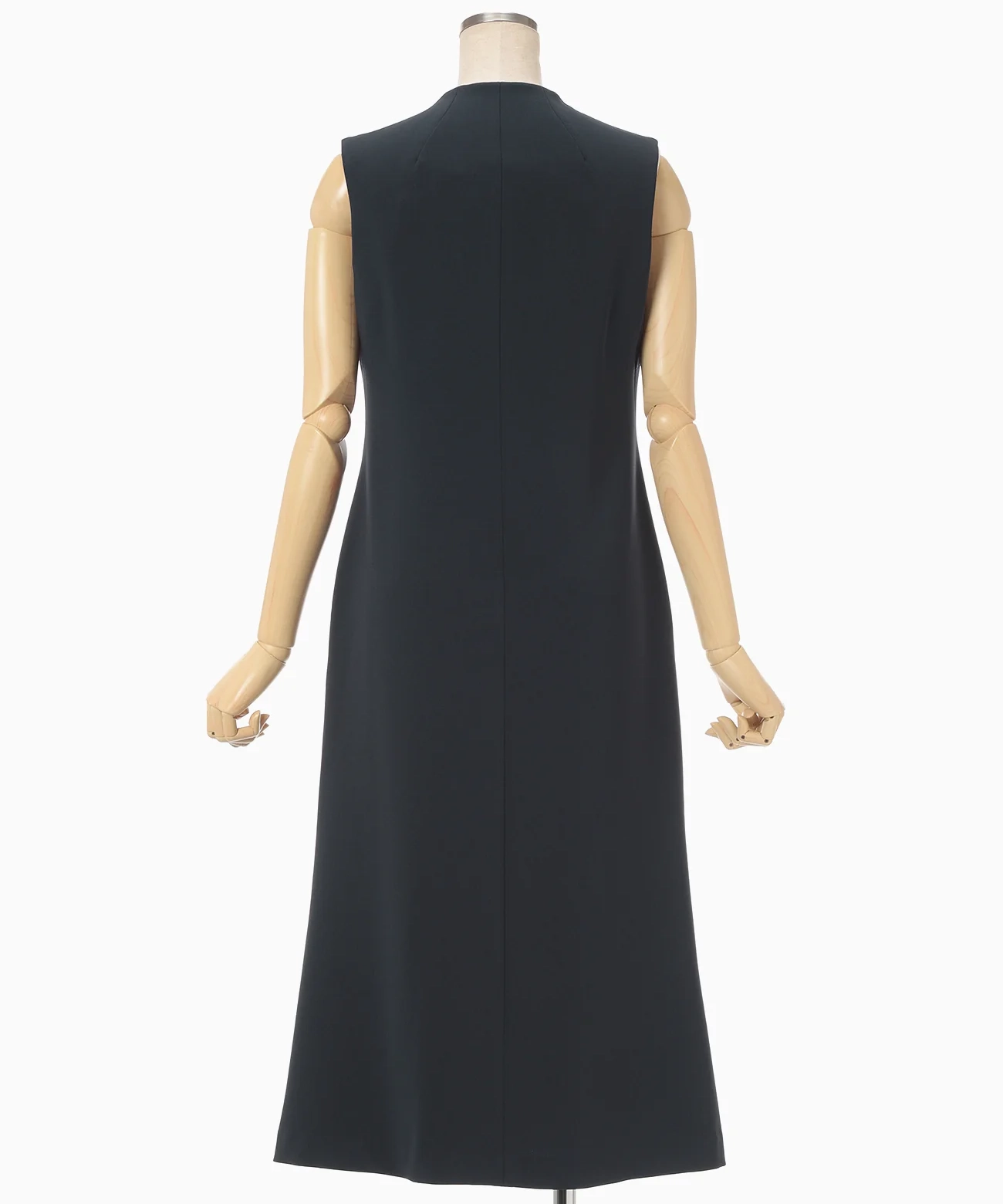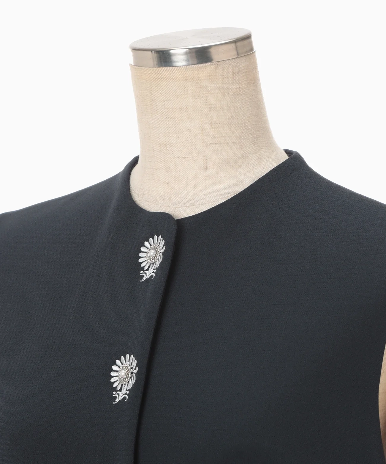 前立てに咲くように配された刺繍と小粒のパールボタンが、上半身を上品に印象づける一着。とろみと程よい厚みを備えた生地が身体に沿って落ち、ウエストから裾へすっと伸びるIラインが美しい。披露宴やセレモニー、レストランでの会食など幅広く活躍します。