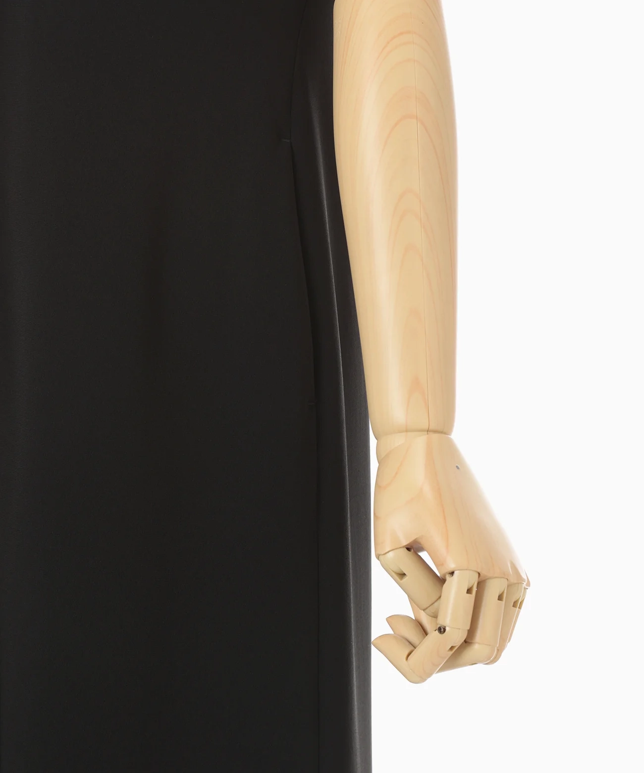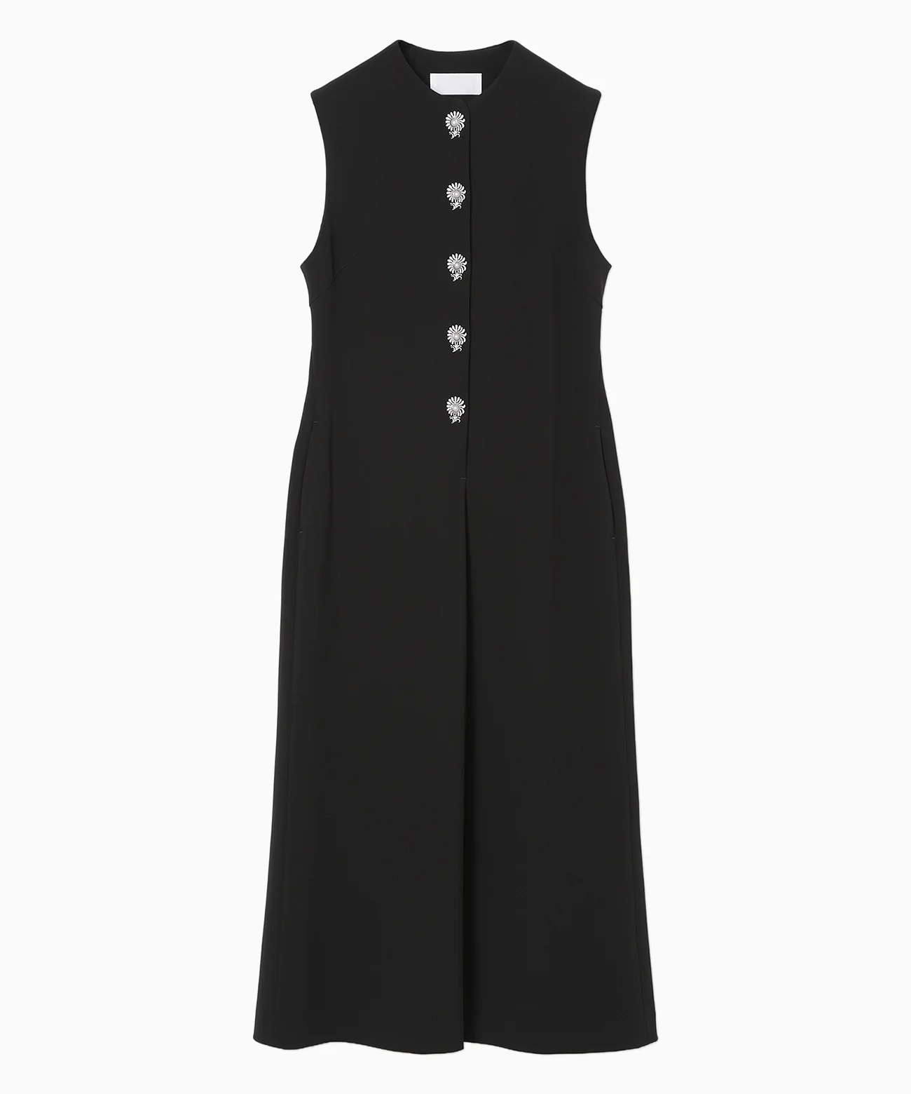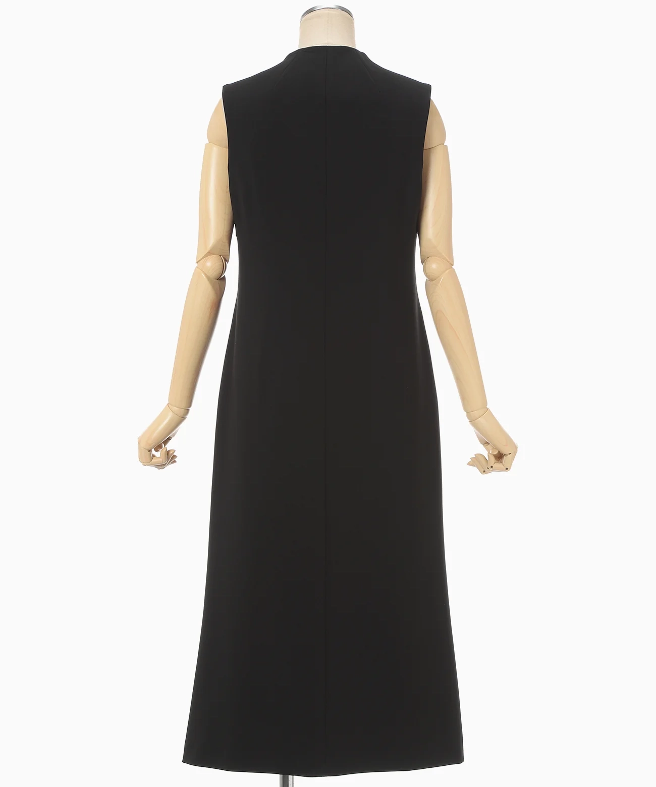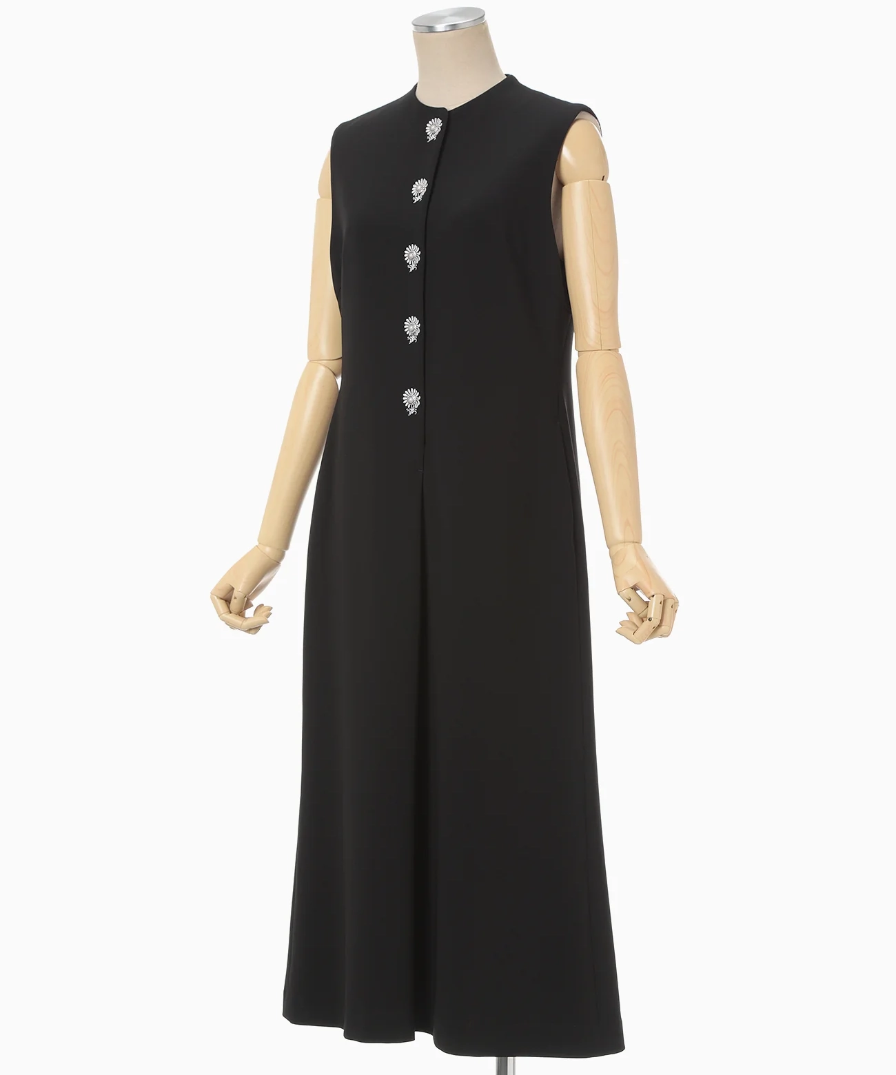 前立てに咲くように配された刺繍と小粒のパールボタンが、上半身を上品に印象づける一着。とろみと程よい厚みを備えた生地が身体に沿って落ち、ウエストから裾へすっと伸びるIラインが美しい。披露宴やセレモニー、レストランでの会食など幅広く活躍します。