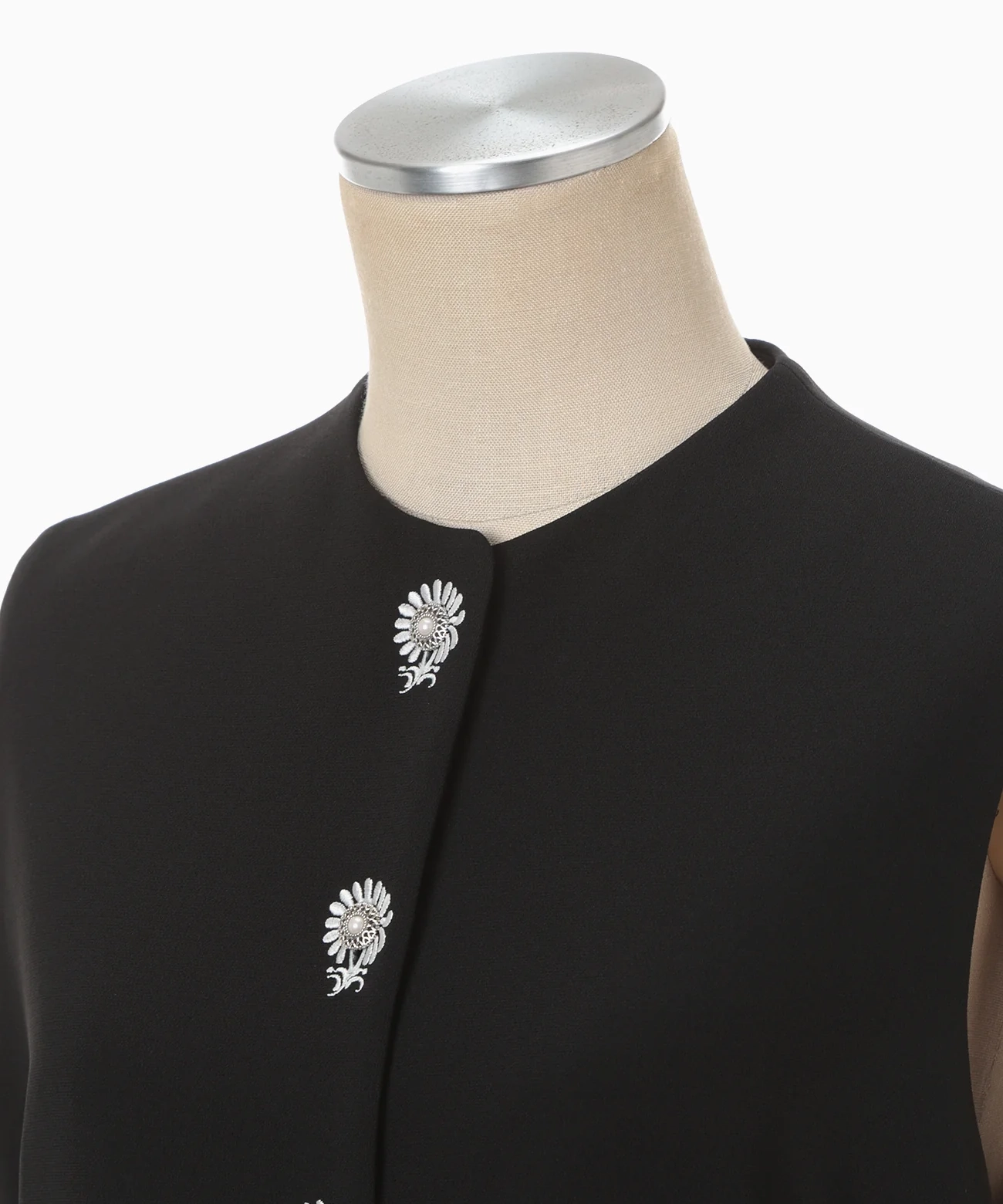 トリアセテート×ポリエステルの特殊仮撚加工糸による平二重組織生地を採用。シルキーな手触りとふくらみ感、シワになりにくい扱いやすさが特徴です。フロントはボタンホールにまで刺繍をあしらい、パールボタンの周囲に小花のような装飾を配置。ウエストからストレートに落ちるミニマルなスカートと落ち着いたカラーパレットで、季節やシーンを問わず着用いただけます。