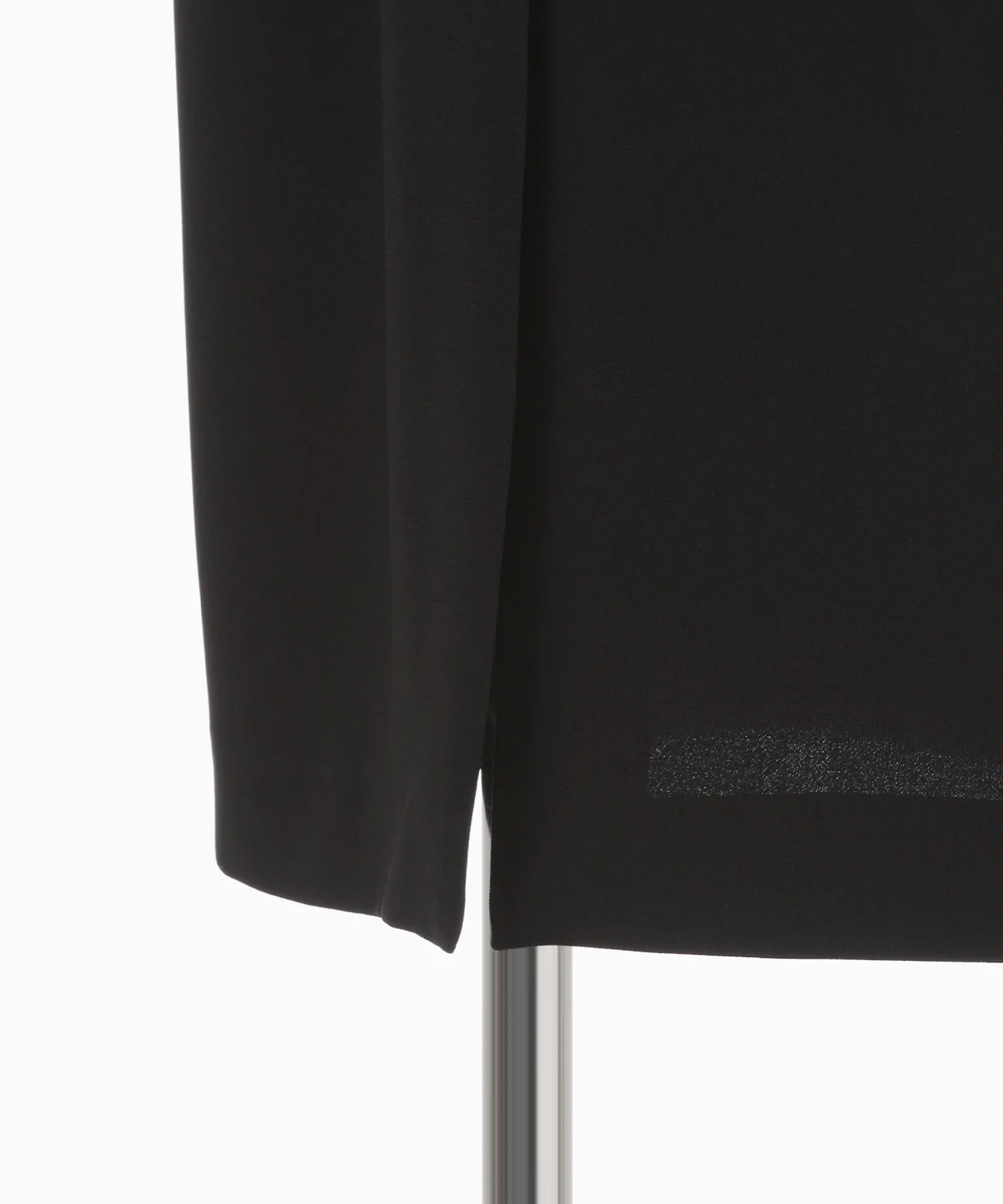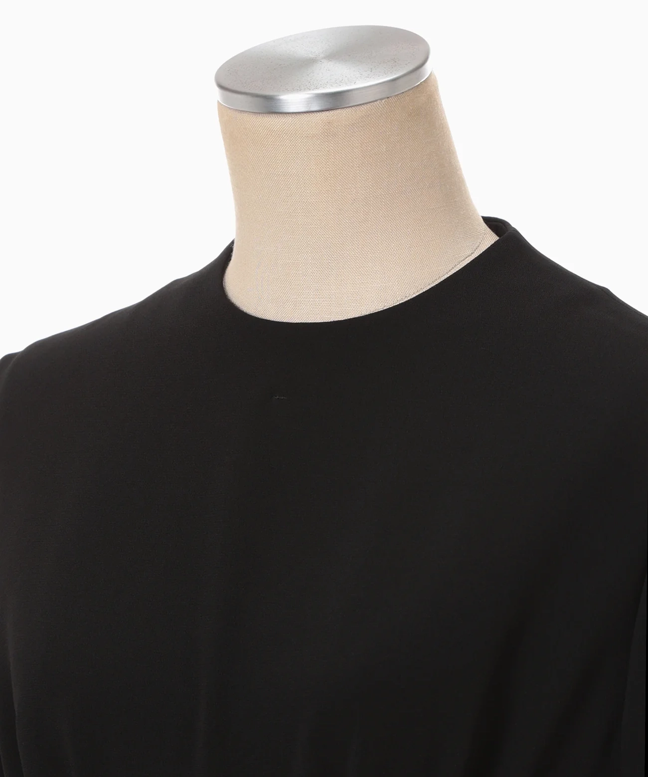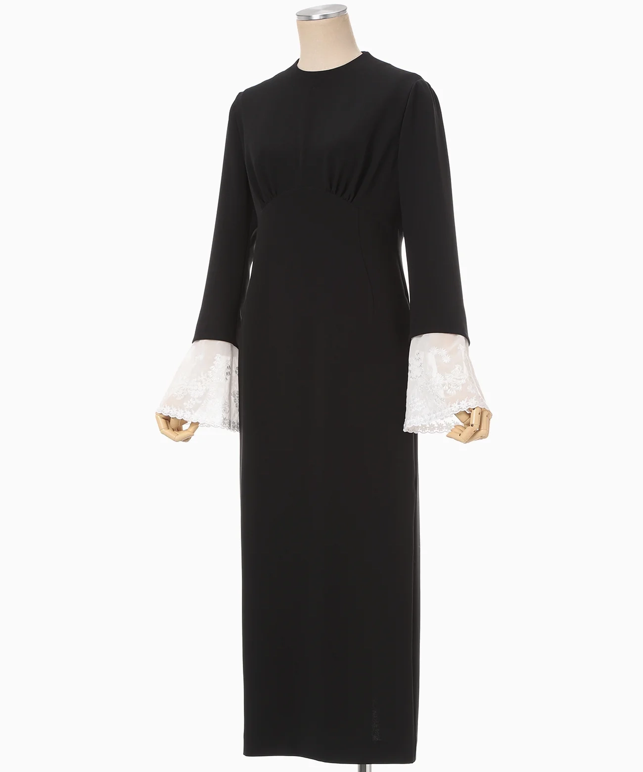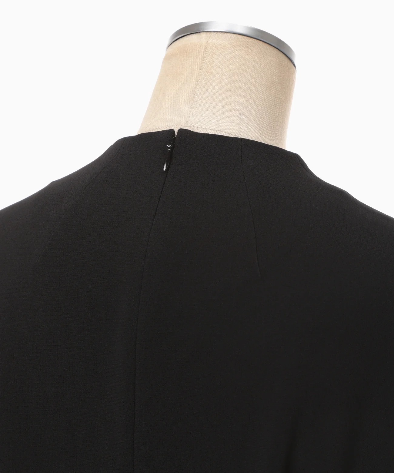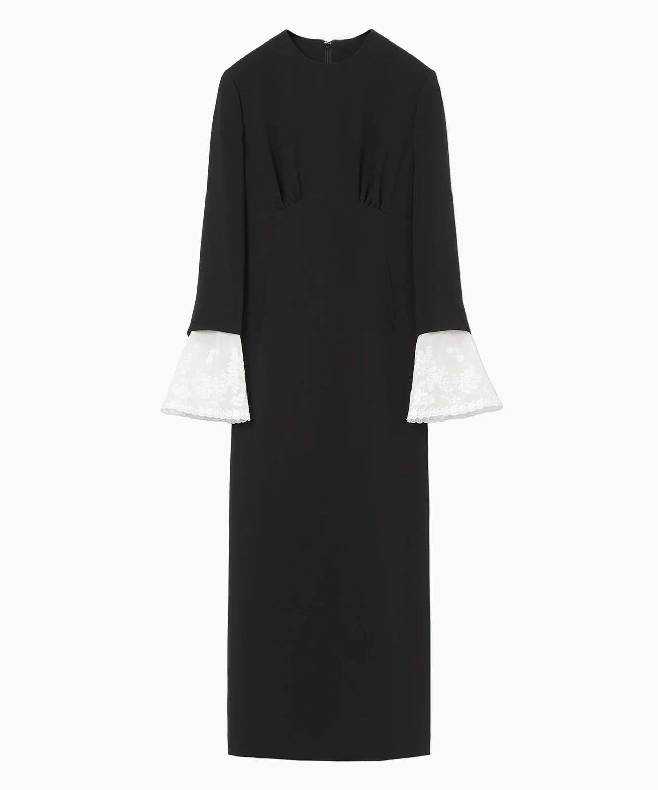 トリアセテートにポリエステルをブレンドしたジョーゼットを採用。ふくらみのある糸使いで発色が良く、ストレッチ性とイージーケア性を両立。ウエストを高めに設定したミニマルなIラインが縦のラインを強調し、スタイルアップを叶えます。袖口のレースカフスは着脱可能で、場面に応じたアレンジが可能です。日本製。