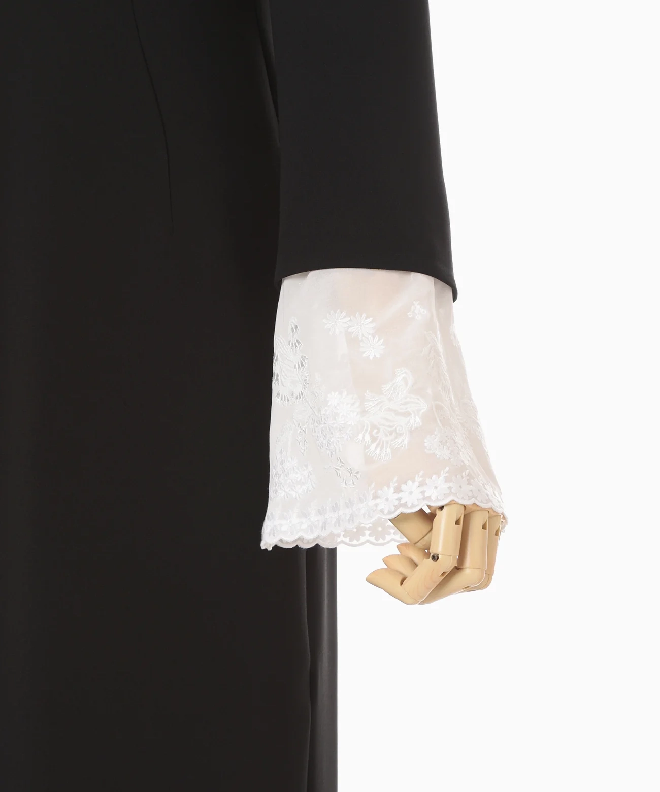 取り外し可能な刺繍カフスが手元の所作を美しく見せる、凛としたIラインドレス。高め位置でウエストをマークし、裾のスリットがほどよい抜け感をプラス。とろみがありつつシワになりにくい生地で、長時間のパーティーや移動のある日も快適に過ごせます。披露宴やセレモニー、ホテルディナーなどドレスアップ全般におすすめ。