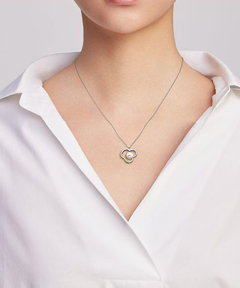 清らかに艶めくあこや真珠を、繊細な曲線で描いたフラワーモチーフが包み込む「chants」ペンダント。クリーンなホワイトゴールドの光が肌にすっと馴染み、日常からセレモニーまで上品に佇みます。胸元の中央に美しく収まる45cmチェーンで、一粒の気品をさりげなく。