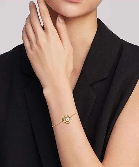 温かみのあるイエローゴールドが、可憐なフラワーモチーフに華やぎをプラス。一本でも重ねづけでも、手元に明るいムードを添えます。