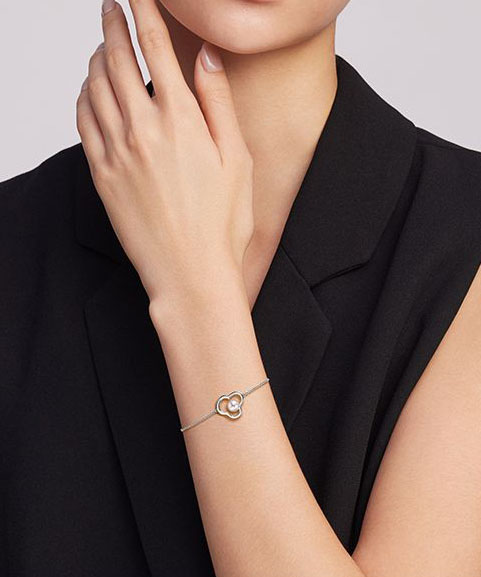 18Kホワイトゴールド×あこや真珠の「チャンツ」ブレスレット。全長約17cm(アジャスター約2cmを含む)で使い勝手が良く、トップは約縦13.5mm×横15.5mm、パールは約6.0mm。さりげない存在感で手元を上品に彩ります。