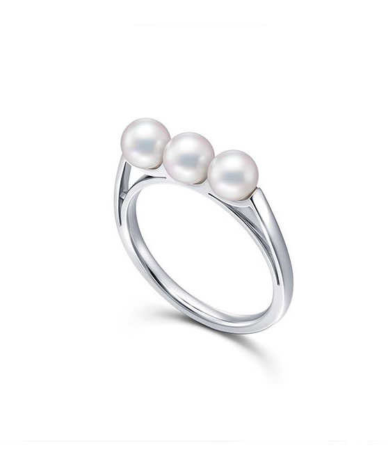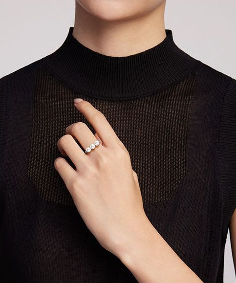 「balance light」リング。プラチナ×あこや真珠の端正なコントラストが魅力。パールは約4.5mmで、ミニマルなサイズ感が手元のコーディネートを選びません。