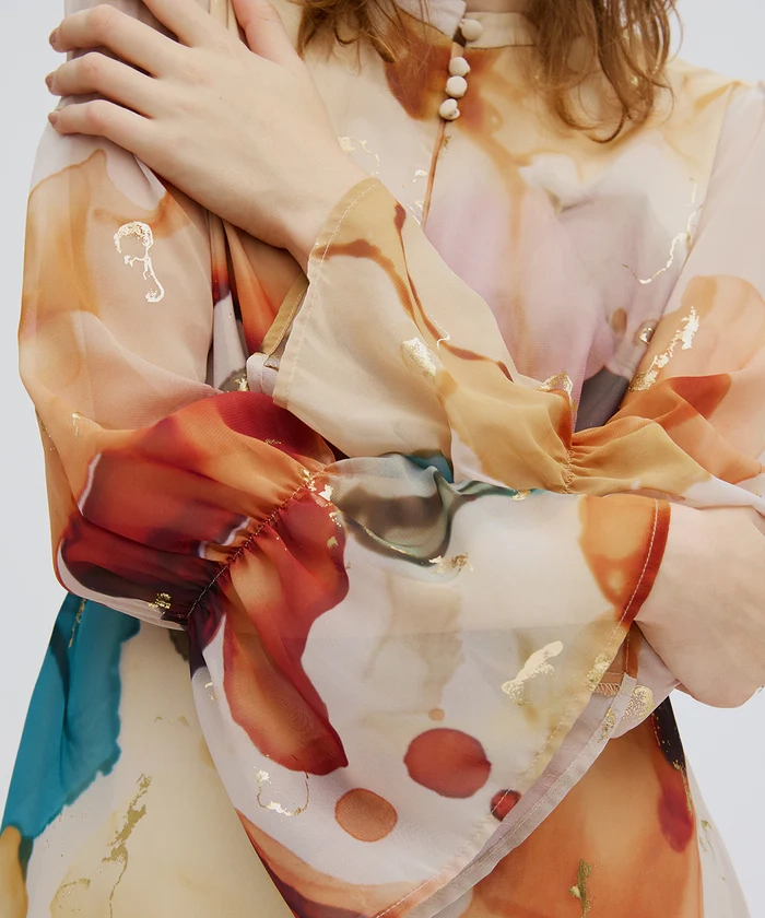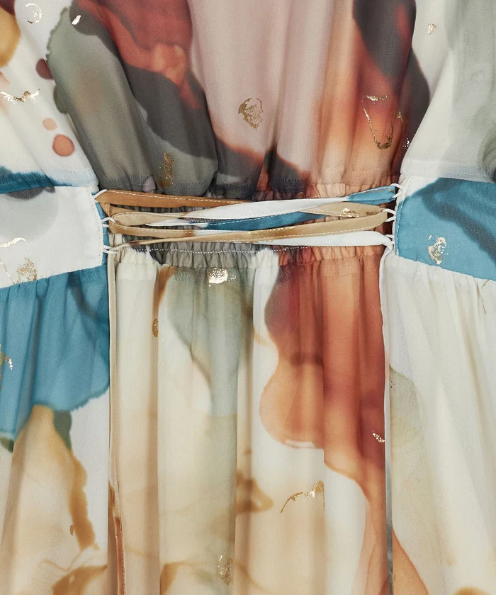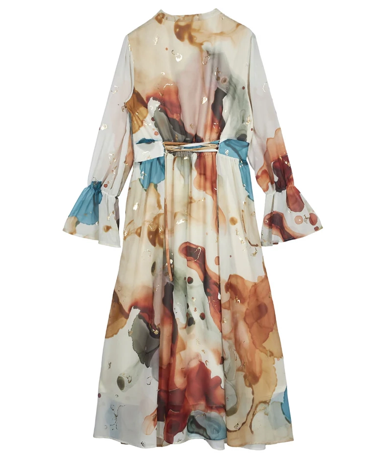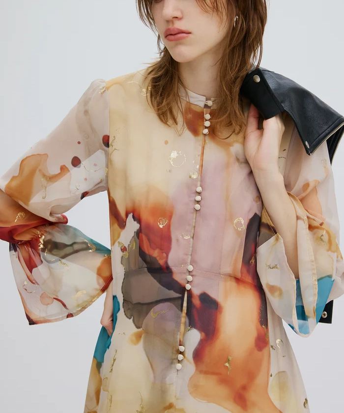 Ameriの人気ドレスが復刻。アルコールインクアート柄のワンピースでデザイン性が高く、金の箔プリントが華やかな印象のドレスです。ウエストのラインを変更することも可能なため、骨格タイプに関わらずご着用いただけます。商品特性上、目立たない糸つれがある場合がございます。予めご了承ください。