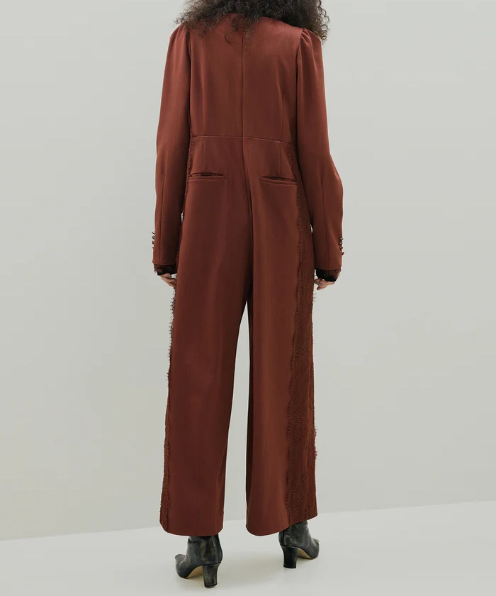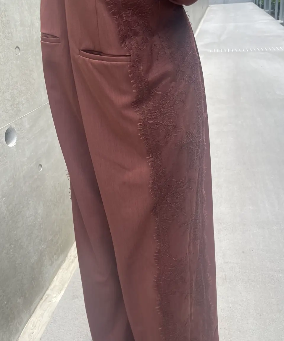 スーツ地をベースに、サイドや袖に太幅のレースを叩き付けた特別仕様。ゆったりとしたワイドシルエットでリラクシーな着心地を実現しながらも、レースの繊細なアクセントが抜け感と気品を両立。表情豊かなデザインに仕上げられており、裏地付き・透け感なし・伸縮性なしという仕様により、安心してきちんと感を保った装いが可能です。