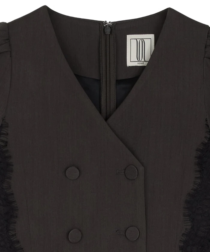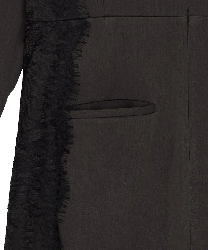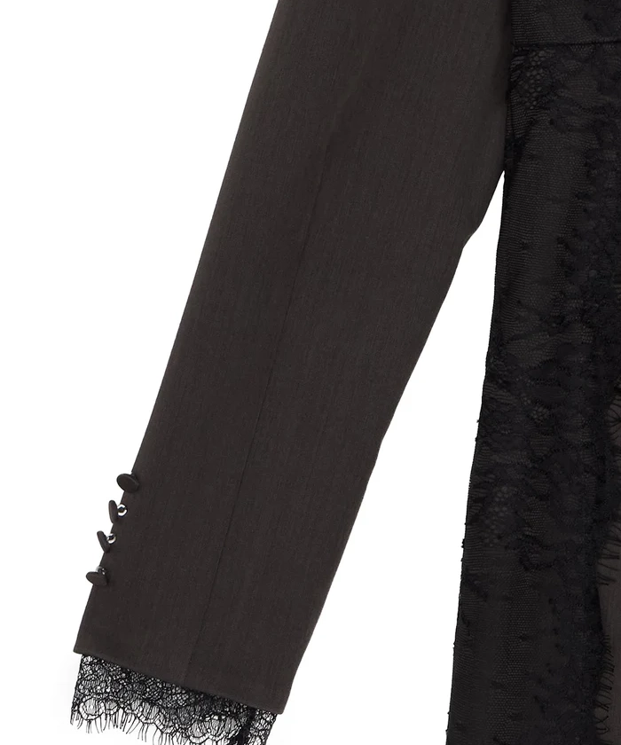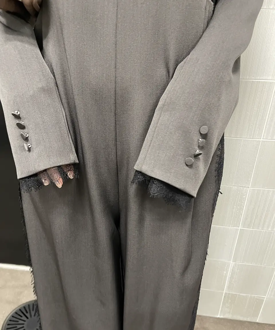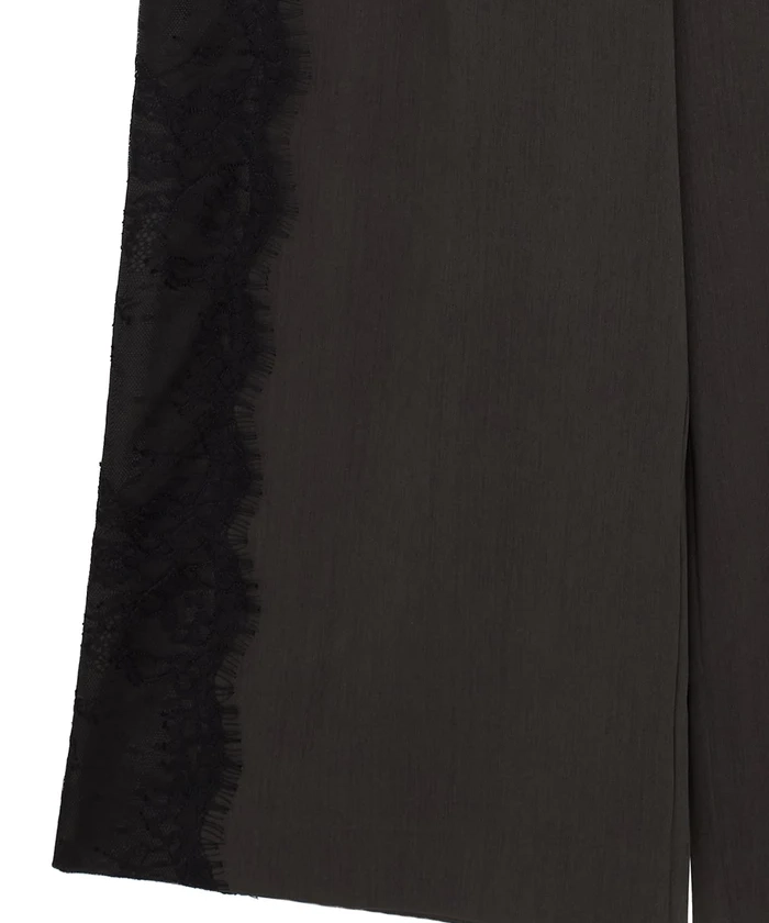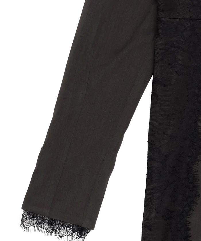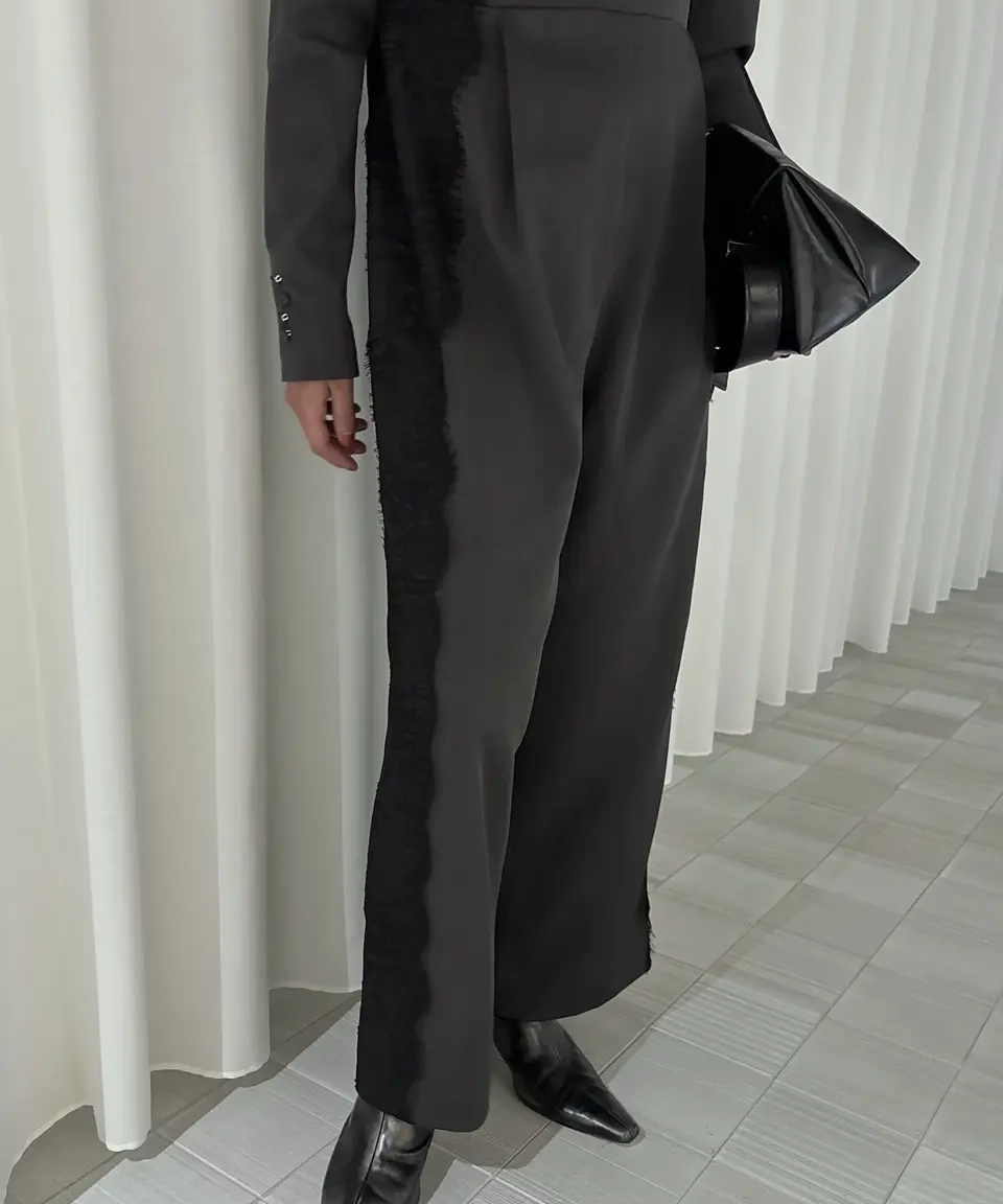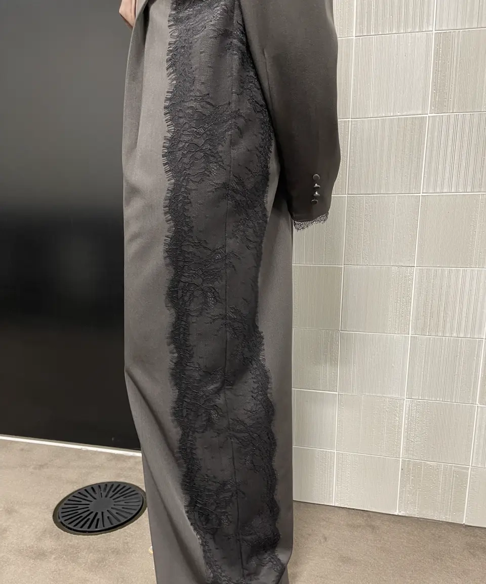 スーツ地をベースに、サイドや袖に太幅のレースを叩き付けた特別仕様。ゆったりとしたワイドシルエットでリラクシーな着心地を実現しながらも、レースの繊細なアクセントが抜け感と気品を両立。表情豊かなデザインに仕上げられており、裏地付き・透け感なし・伸縮性なしという仕様により、安心してきちんと感を保った装いが可能です。