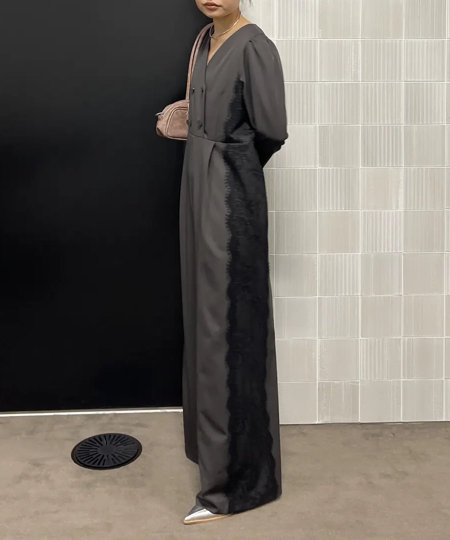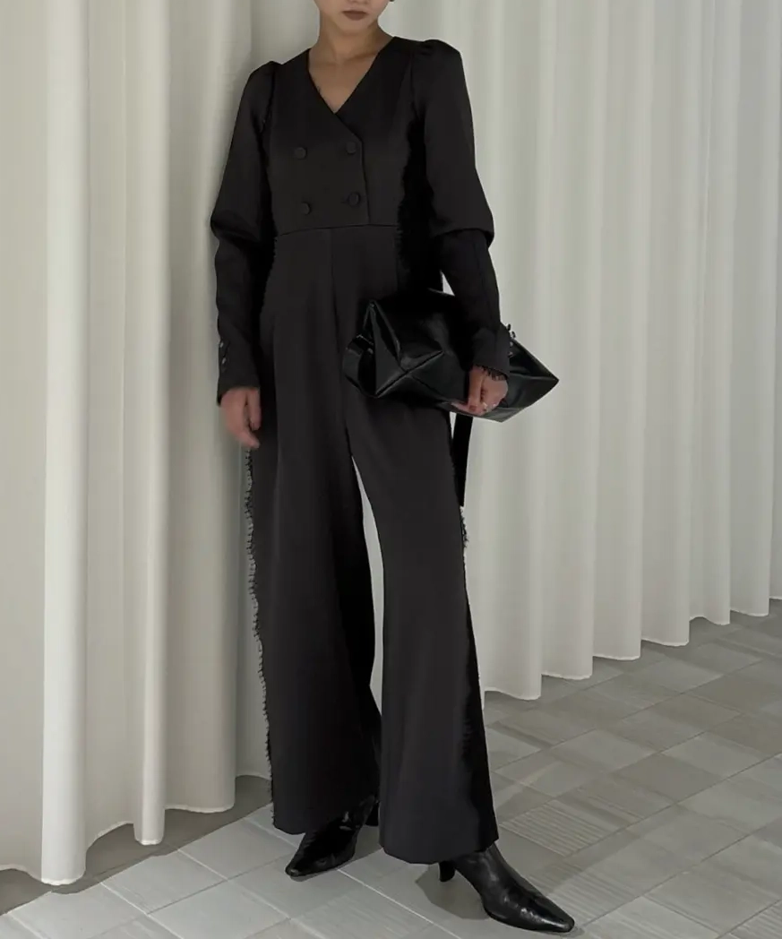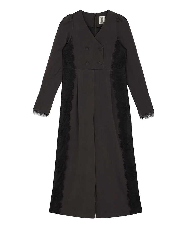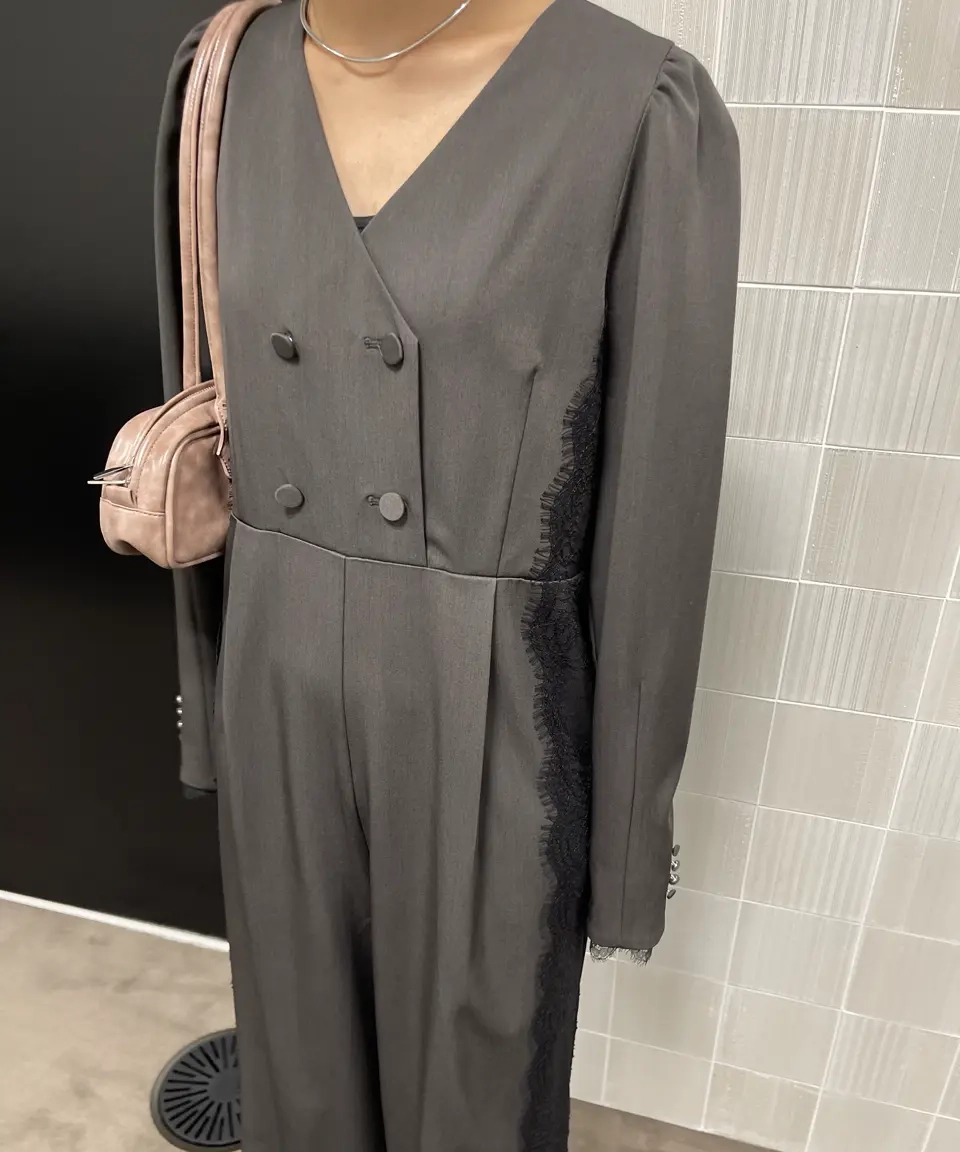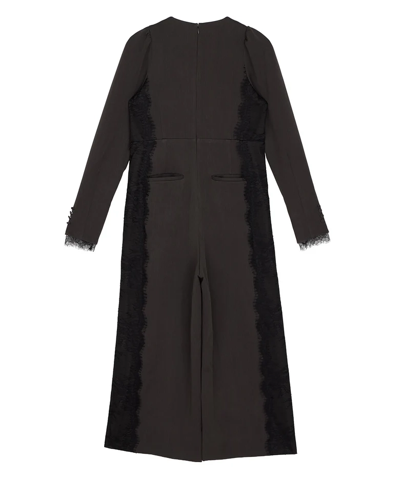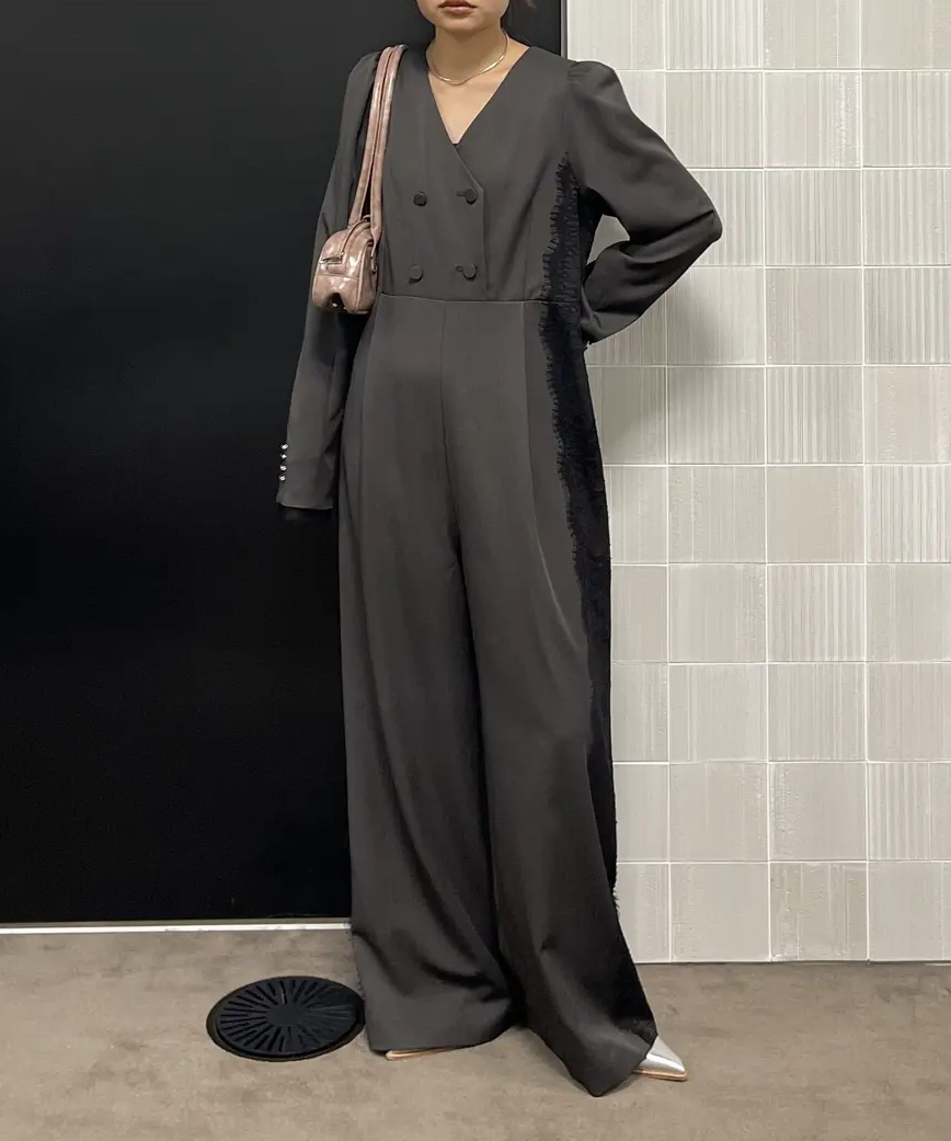 ブランドらしい上品な遊び心を取り入れたロマンティックなロンパースが登場しました。サイドにあしらった繊細なレースが、張りのあるスーツ地のワイドシルエットにほんのりと甘さをプラス。肩から腕にかけての立体感のあるフレアスリーブが女性らしさを際立たせ、デイリー使いから結婚式・パーティーなどの特別なシーンまで幅広く活躍します。後ろファスナー仕様で着脱もしやすく、1枚で印象を完成させる“洒落見え”アイテムです。