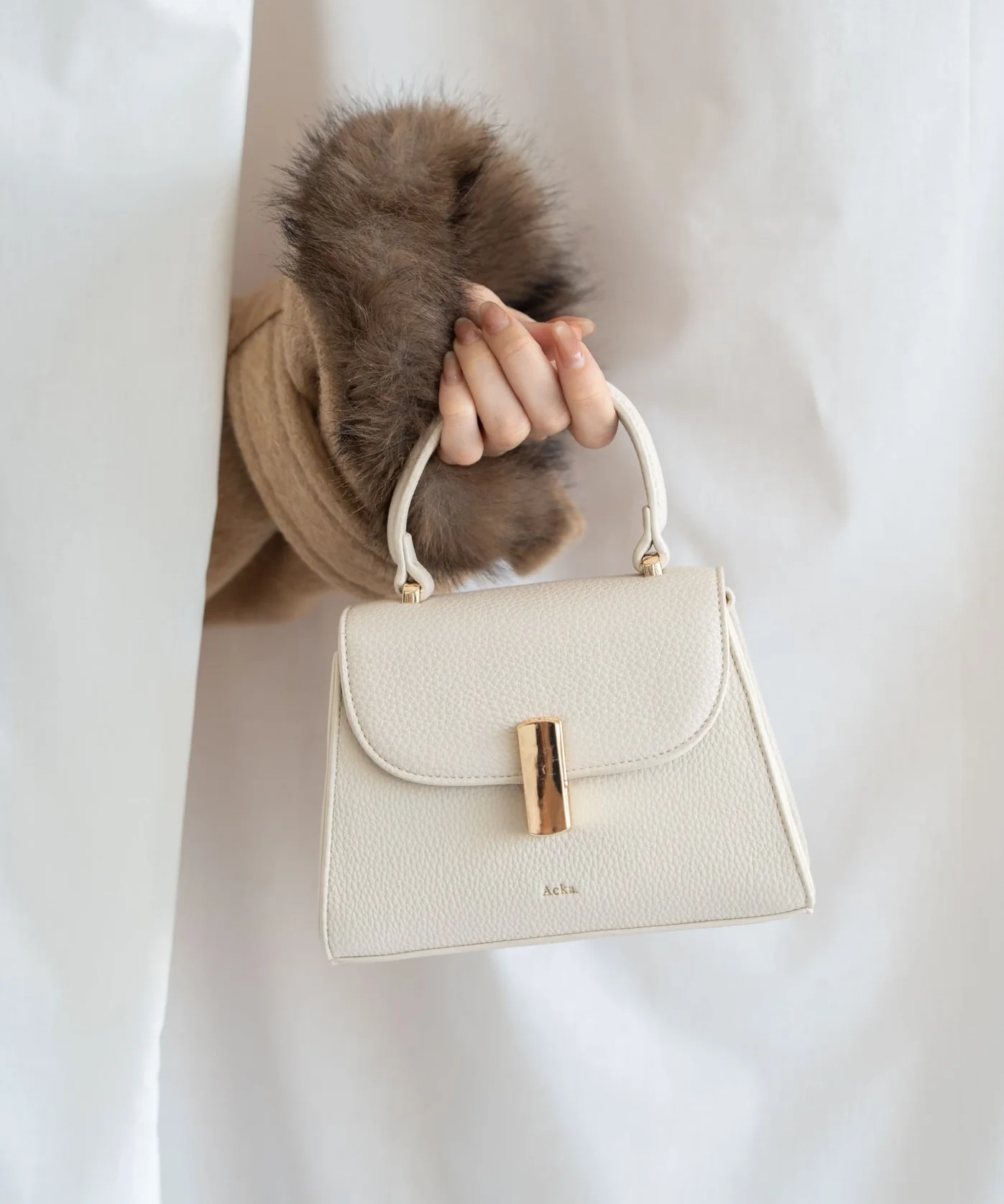 しなやかな質感のフェイクレザーを使った、Ackaらしいミニサイズのクラシックバッグです。程よい艶感のあるボディに、ゴールドの金具がさりげなく光り、ドレススタイルに上品なアクセントをプラスしてくれます。