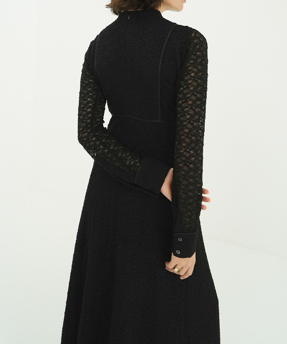 立体感のあるレースに、サテンのパイピングラインがすっと走る、CLANEらしいモードなレースワンピースです。華やかな凹凸レースが照明の下で陰影をつくり、シンプルなのに一枚で“きちんと感”と特別感の両方を叶えてくれます。