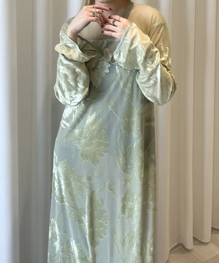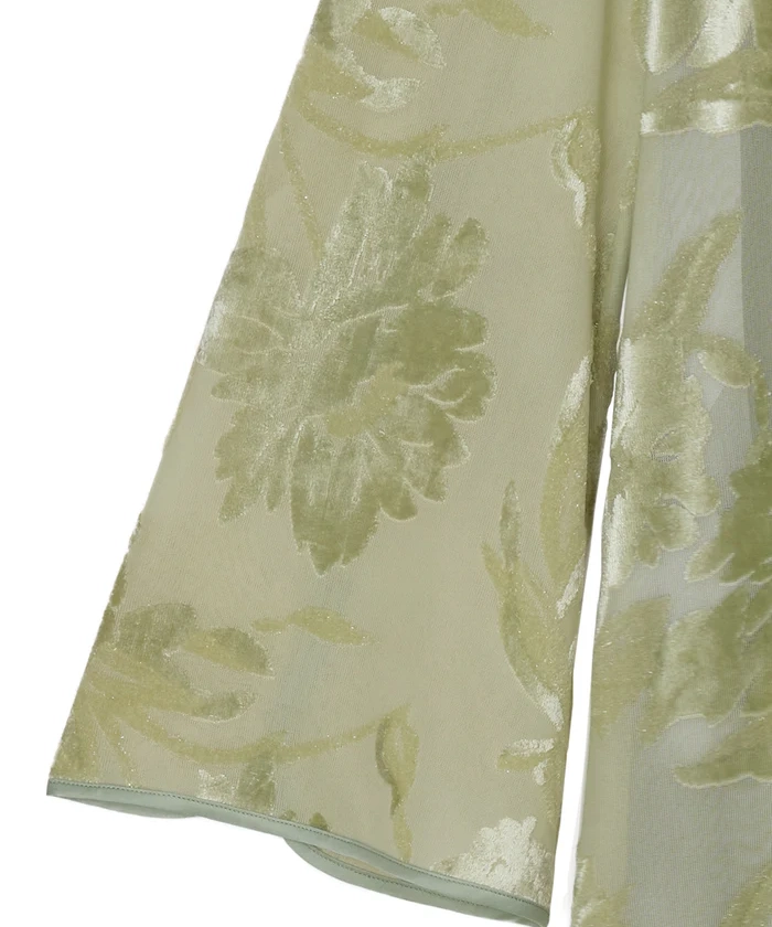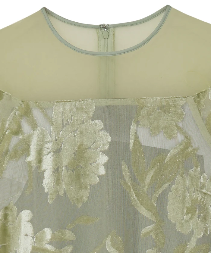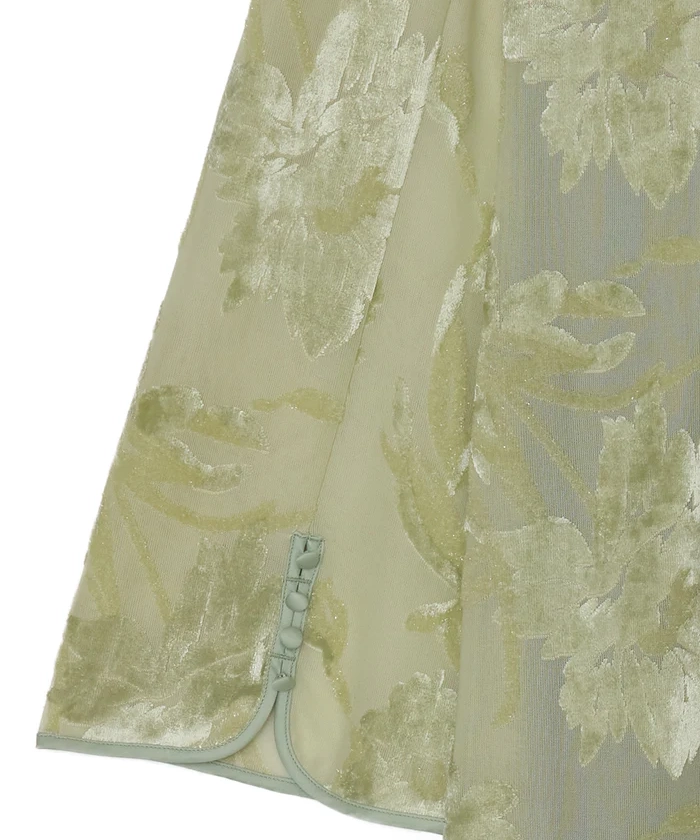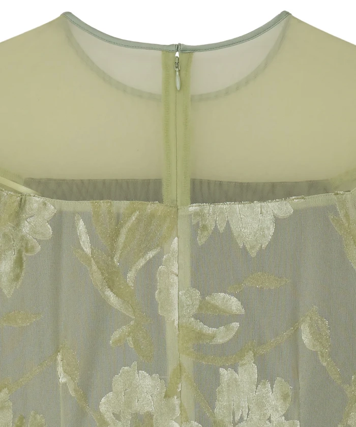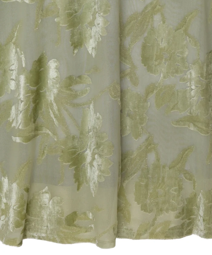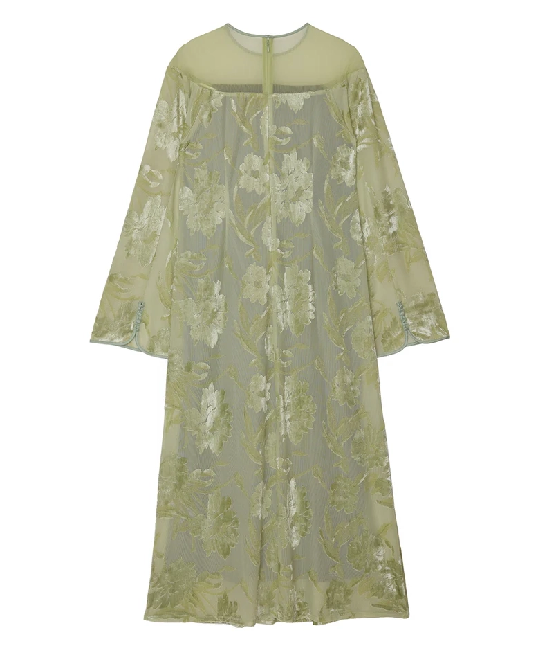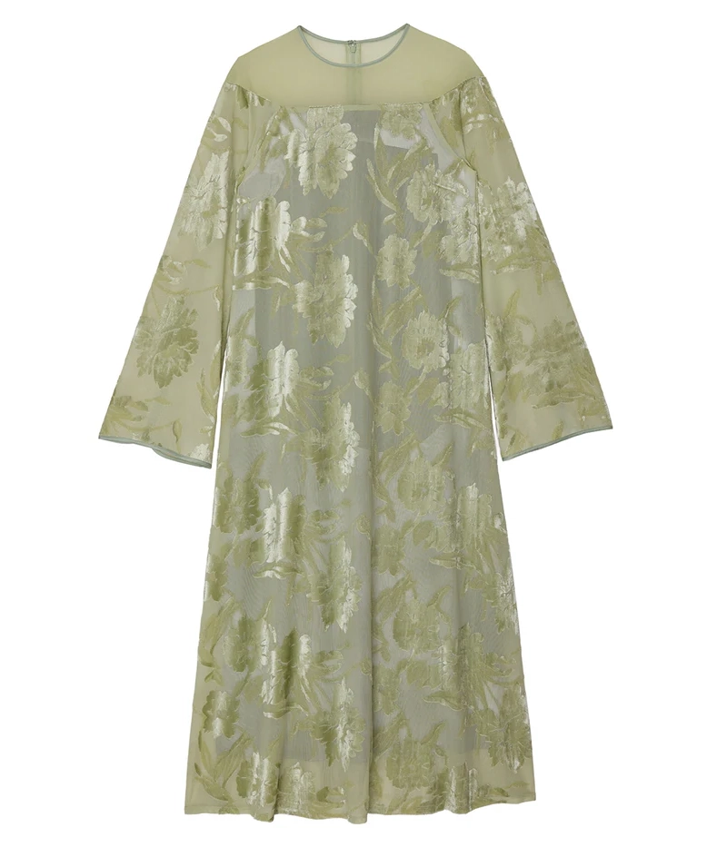 「SHEER JACQUARD A LINE DRESS」は、透け感のあるオパール素材を使用したAラインシルエットのドレスです。柄部分はベロアタッチになっており、季節感のある質感と立体的な表情を演出。肩のシアー切り替えが抜け感をつくりながらも、全体を上品にまとめています。光沢感とストレッチ性のある生地は動きやすさも◎。幅広いオケージョンシーンで活躍が期待できる1着です。