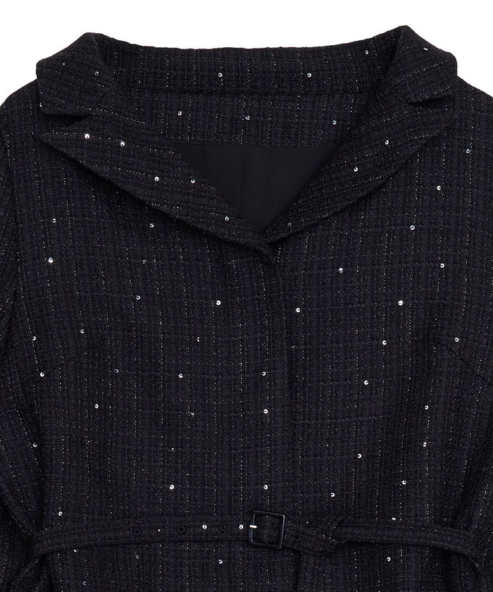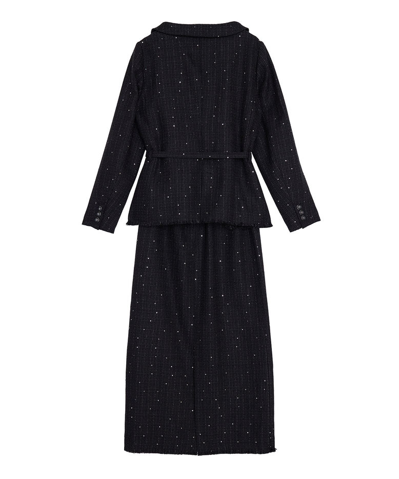 「GLITTER TWEED SET UP」は、ラメツイード素材を用いたトップスとスカートのセットアップです。オリジナルツイードにはラメやスパンコールが織り込まれ、上品な光沢感と華やかさが特徴。トップスは開いたデコルテラインと立体的な袖がデザインポイントで、細ベルト付きでアレンジも自在。スカートはシンプルなIラインシルエットにメロー&フリンジ仕様のディテールをプラスし、こなれ感のあるルックに仕上げています。セットでオケージョンシーンに、単体でデイリーまで幅広く対応します。