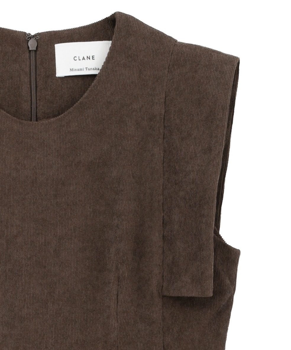 CLANE × Minami Tanaka の人気コラボラインから復刻したスクエアスリーブオールインワン。肩まわりをすっきりと見せるスクエアスリーブデザインが、さりげなく二の腕をカバーしつつモードな印象を演出します。柔らかく細畝のコーデュロイ素材を使用し、大人の抜け感と上品なリラックスムードを実現。程よいゆとりのあるシルエットで、幅広い体型にフィットします