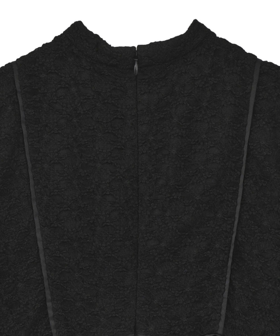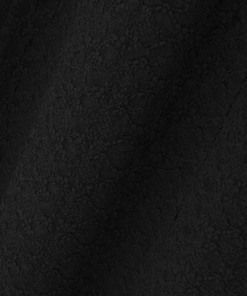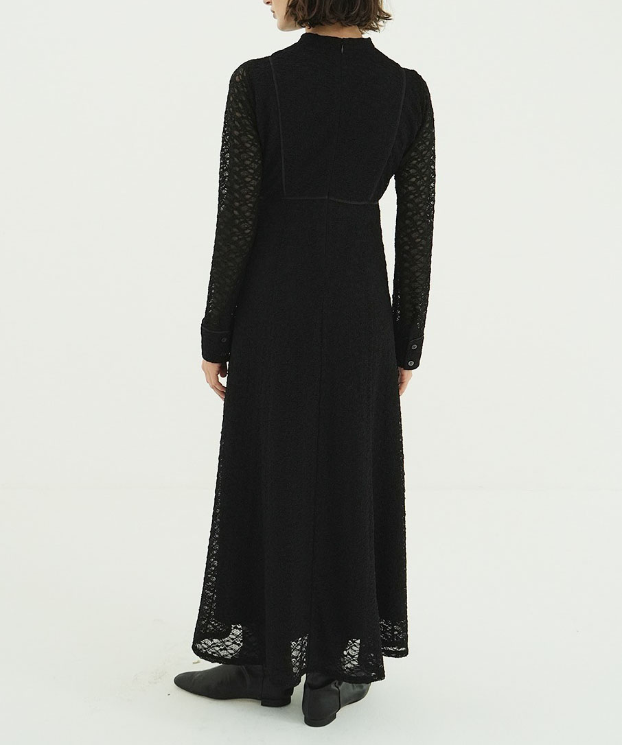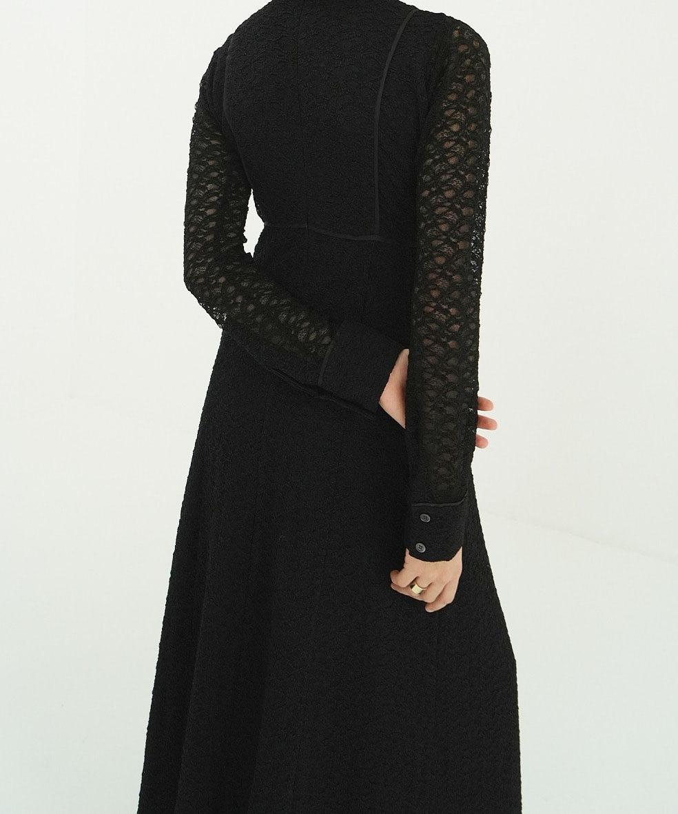 華やかさとモード感を兼ね備えたレースワンピース。立体感のある凹凸レース素材に、微光沢のサテンパイピングがアクセントを添え、女性らしい表情を演出します。袖部分はやや透け感があり、抜け感のある印象に。身頃には裏地を施し、安心して着用できる仕立てです。首元のスリットはホックで開閉が可能で、さりげないディテール使いもポイントです。