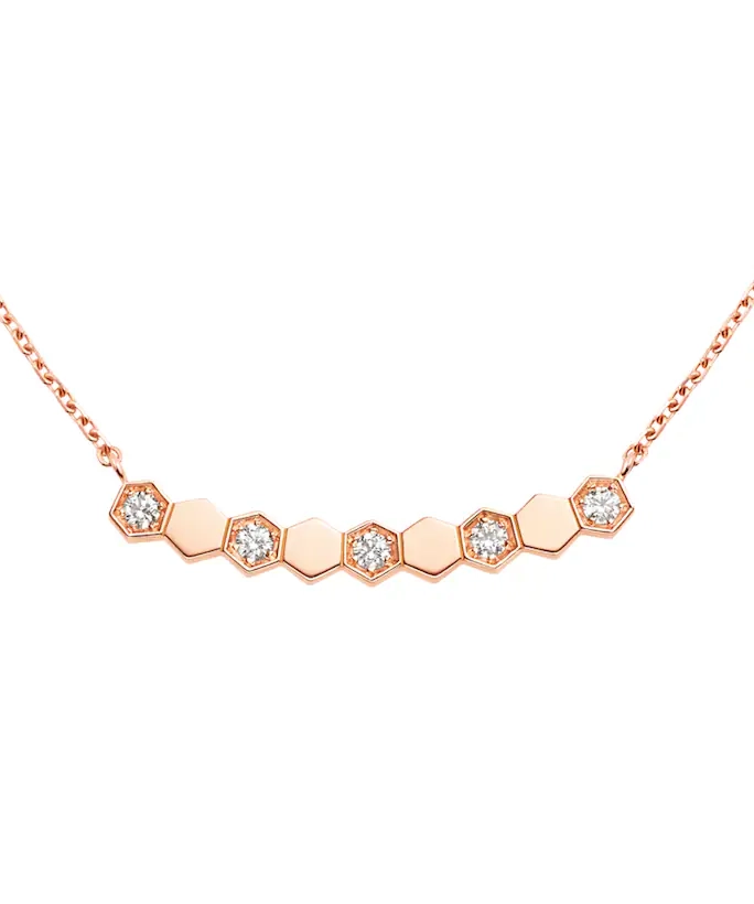 ショーメの人気コレクション 「Bee de Chaumet(ビー ドゥ ショーメ)」 から、華やかな輝きを放つペンダントが登場。Honeycomb(蜂の巣)モチーフをモダンにアレンジしたグラフィックなデザインに、ブリリアントカット ダイヤモンドをセミパヴェ セッティング。18Kピンクゴールドの温かみある質感とダイヤの煌めきが上品で、デイリーからフォーマルまで幅広く活躍します。光を捉えるディテールが首元を美しく彩ります。