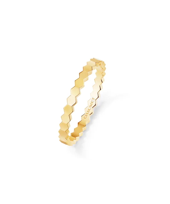 ショーメのアイコン的コレクション 「Bee de Chaumet(ビー ドゥ ショーメ)」 のイエローゴールドリング。象徴的なハニカム(蜂の巣)モチーフが連なるグラフィックなデザインは、モダンでありながらタイムレスな魅力を放ちます。光を受けて独自の輝きを放つシンプルなフォルムは、単体でも重ねづけでもスタイリングを格上げ。日常から特別な日まで、幅広いシーンで活躍する洗練されたリングです。