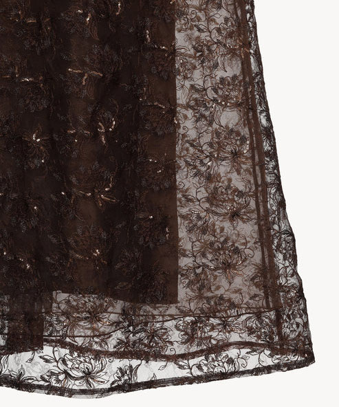 「Shimmery Lace Dress」は、繊細で上品なレース素材を使用したロングワンピース。刺繍糸とスパンコールの輝きが優雅で、特別な日のお出かけやパーティーシーンにも映える一着です。フリルとティアードのディテールが女性らしい動きをつくり、細部までこだわったデザインが際立ちます。