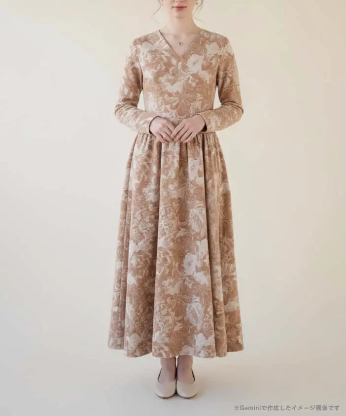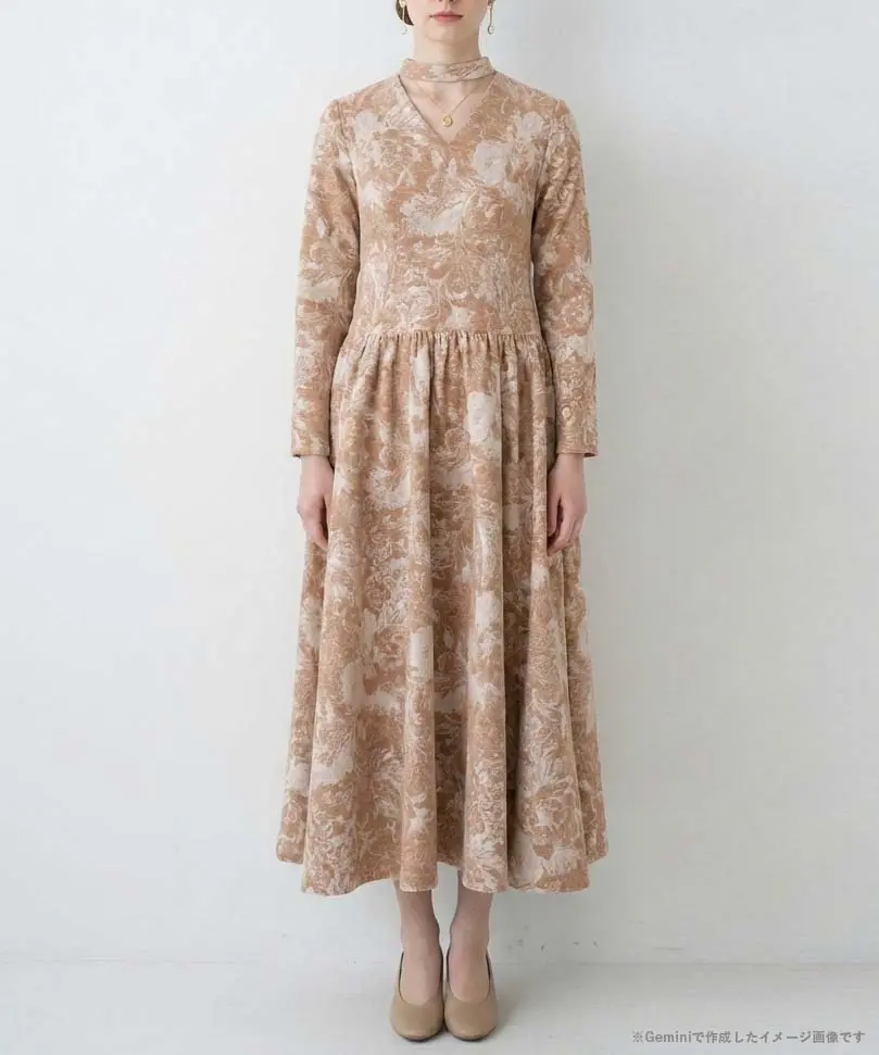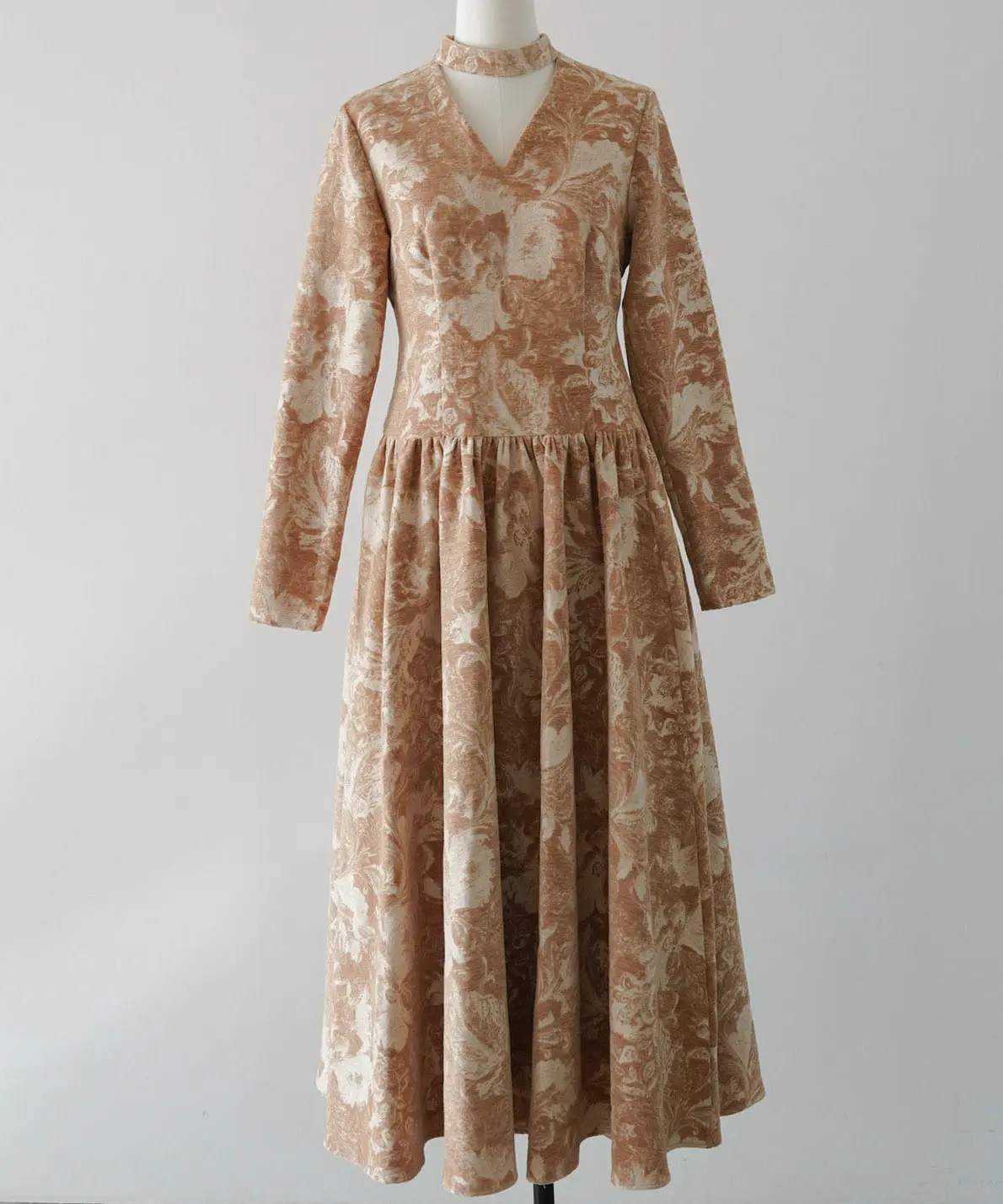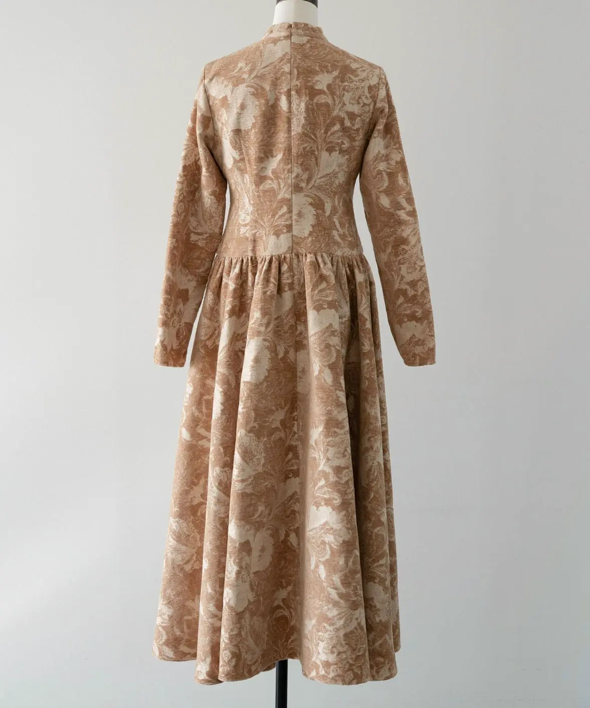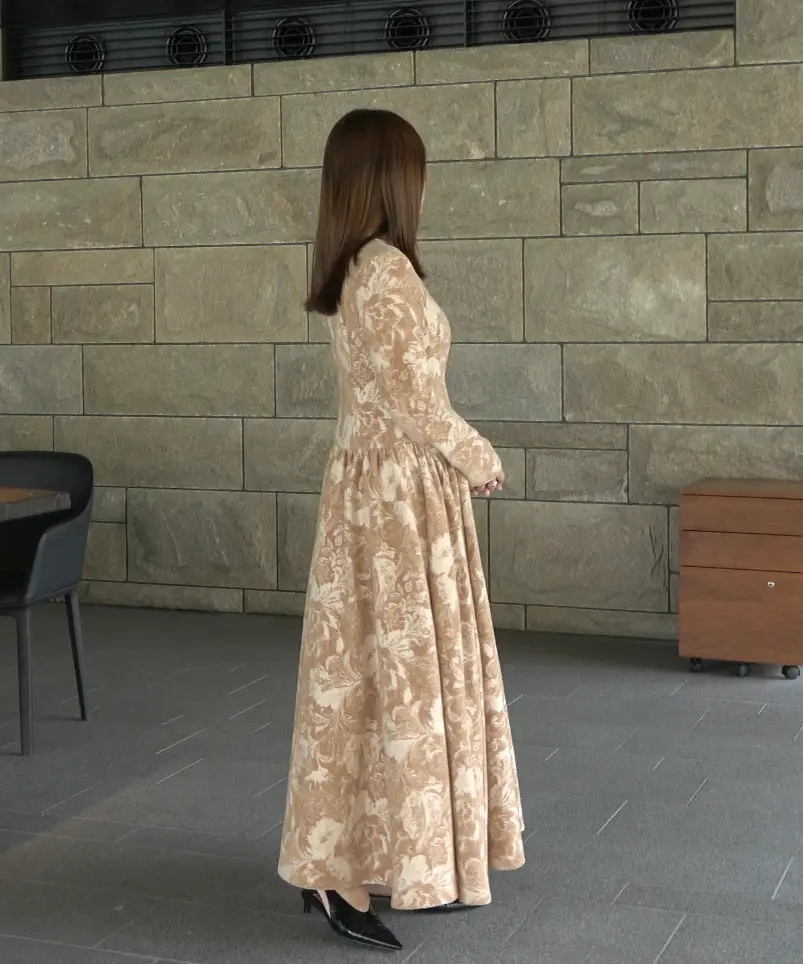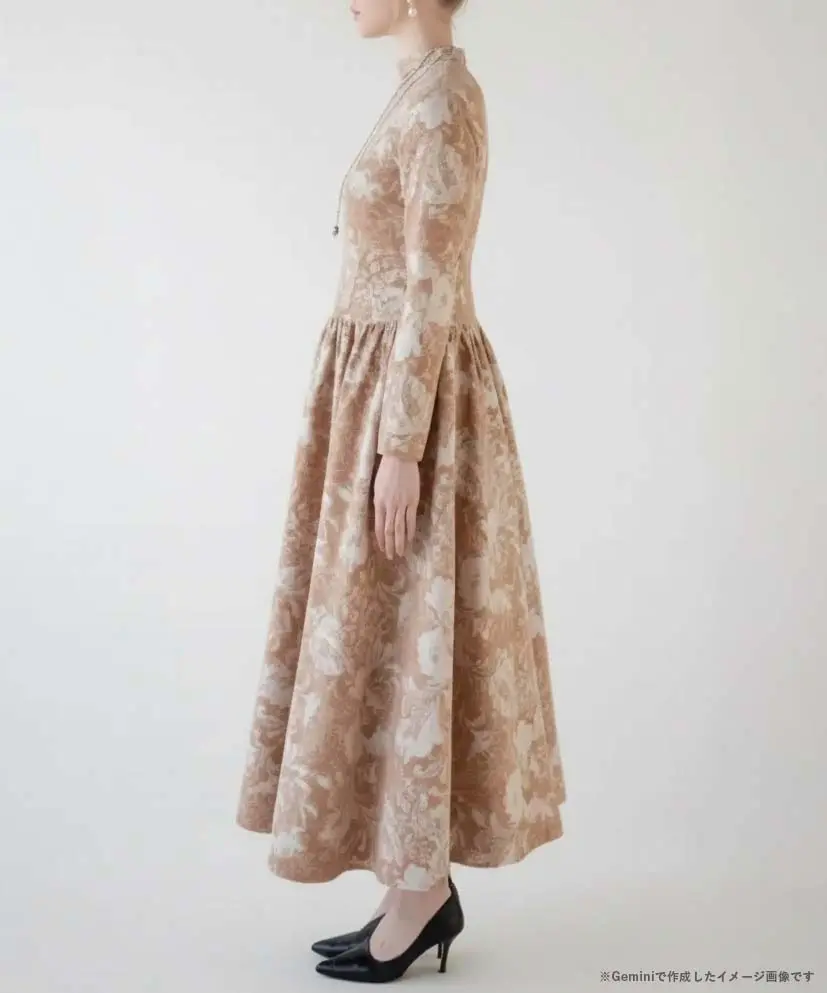 総柄デザインが印象的なクラシックムードのロングドレスです。デコルテを美しく見せるネックラインと、程よくフィットする身頃がバランスよく、ウエスト切替から広がるスカートが自然な立体感を演出します。落ち着いた色合いで1枚でも着用しやすく、きれいめなシーンにも対応できる一着。ポケットはなしです。