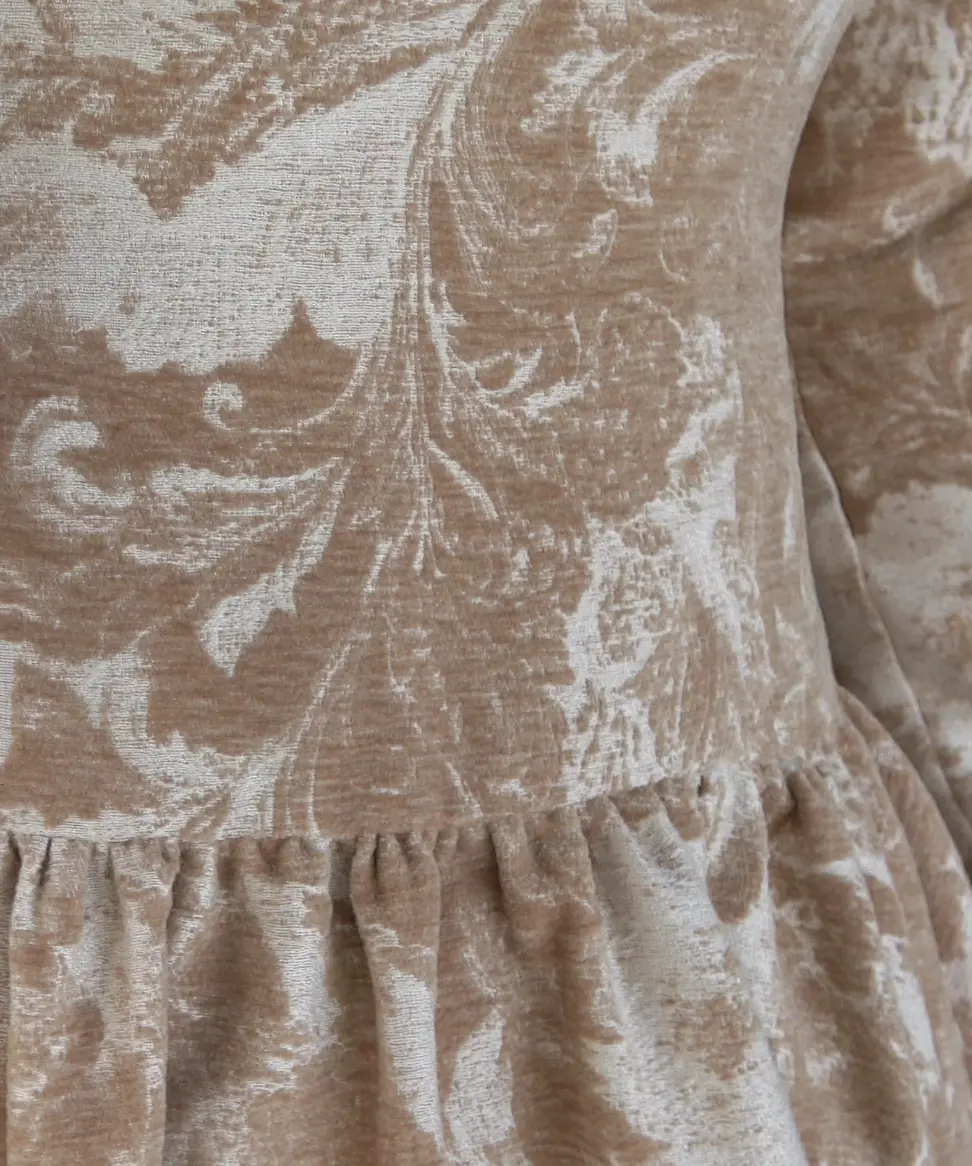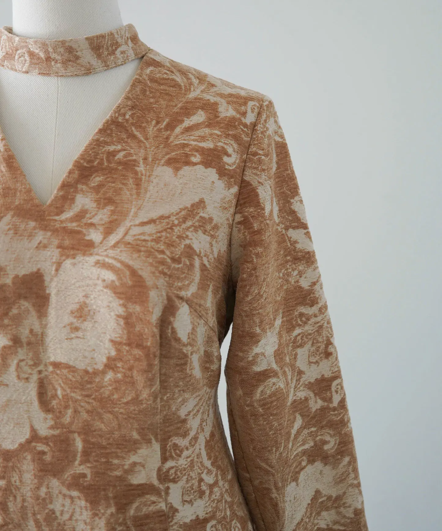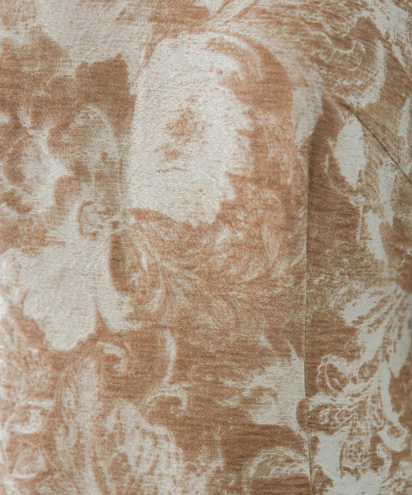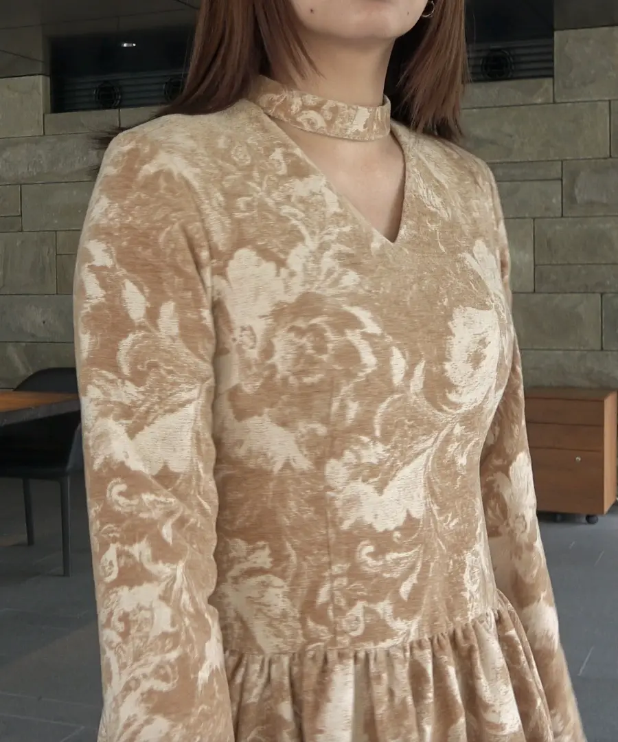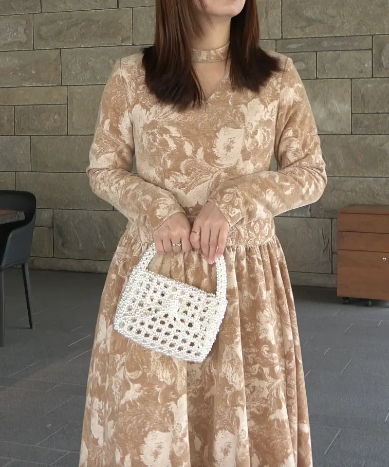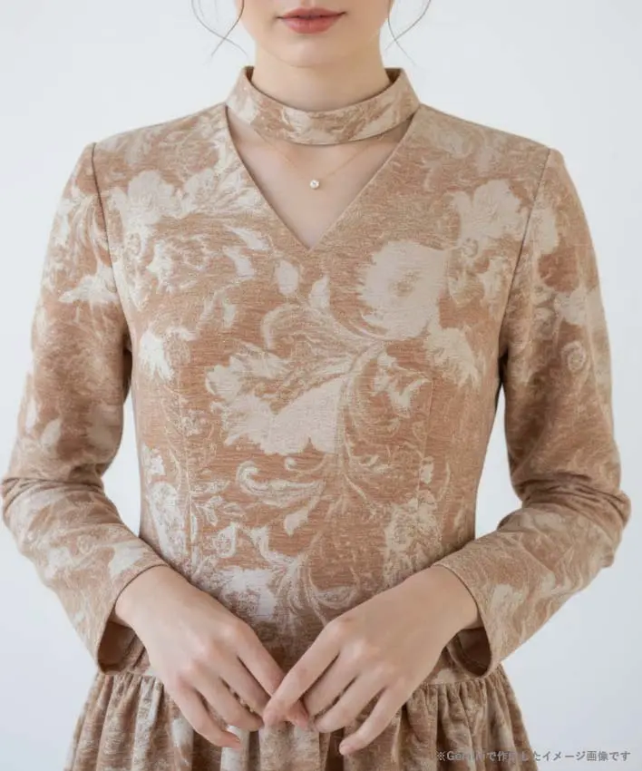 総柄デザインが印象的なクラシックムードのロングドレスです。デコルテを美しく見せるネックラインと、程よくフィットする身頃がバランスよく、ウエスト切替から広がるスカートが自然な立体感を演出します。落ち着いた色合いで1枚でも着用しやすく、きれいめなシーンにも対応できる一着。ポケットはなしです。