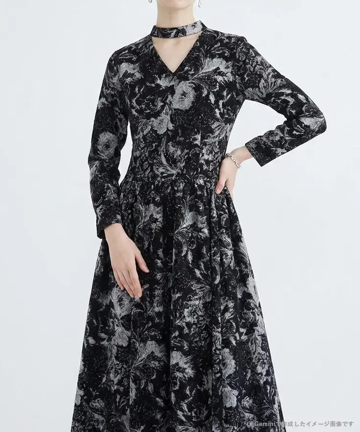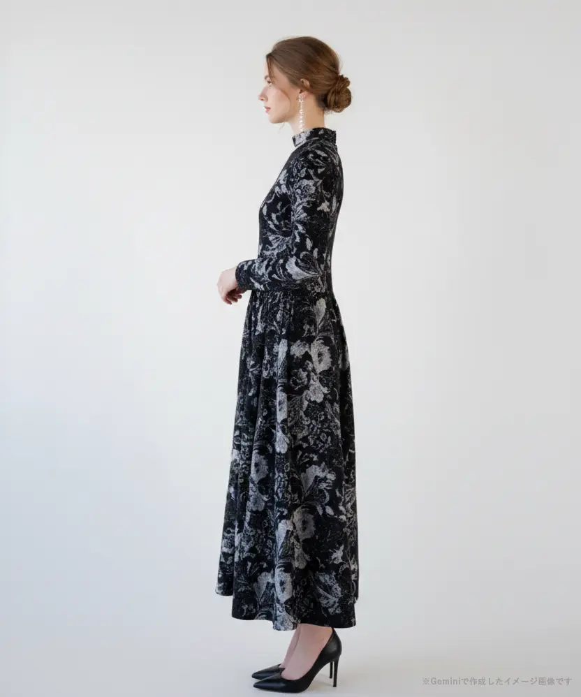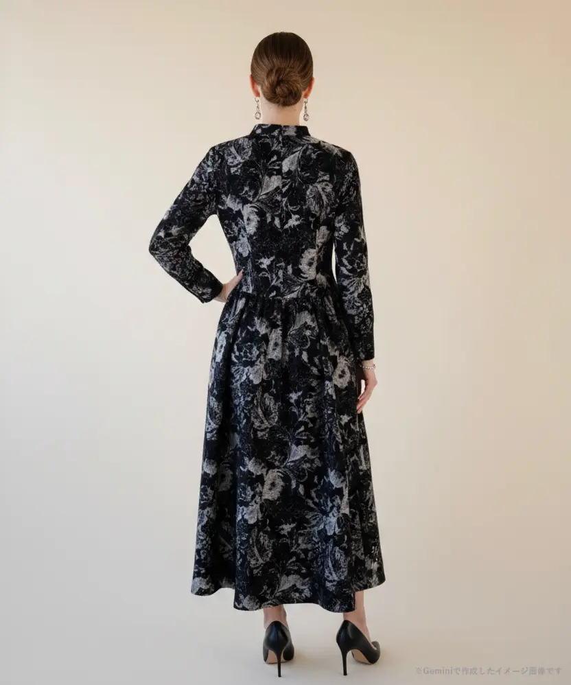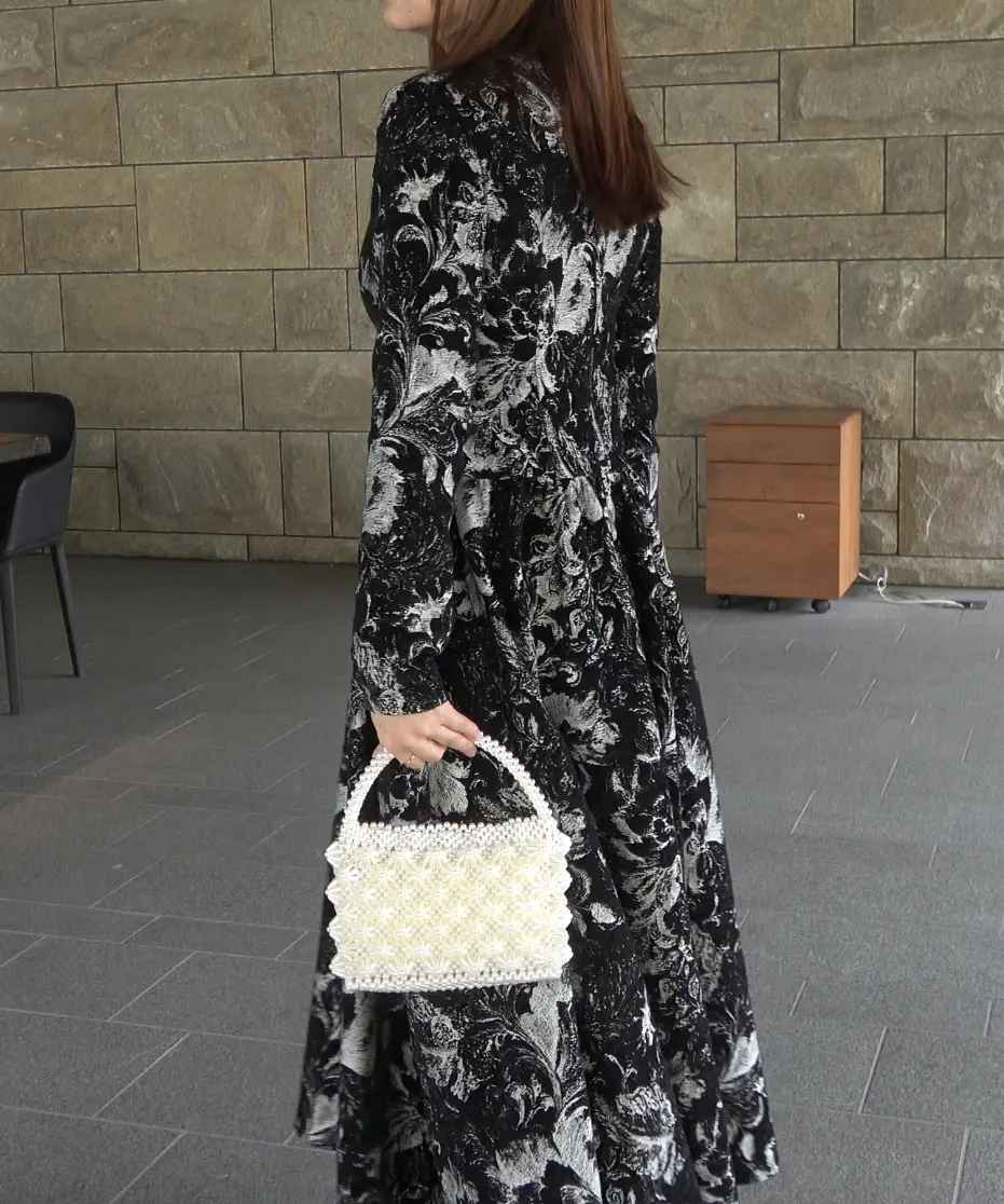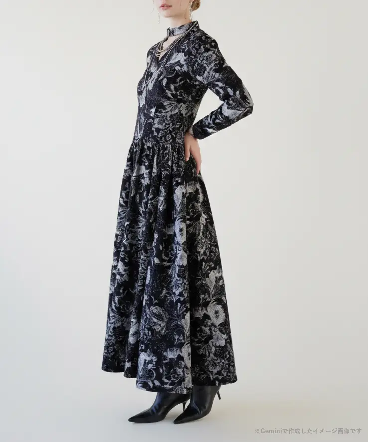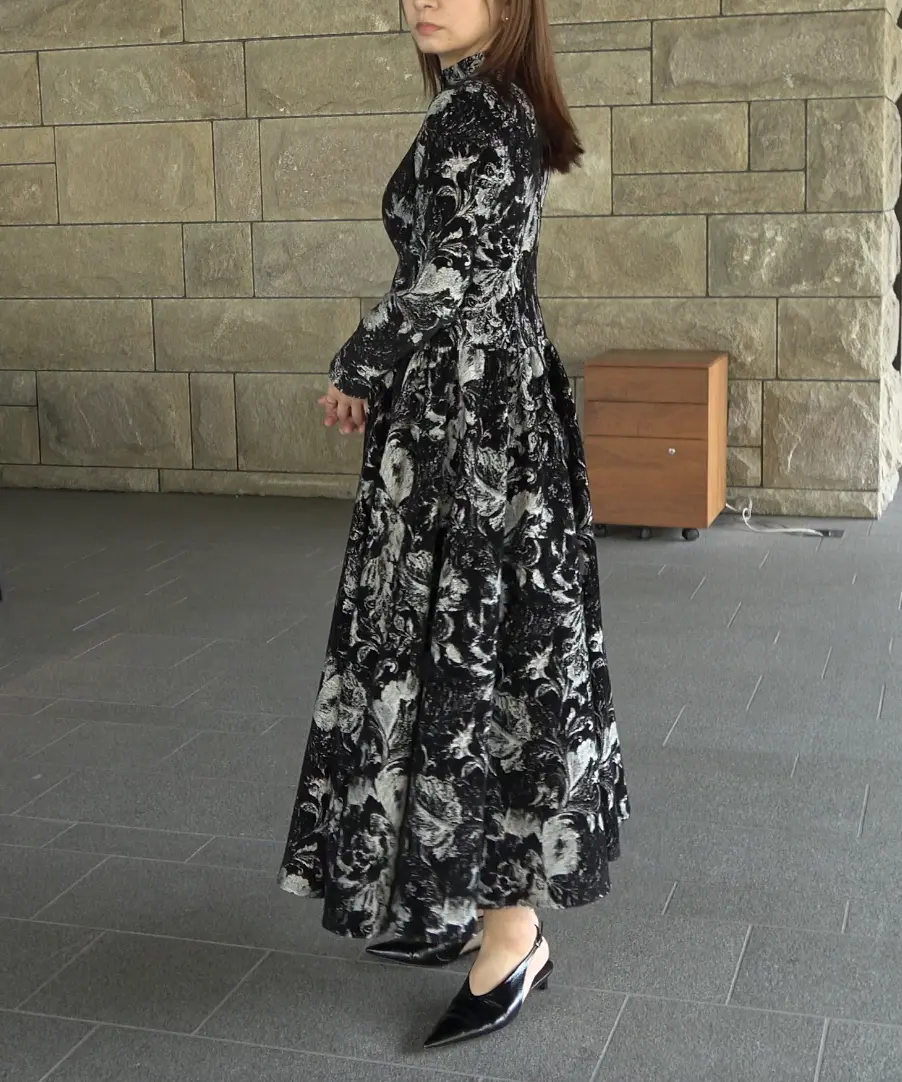 総柄デザインが印象的なクラシックムードのロングドレスです。デコルテを美しく見せるネックラインと、程よくフィットする身頃がバランスよく、ウエスト切替から広がるスカートが自然な立体感を演出します。落ち着いた色合いで1枚でも着用しやすく、きれいめなシーンにも対応できる一着。ポケットはなしです。