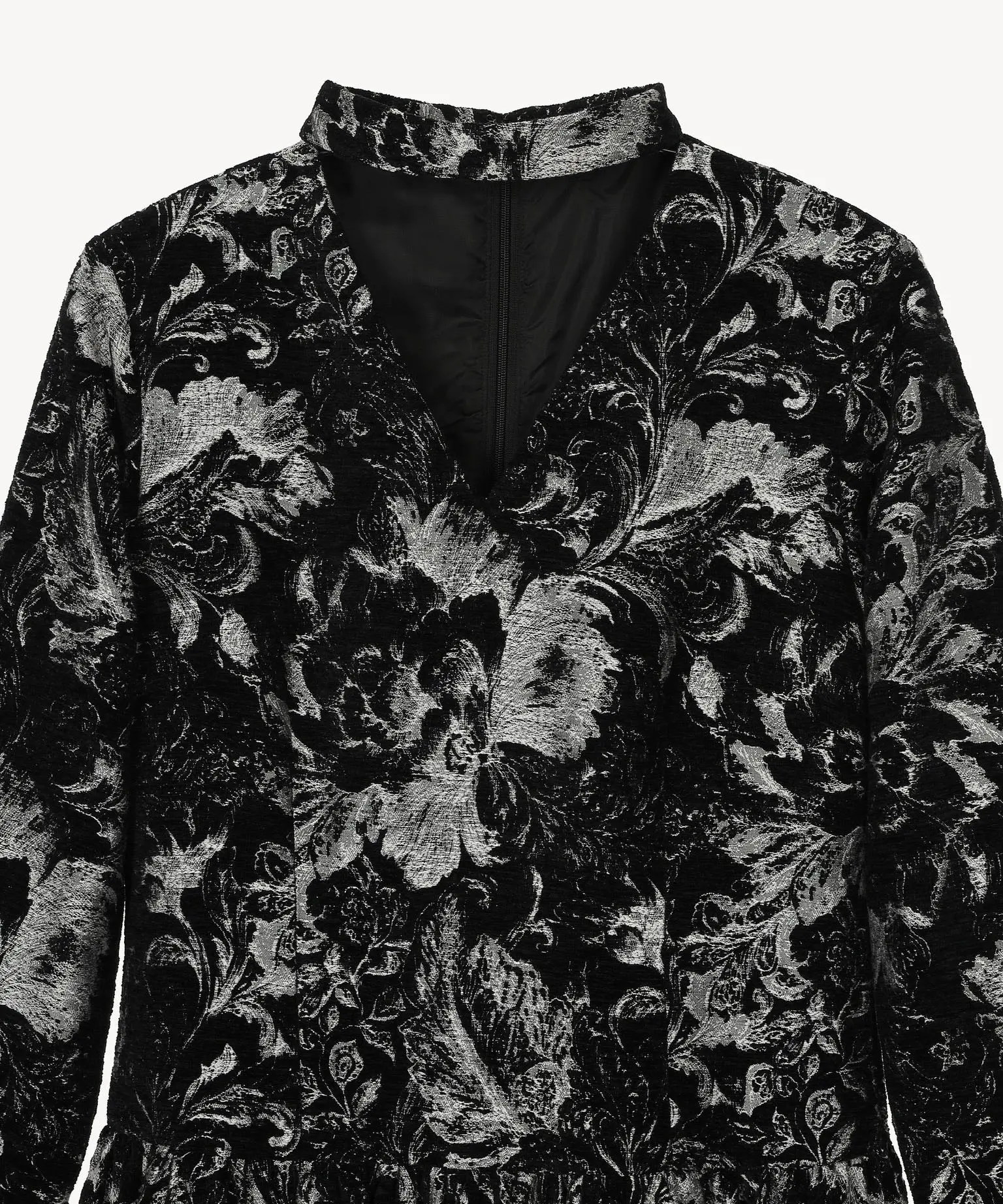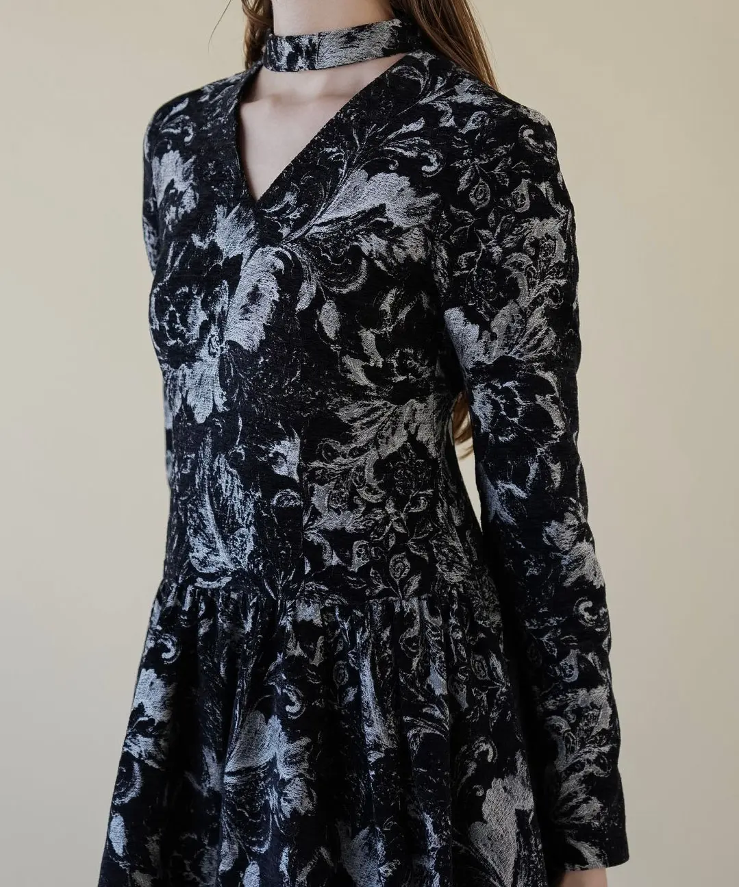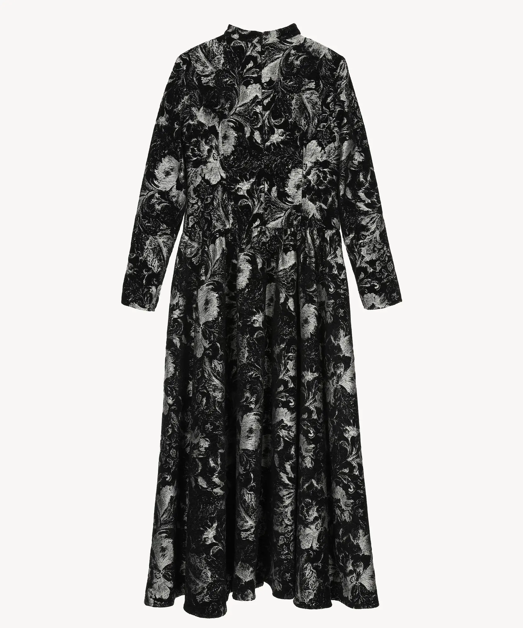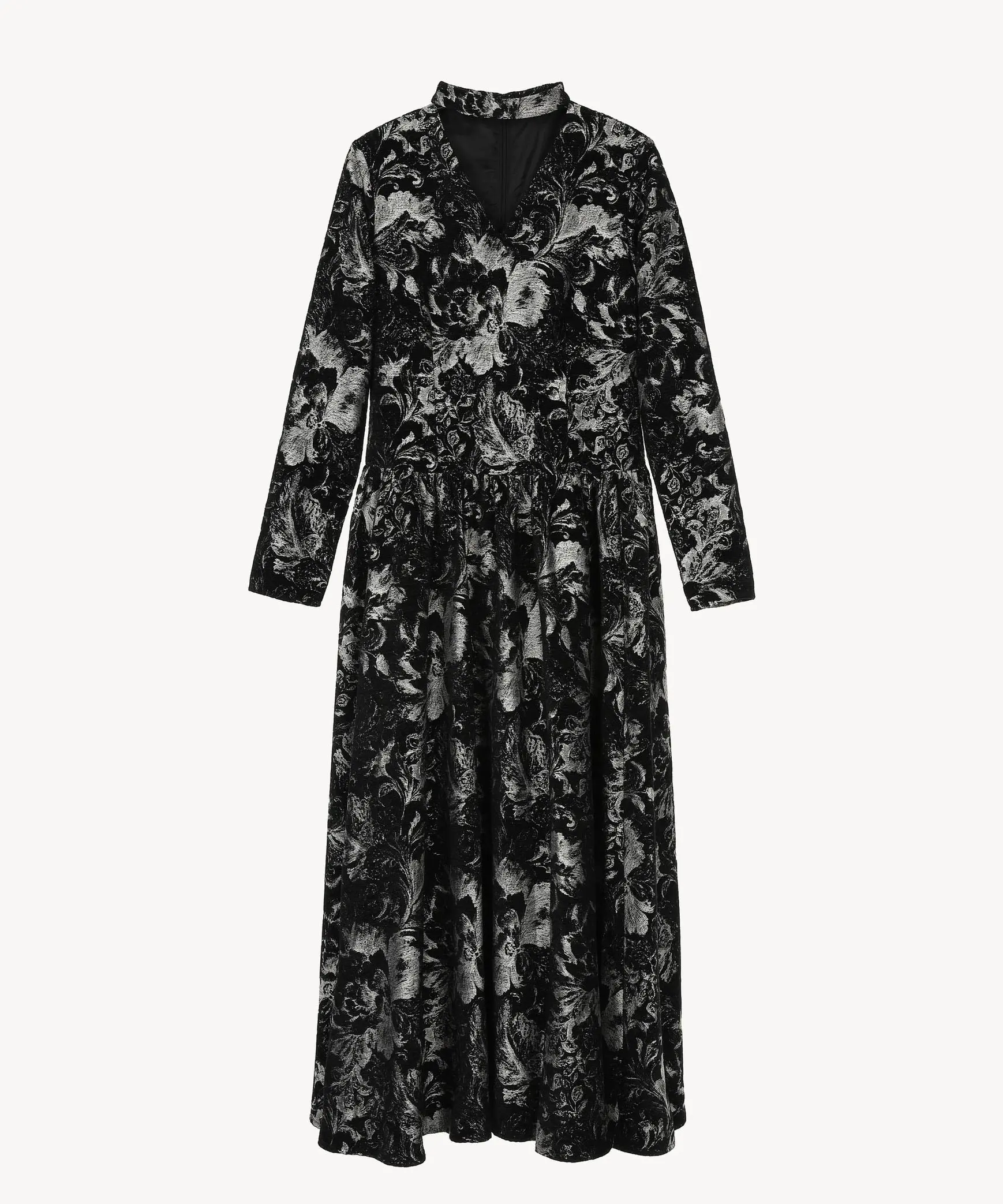 総柄デザインが印象的なクラシックムードのロングドレスです。デコルテを美しく見せるネックラインと、程よくフィットする身頃がバランスよく、ウエスト切替から広がるスカートが自然な立体感を演出します。落ち着いた色合いで1枚でも着用しやすく、きれいめなシーンにも対応できる一着。ポケットはなしです。
