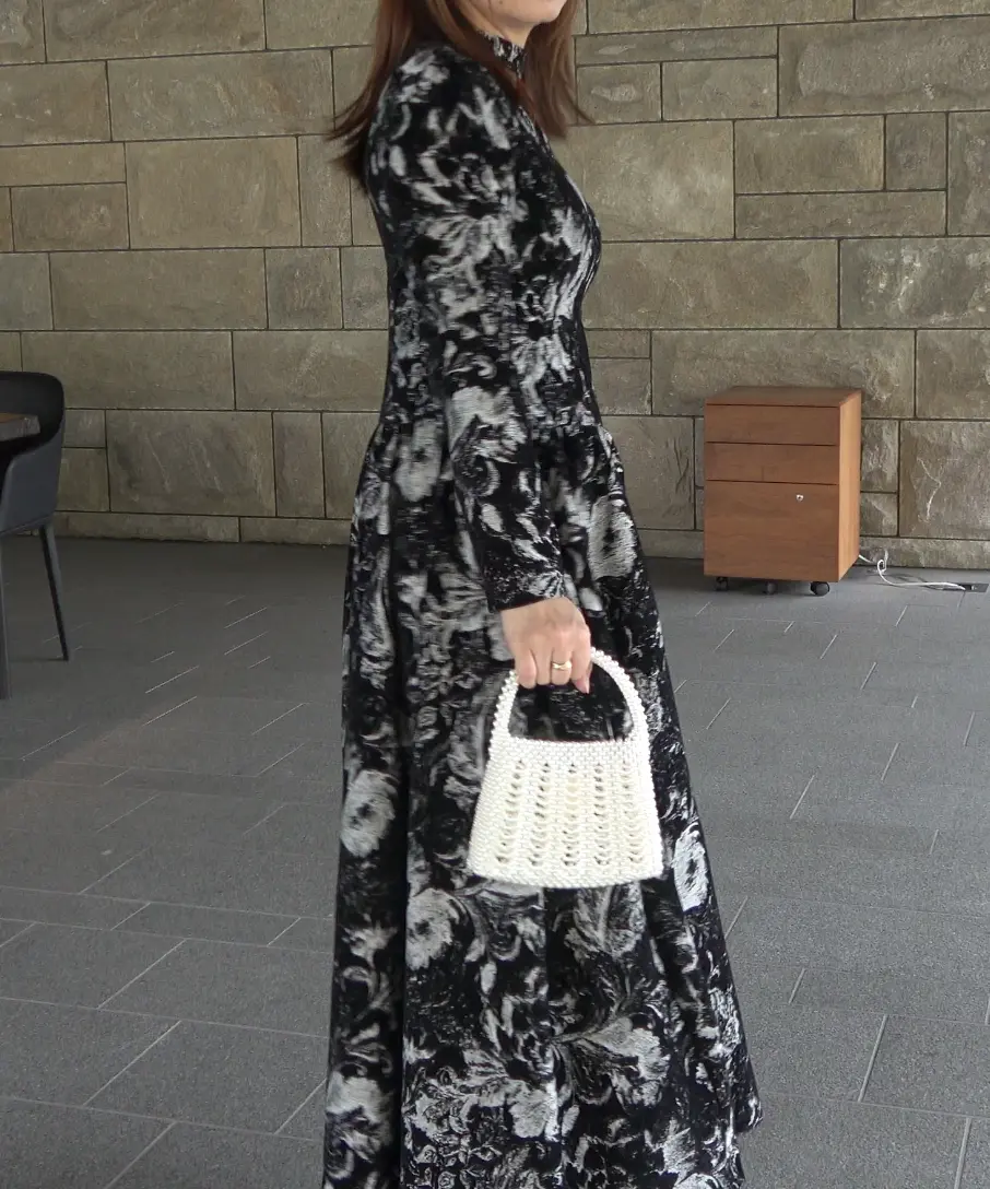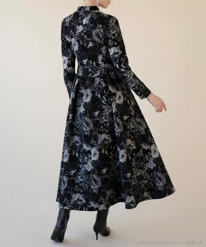総柄×フロッキーの表情が上品で、きれいめにまとめたい日にも頼れるロングワンピです。デコルテがきれいに見えるネックデザインと、上身頃の程よいフィット感で、全体がすっきり見えるのが嬉しいポイント。ウエスト切替から自然に広がるスカートラインで、立体感もきれいに出ます。透け感は基本なし・伸縮性なし・裏地ありなので、安心感のある着心地です。