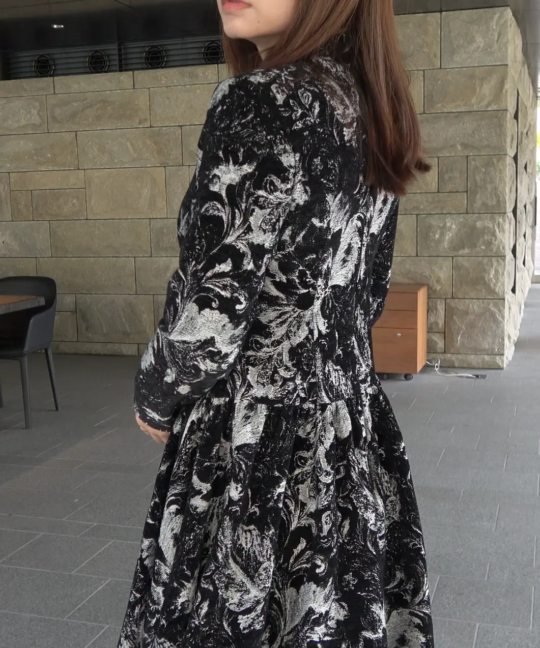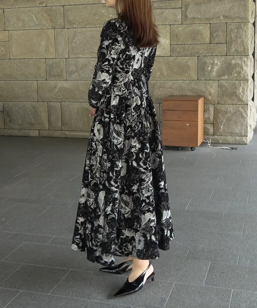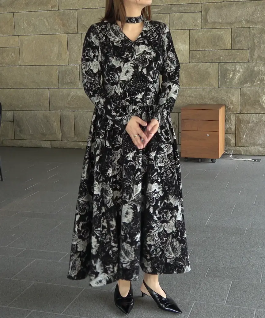 総柄デザインが印象的なクラシックムードのロングドレスです。デコルテを美しく見せるネックラインと、程よくフィットする身頃がバランスよく、ウエスト切替から広がるスカートが自然な立体感を演出します。落ち着いた色合いで1枚でも着用しやすく、きれいめなシーンにも対応できる一着。ポケットはなしです。