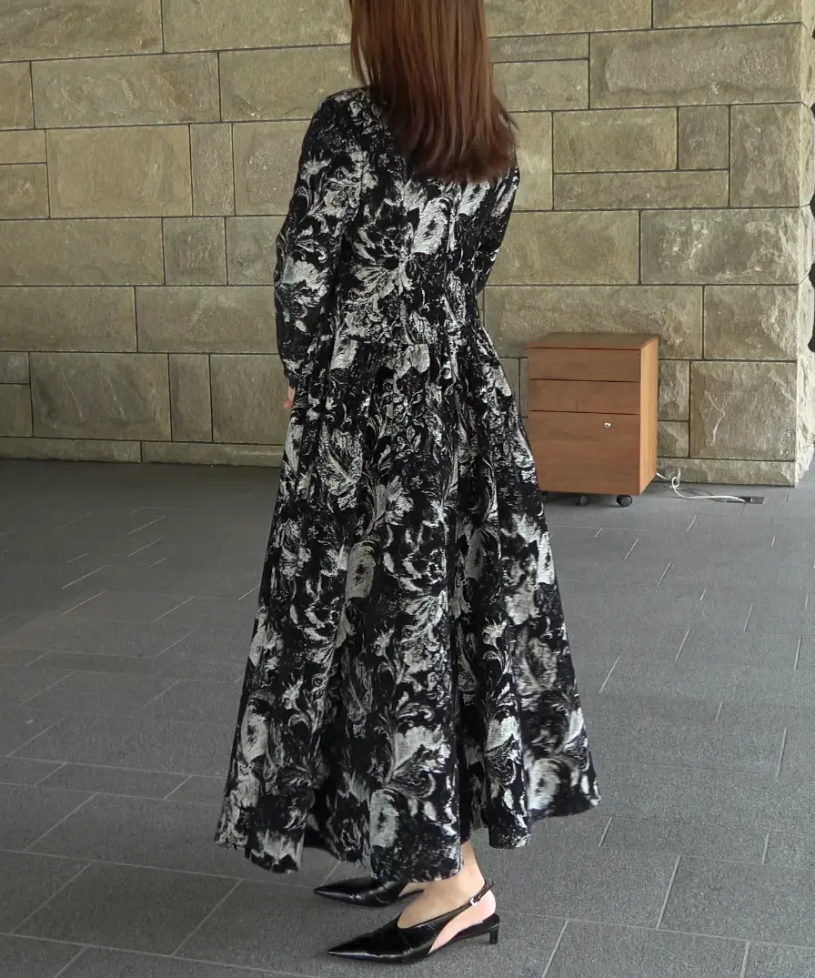 総柄×フロッキーの表情が上品で、きれいめにまとめたい日にも頼れるロングワンピです。デコルテがきれいに見えるネックデザインと、上身頃の程よいフィット感で、全体がすっきり見えるのが嬉しいポイント。ウエスト切替から自然に広がるスカートラインで、立体感もきれいに出ます。透け感は基本なし・伸縮性なし・裏地ありなので、安心感のある着心地です。