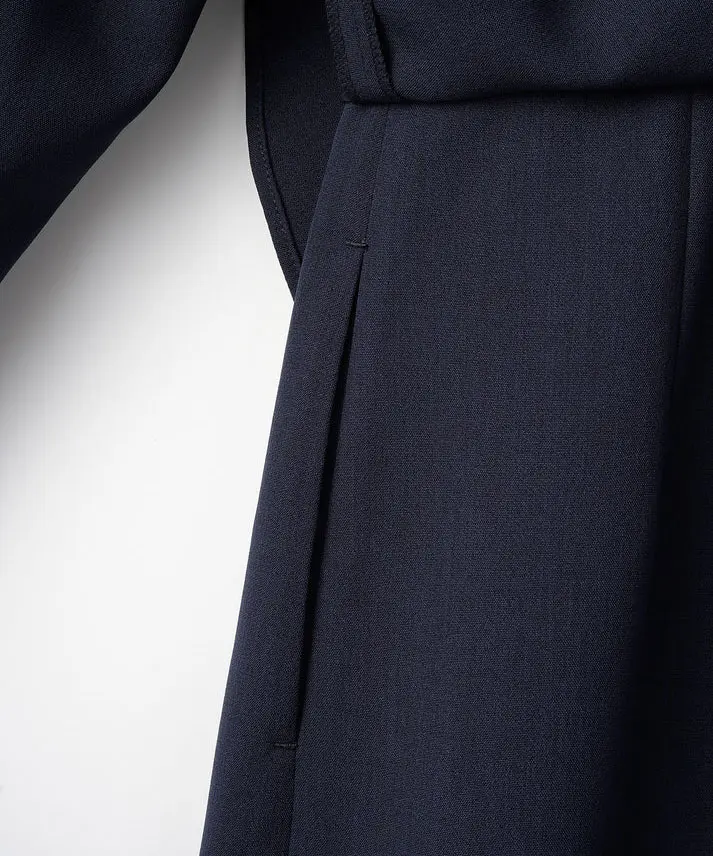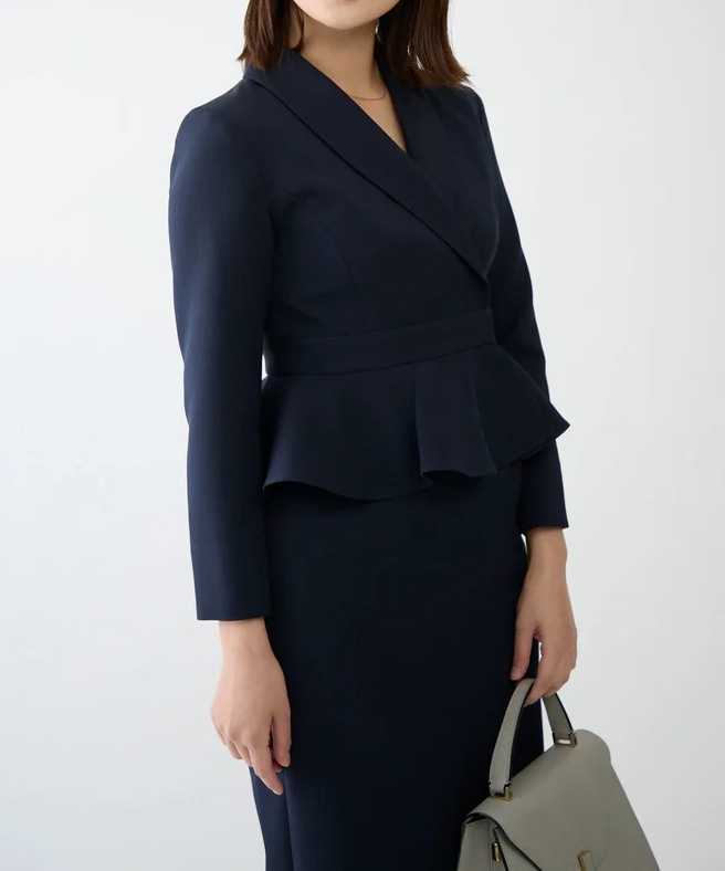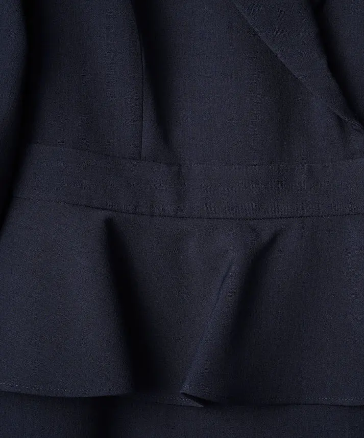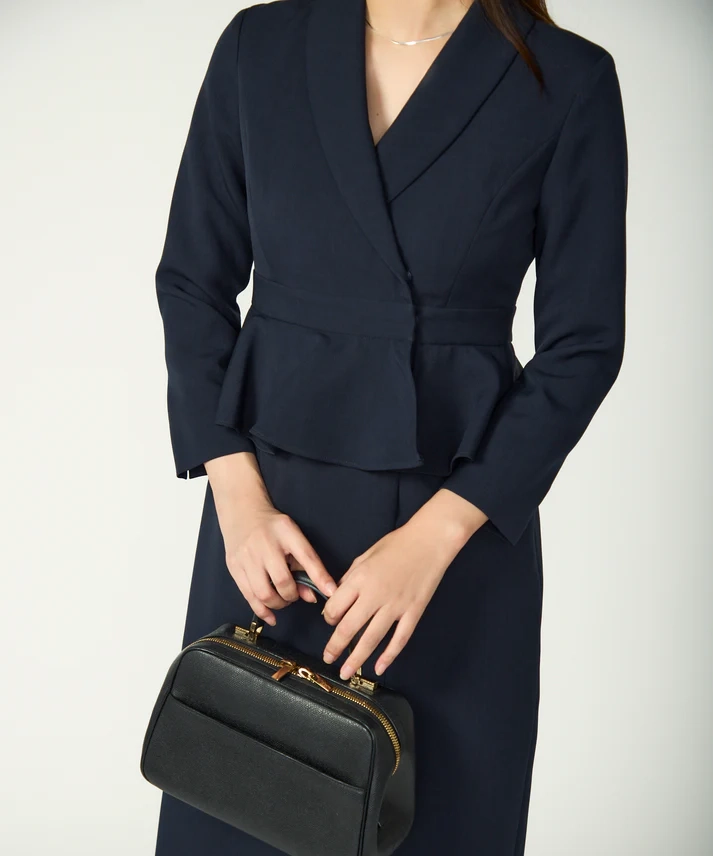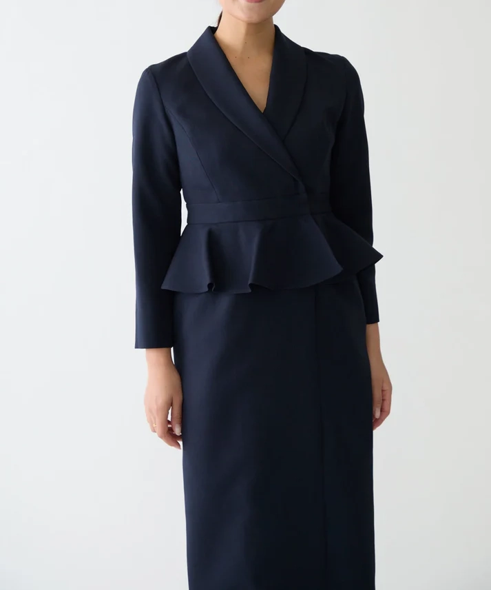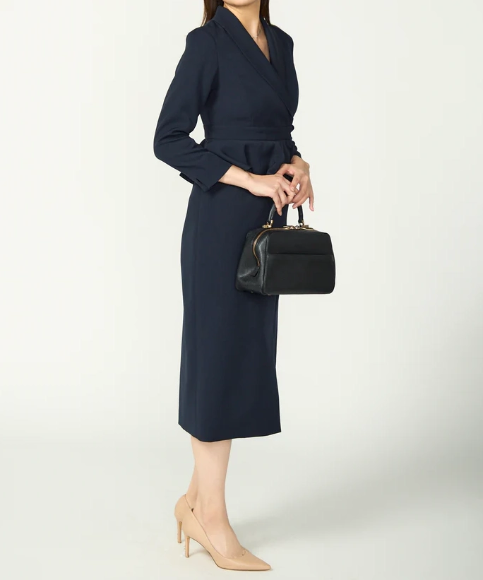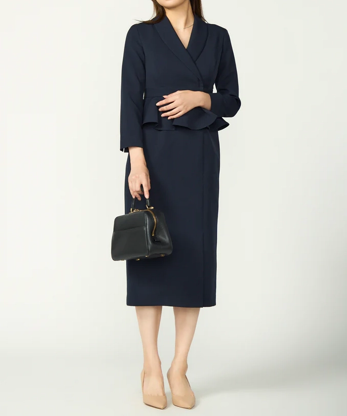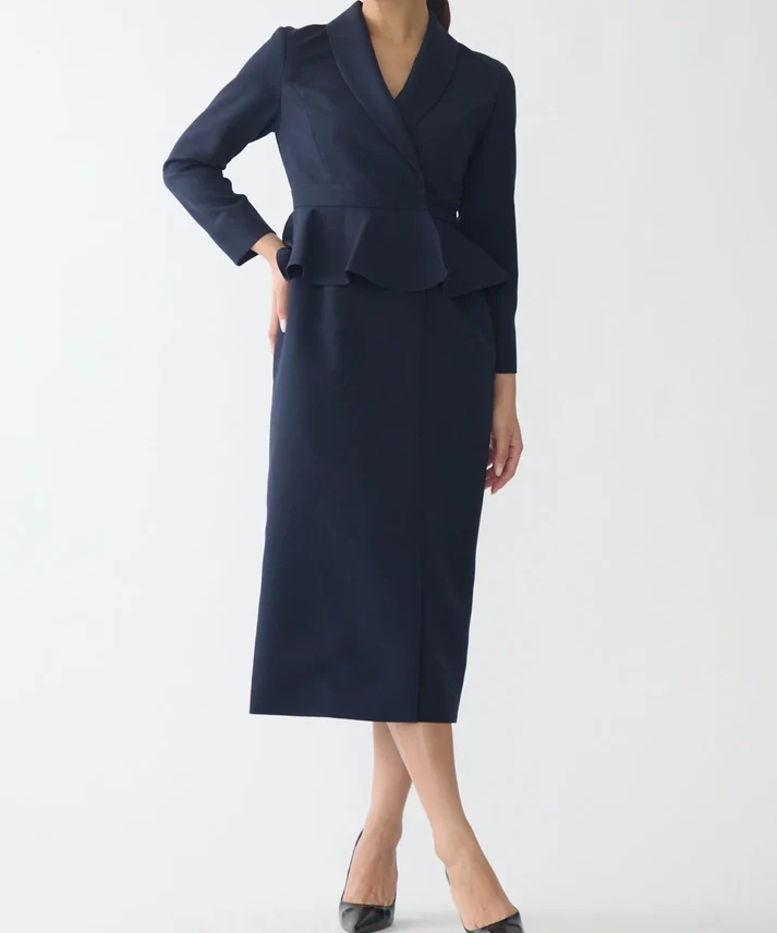 ネイビーは“きちんと感”と上品さがしっかり出るので、結婚式はもちろん、入学式や式典、ホテル会食などフォーマル寄りのシーンにも使いやすいカラーです。ペプラムの立体感でウエスト位置が高く見え、自然にスタイルアップ。セパレート風のデザインなので、程よく抜け感もありつつ、1枚で完成するのが嬉しいポイントです。フロントスリット入りで足さばきが良く、両サイドポケット付きで実用性も◎。