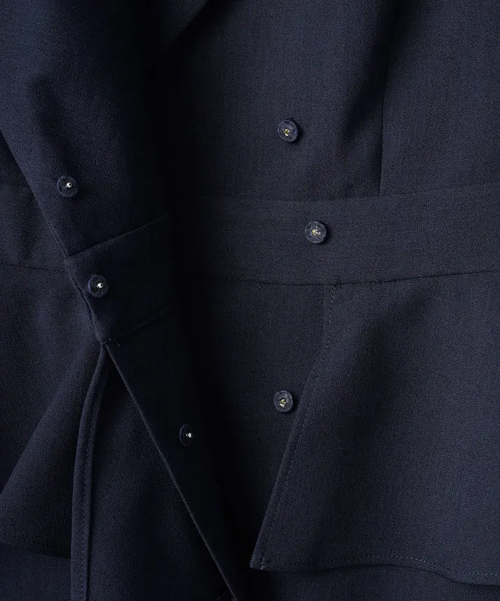 打ち掛け釦とスナップ釦で着脱できる、セパレート見えデザインのペプラムドレスです。しっかりとしたハリコシとシャリ感がありながら、シワになりにくい素材感で、長時間の着用や移動がある日にも安心。両サイドにポケット、スカート前にはスリットを備えています。透け感なし、裏地あり、伸縮性なし。