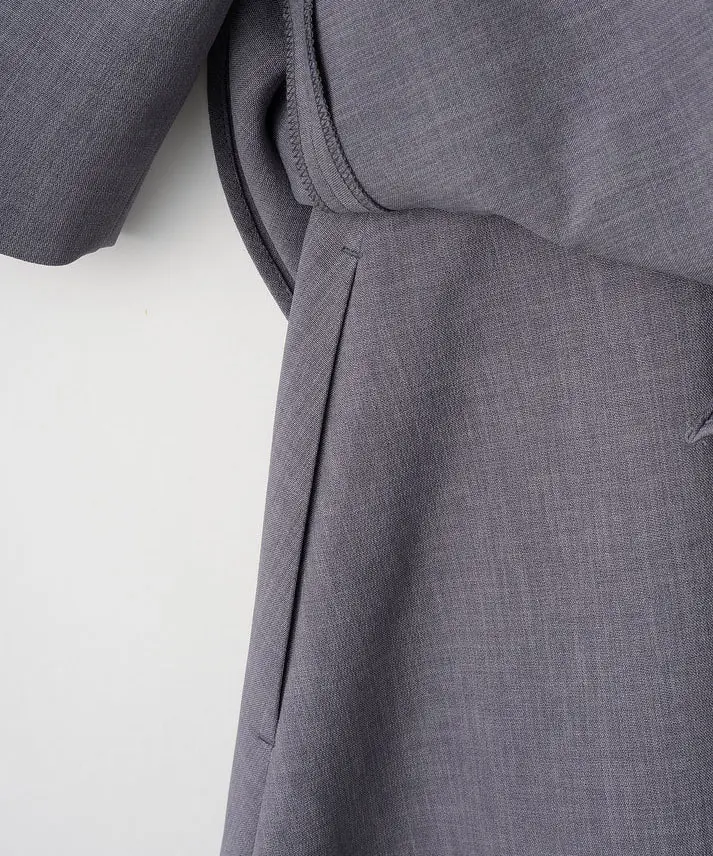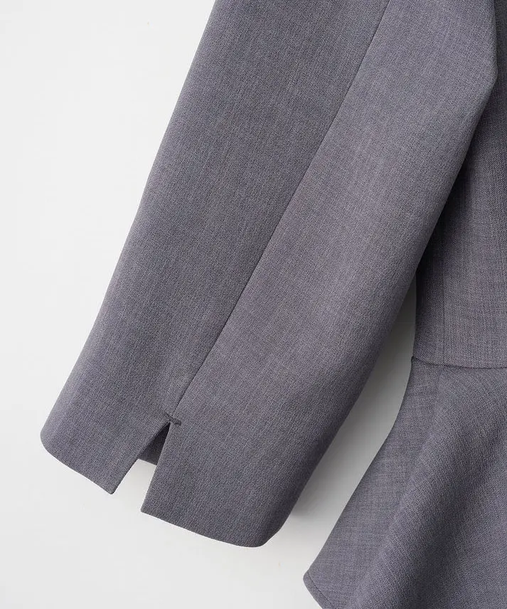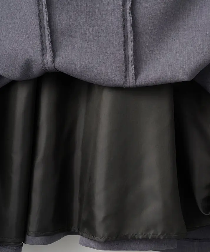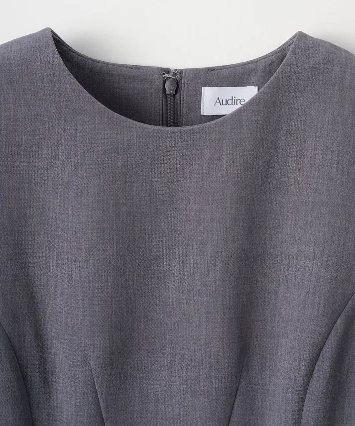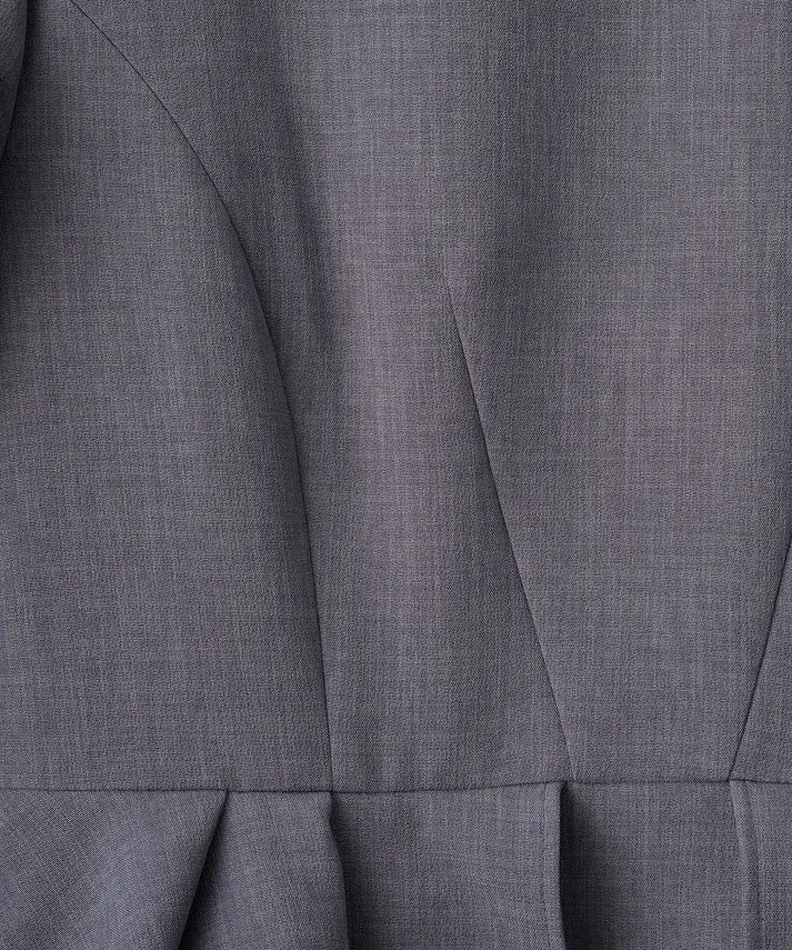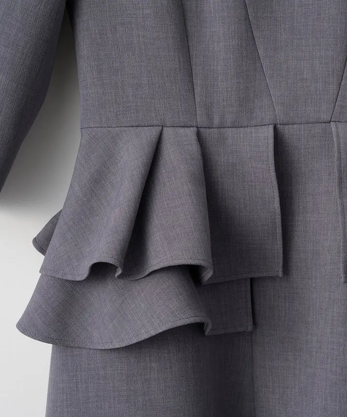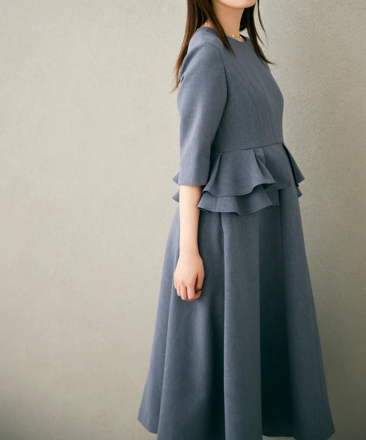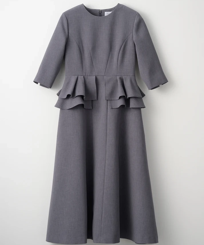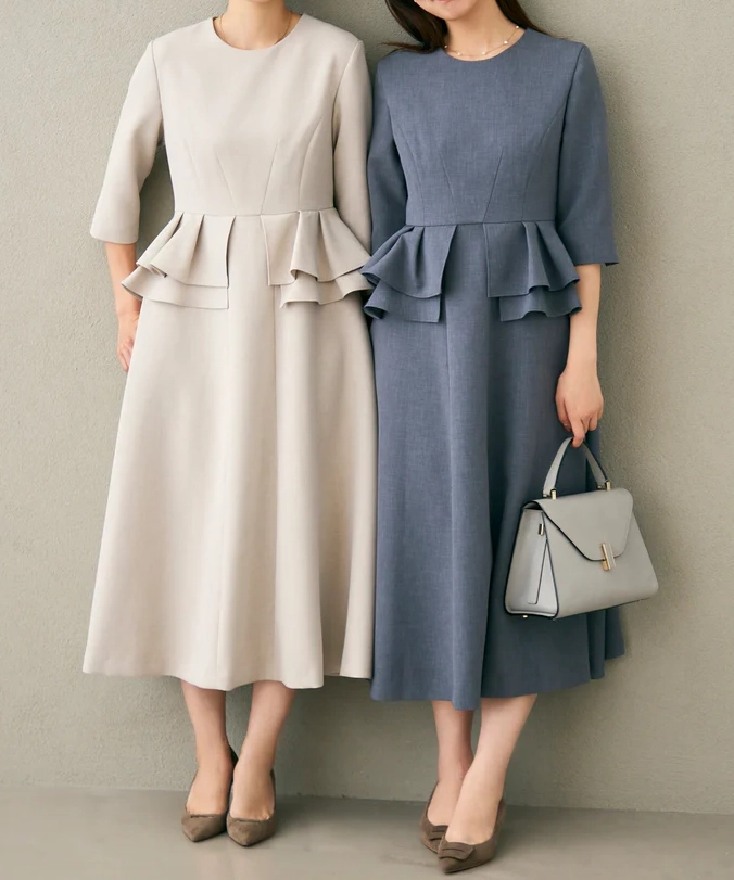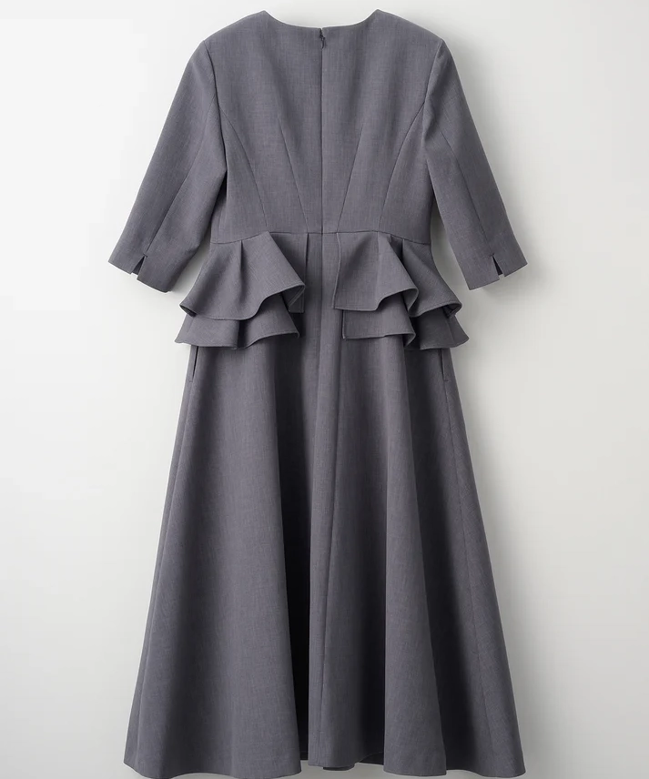 二段に重ねたペプラムがしっかり主役になるのに、グレーの落ち着きで甘さ控えめにまとまる1着です。ハリコシのある生地で立体感がきれいに出るので、ウエスト位置が自然に高く見えてスタイルアップ効果も◎。袖は七分丈で腕まわりがすっきり見え、結婚式や式典、ホテル会食など“きちんと感”が必要なシーンにもおすすめです。スカートはフレア分量たっぷりで動くたびに華やかさが出るので、写真映えも狙えます。