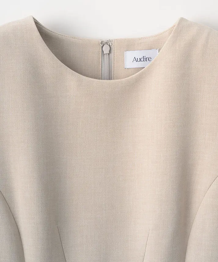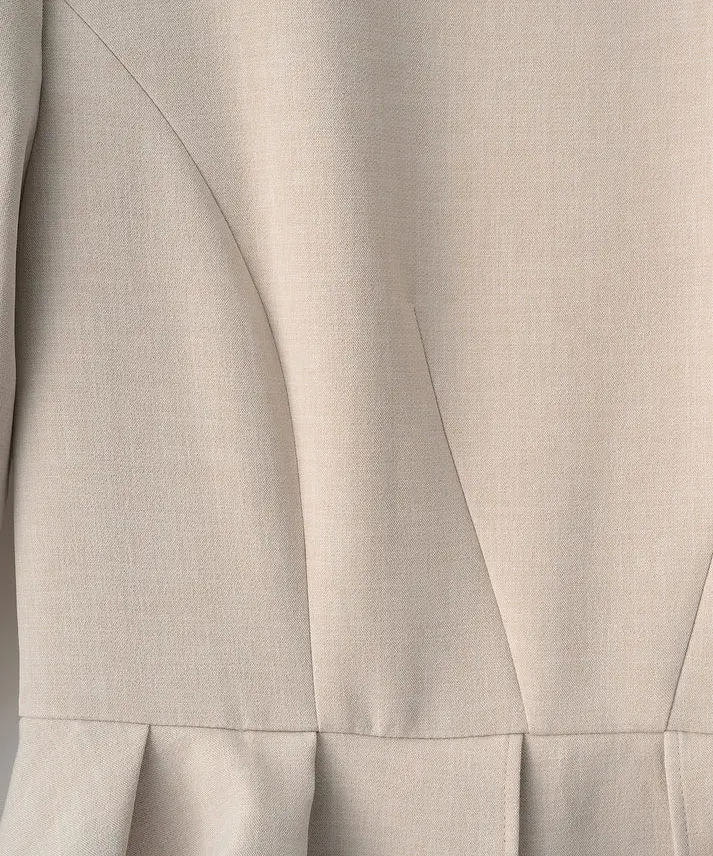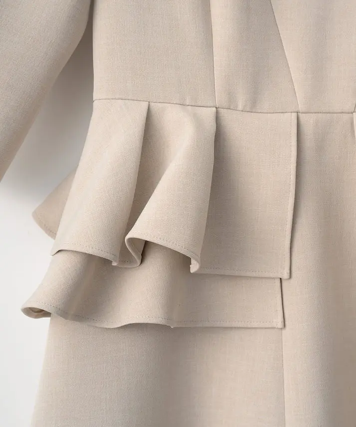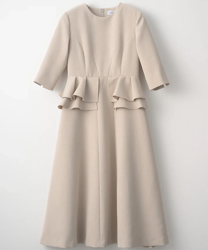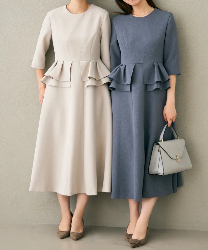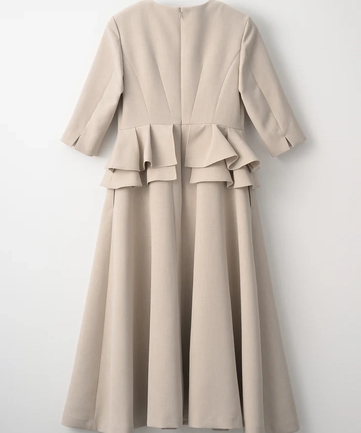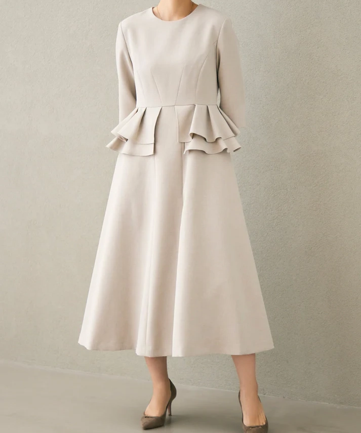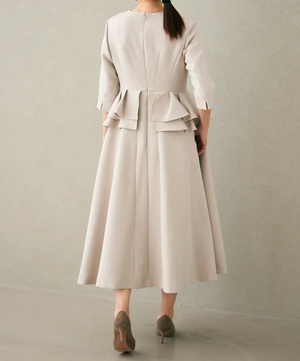 ベージュは肌なじみが良く、やわらかい華やかさが出る万能カラー。二段ペプラムの立体感でウエスト位置が高く見え、きちんと感がありつつも程よくフェミニンにまとまります。七分袖で腕まわりがすっきり見えるので、羽織なしでも上品に決まりやすいのもポイント。結婚式や顔合わせ、式典、ホテル会食など“きれいめ”シーンに幅広くおすすめです。