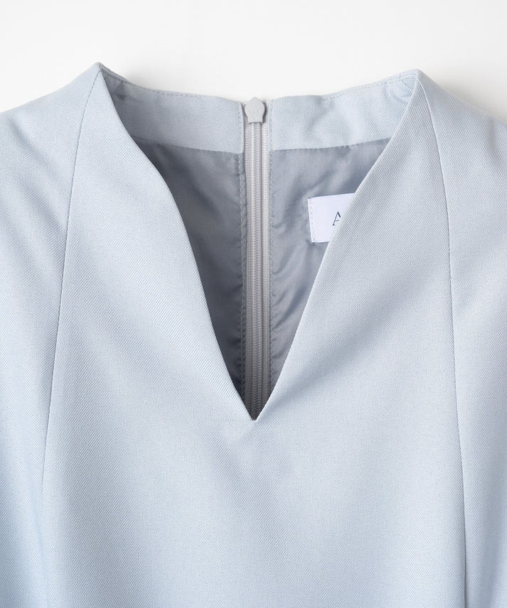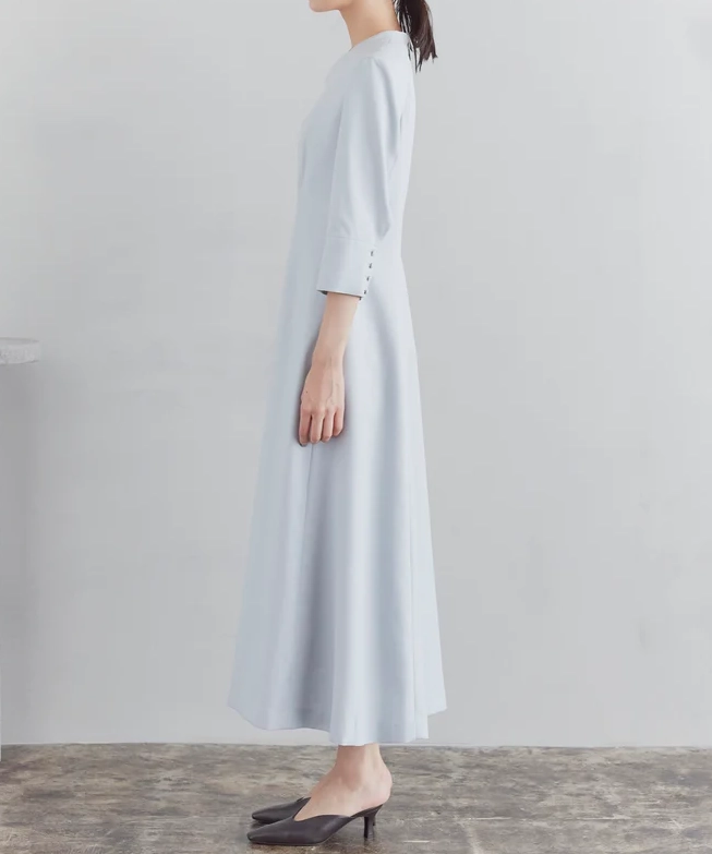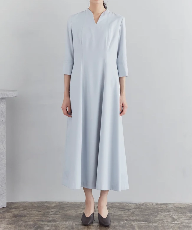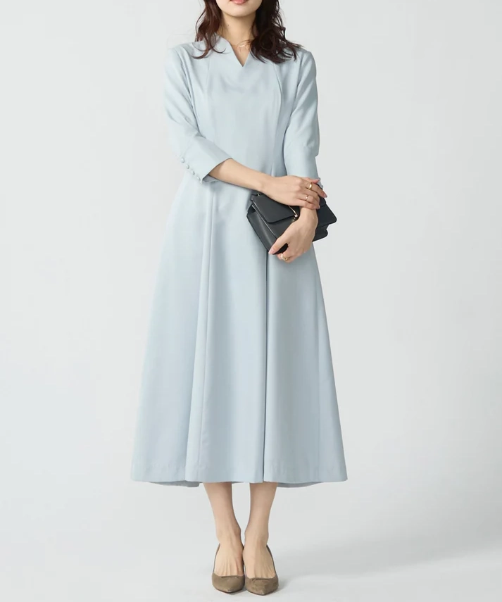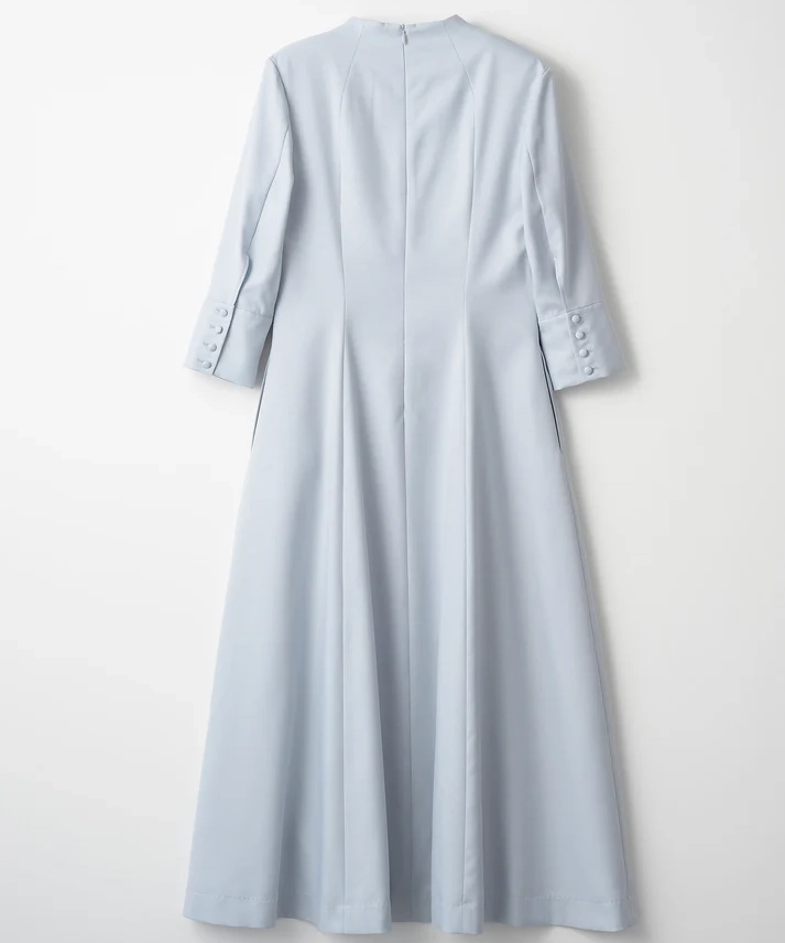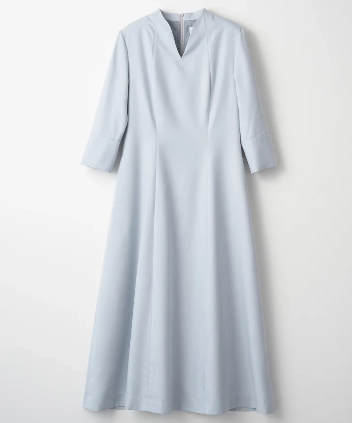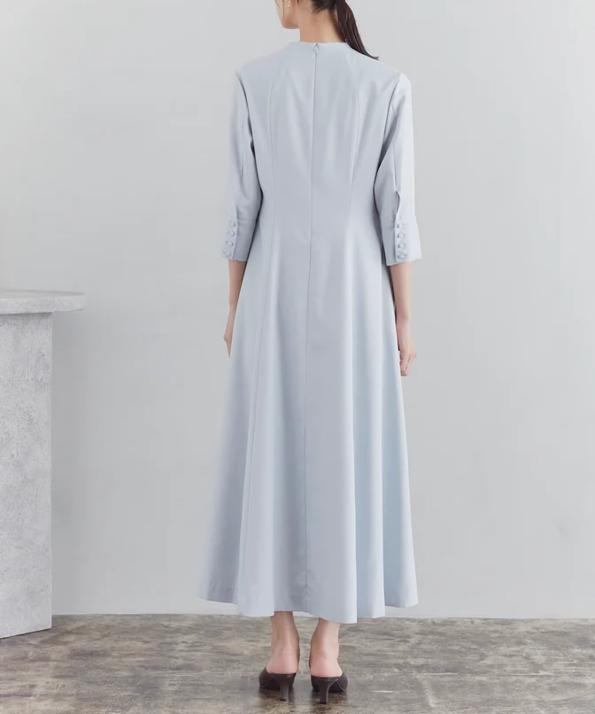 ブルーグレーは、ネイビーほどかっちりしすぎず、それでいて品よく見える“洒落見えカラー”です。ウェービーなネックラインが顔まわりを上品に見せ、派手な装飾がないのに埋もれないのがこのドレスの強み。見た目以上に軽く柔らかな生地で着心地がよく、長時間の式や会食でもストレスが少なめです。背中のコンシールファスナーが大きく開き、足元から着られる仕様なので、ヘアメイク後でも着替えやすいのも嬉しいポイントです。