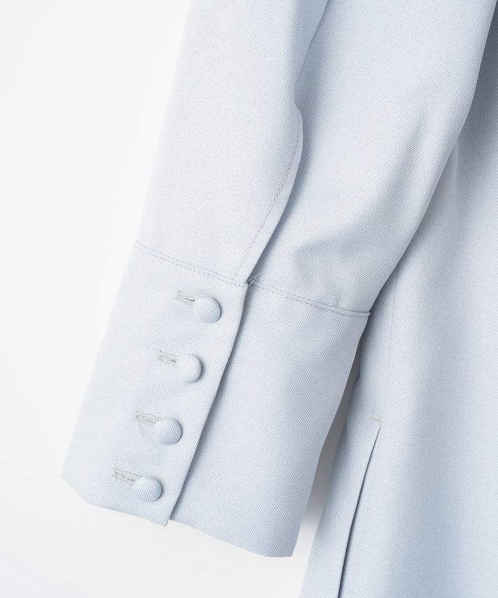 展示会人気NO.1の通称「キャサリンワンピ」。昼でも夜でもシーンを問わず着用できる、上品なフレアシルエットのドレスです。ウェービーな首元がロイヤルな雰囲気を漂わせ、絶妙な開きの襟ぐりでお辞儀のシーンも安心。肘くらいの長さに調整した袖と、さりげないくるみボタンが“洗練された好感度”を演出します。着脱は背中のコンシールファスナーで、ファスナーが大きく開くため足元から着用でき、メイクやヘアセット後でもスムーズにお着替えできます。