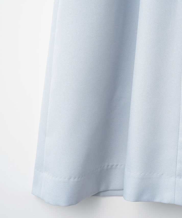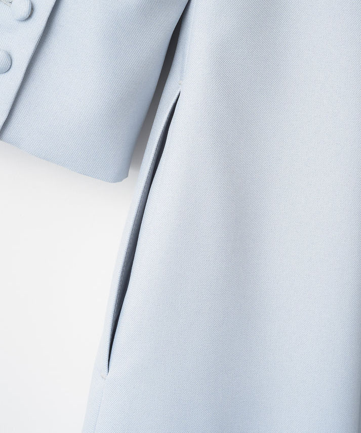 ブルーグレーは、ネイビーほどかっちりしすぎず、それでいて品よく見える“洒落見えカラー”です。ウェービーなネックラインが顔まわりを上品に見せ、派手な装飾がないのに埋もれないのがこのドレスの強み。見た目以上に軽く柔らかな生地で着心地がよく、長時間の式や会食でもストレスが少なめです。背中のコンシールファスナーが大きく開き、足元から着られる仕様なので、ヘアメイク後でも着替えやすいのも嬉しいポイントです。