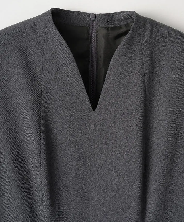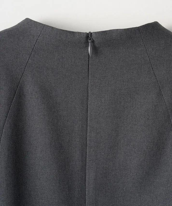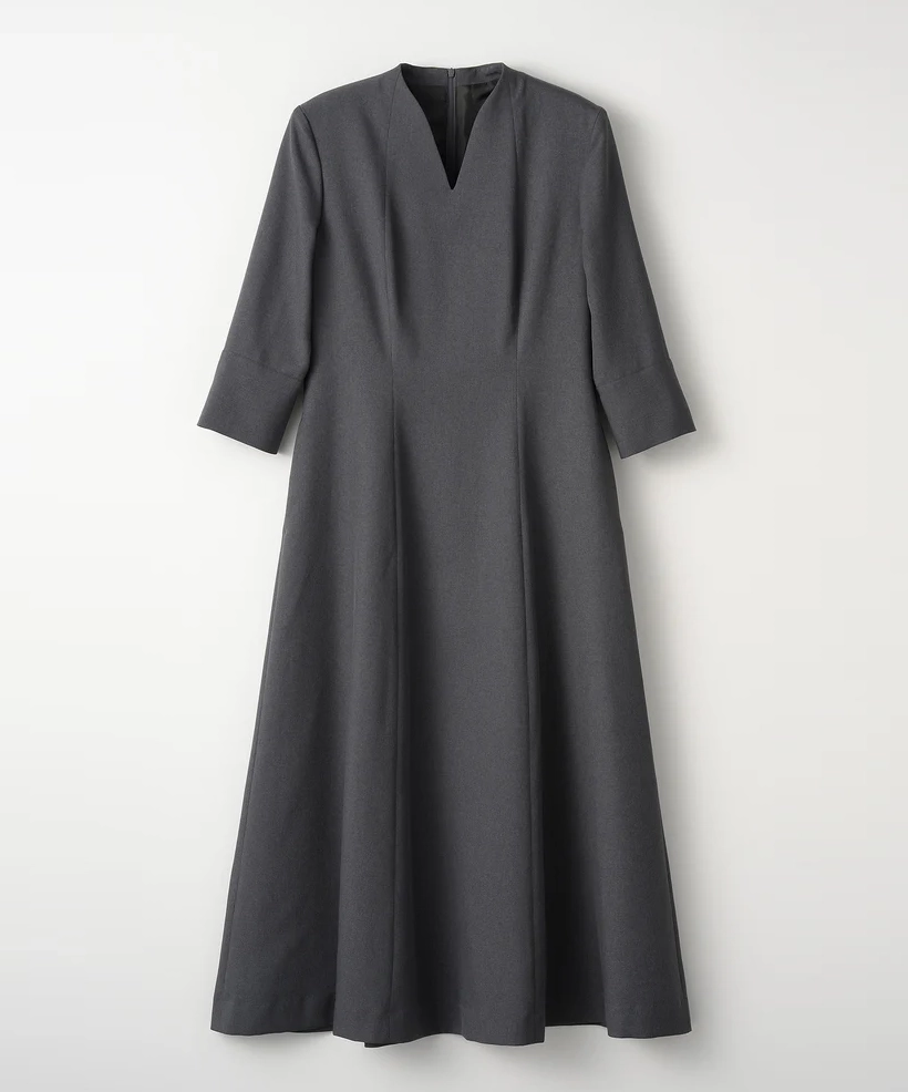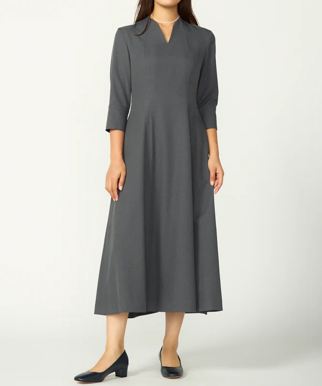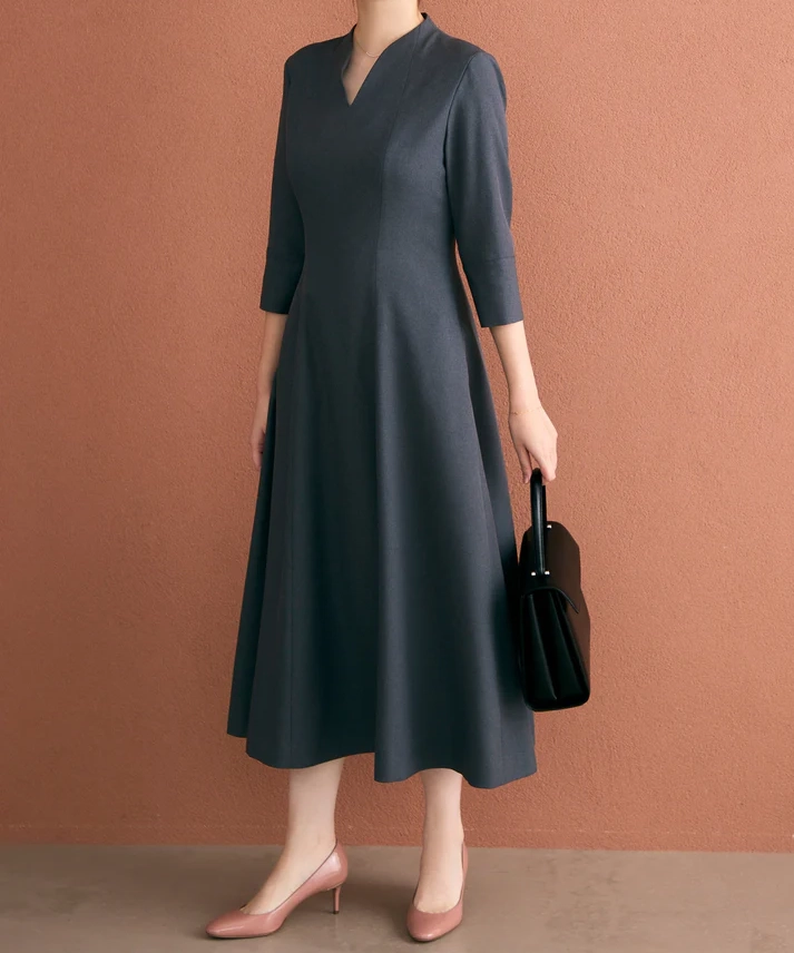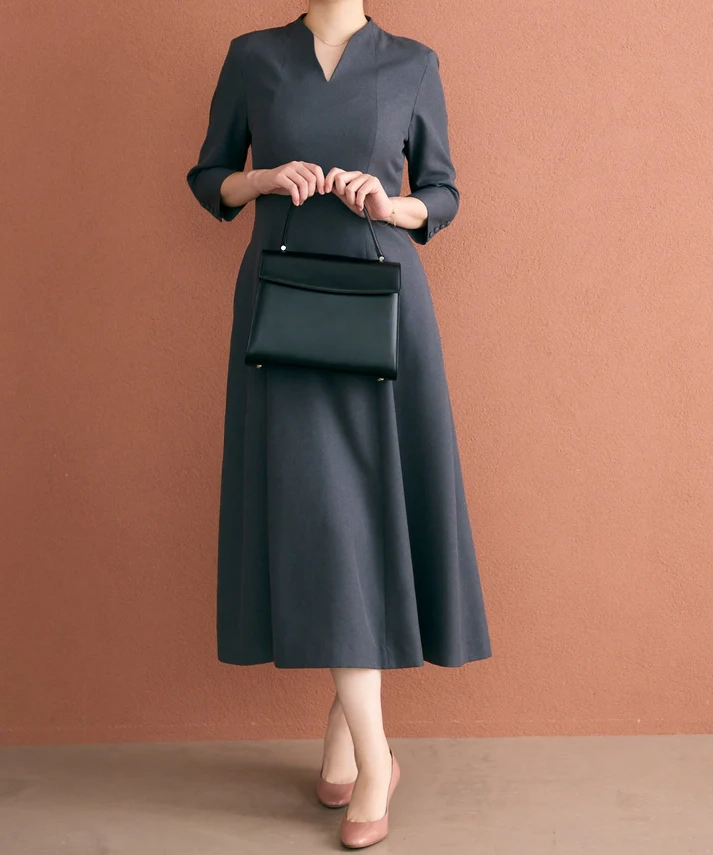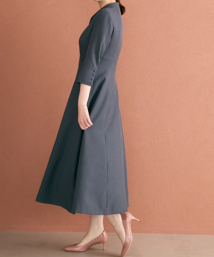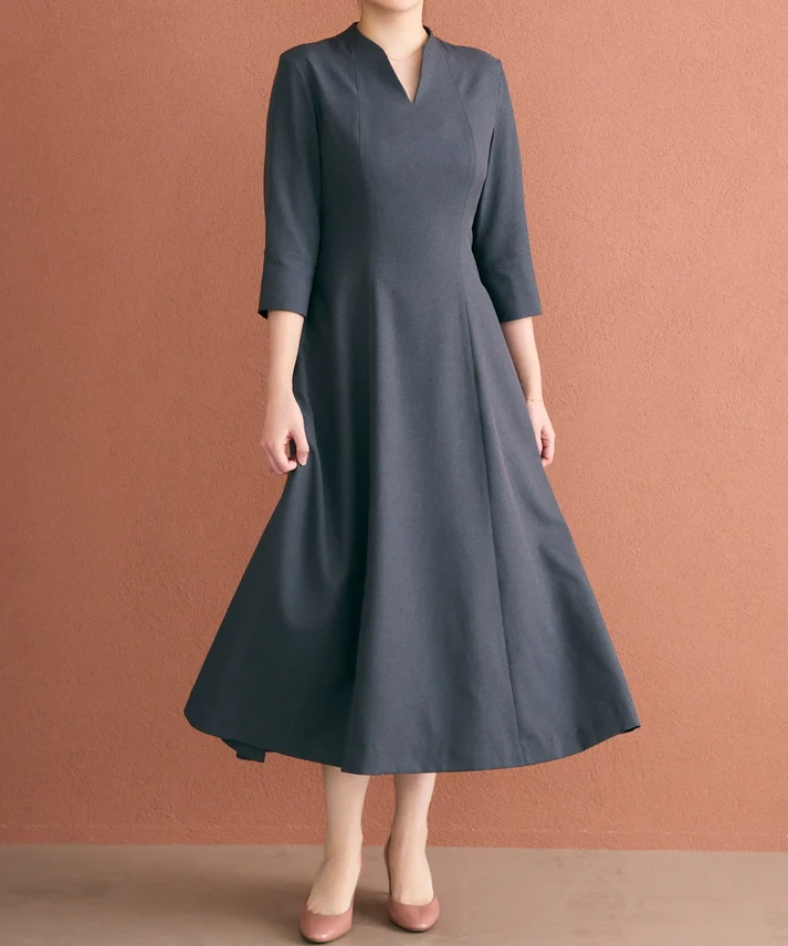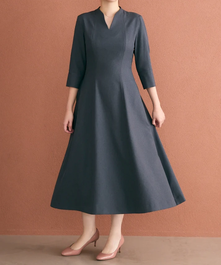 ブルーグレーは、ネイビーほどかっちりしすぎず、それでいて品よく見える“洒落見えカラー”です。ウェービーなネックラインが顔まわりを上品に見せ、派手な装飾がないのに埋もれないのがこのドレスの強み。見た目以上に軽く柔らかな生地で着心地がよく、長時間の式や会食でもストレスが少なめです。背中のコンシールファスナーが大きく開き、足元から着られる仕様なので、ヘアメイク後でも着替えやすいのも嬉しいポイントです。