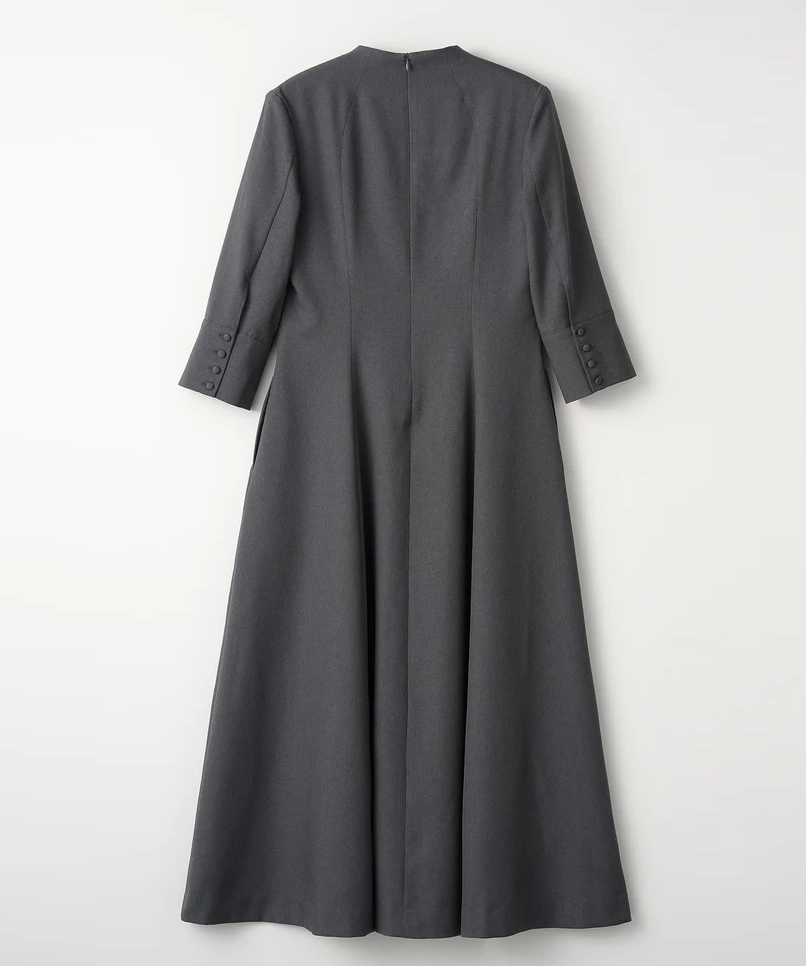 展示会人気NO.1の通称「キャサリンワンピ」。昼でも夜でもシーンを問わず着用できる、上品なフレアシルエットのドレスです。ウェービーな首元がロイヤルな雰囲気を漂わせ、絶妙な開きの襟ぐりでお辞儀のシーンも安心。肘くらいの長さに調整した袖と、さりげないくるみボタンが“洗練された好感度”を演出します。着脱は背中のコンシールファスナーで、ファスナーが大きく開くため足元から着用でき、メイクやヘアセット後でもスムーズにお着替えできます。